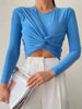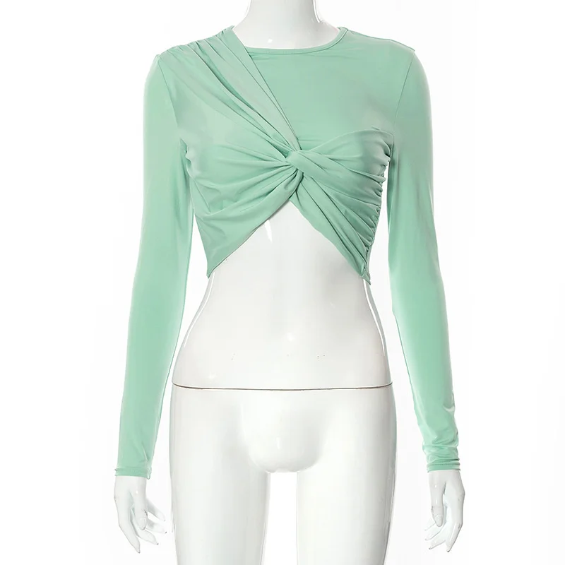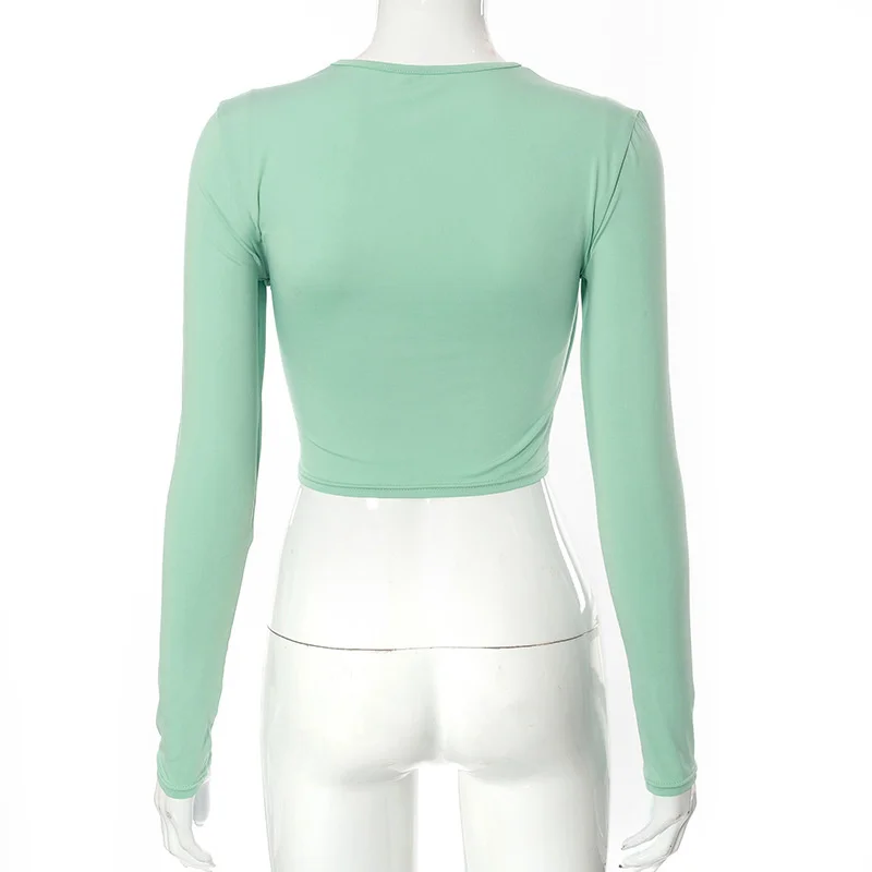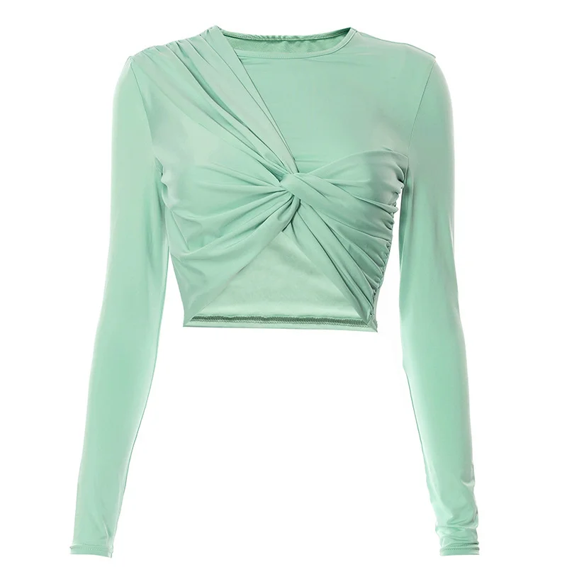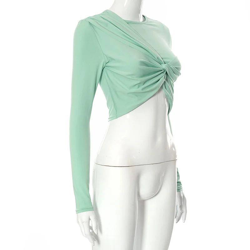 victoria’s vogue Solid Round Neck Knotted T Shirts Autumn Elegant Fashion Female Crop Tops Sexy Casual Long Sleeve Slim Skinny Tee Shirts