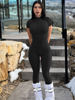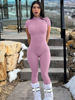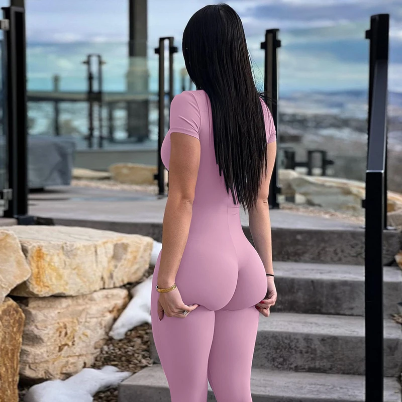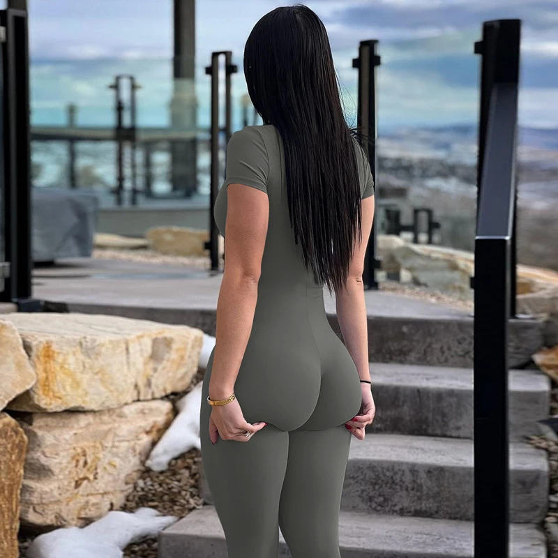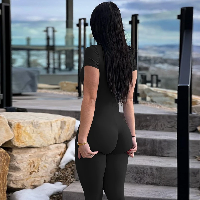 Victoria’s Vogue Solid Turtleneck Short Sleeve Zip Up Sexy Bodycon One Piece Jumpsuit Summer Women Fashion Romper Yoga Vacation Overalls