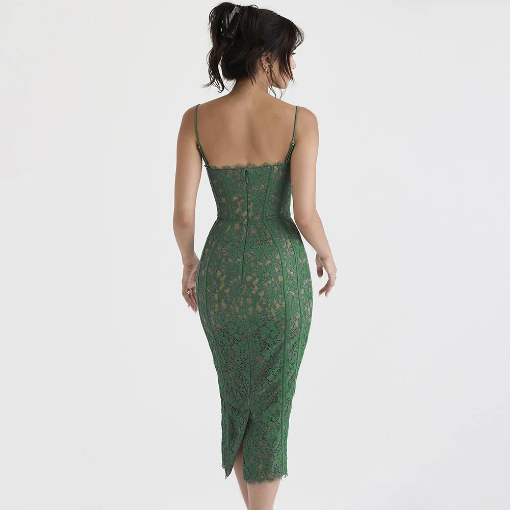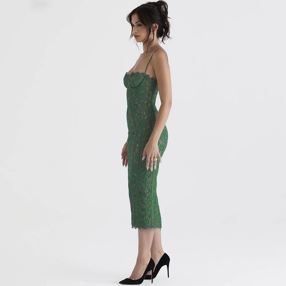 Victoria’s vogue Spaghetti Strap Lace Sexy Midi Dress For Women Gown Green Sleeveless Backless Club Party Printed Long Dress Vestidos