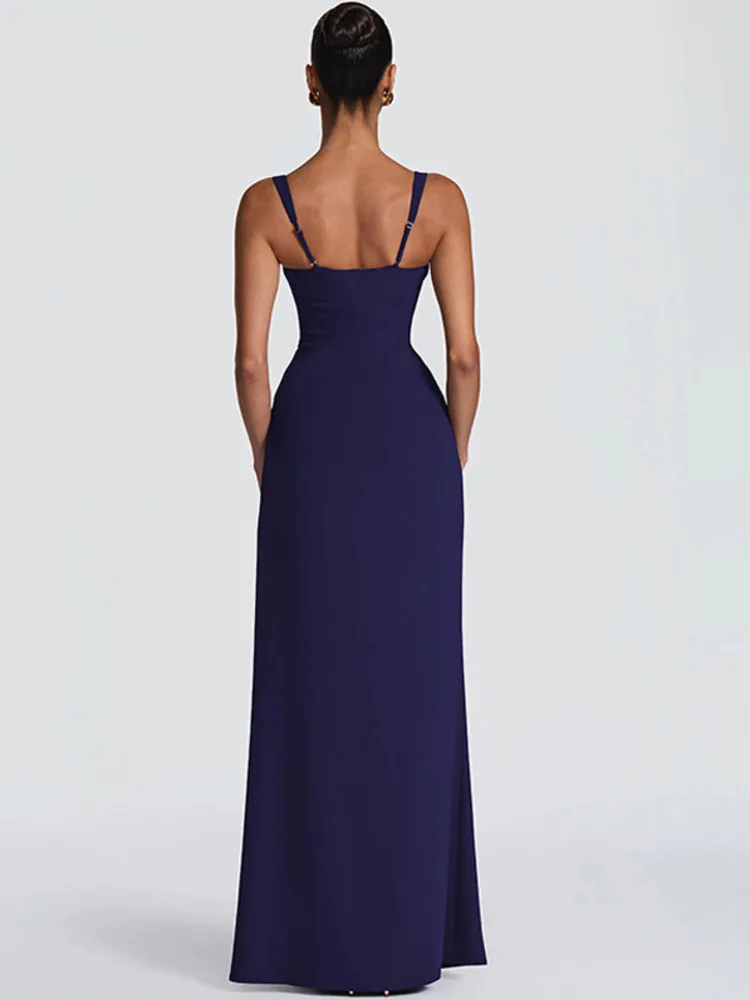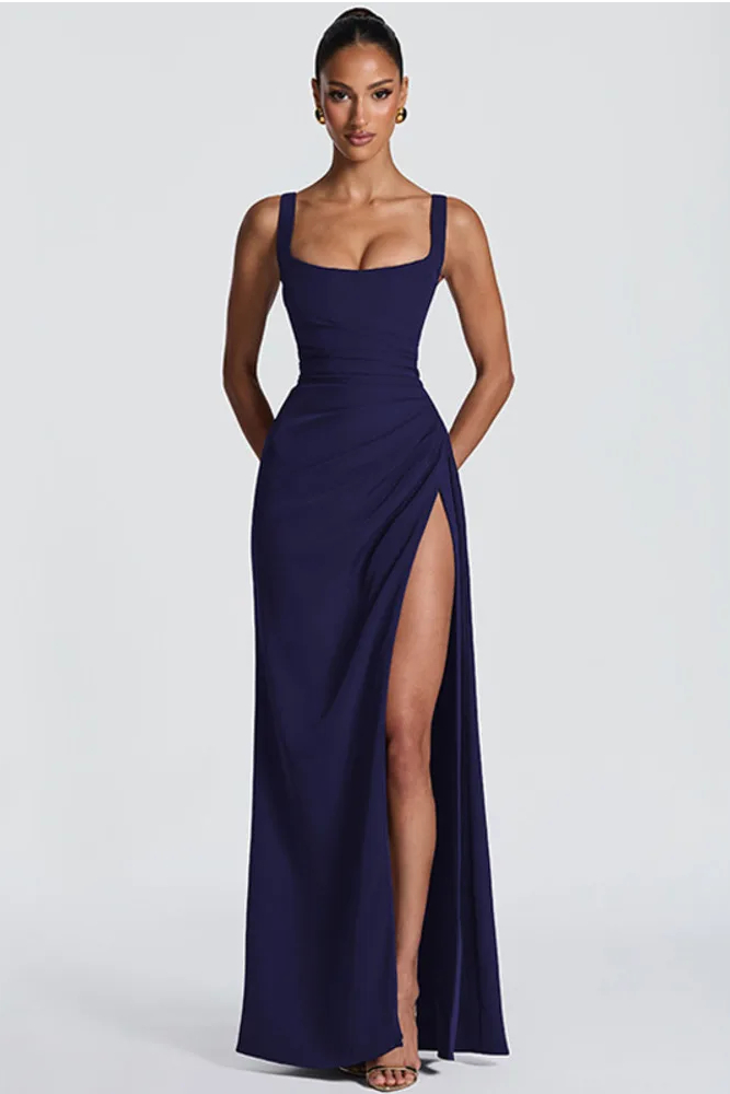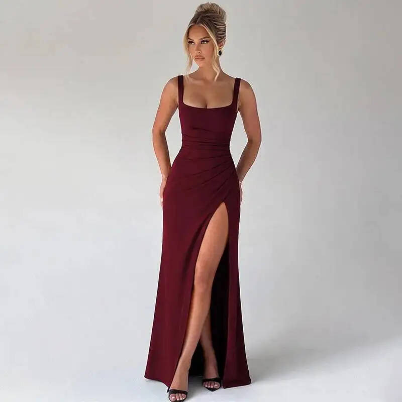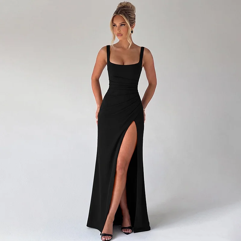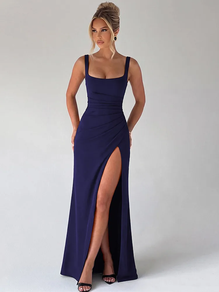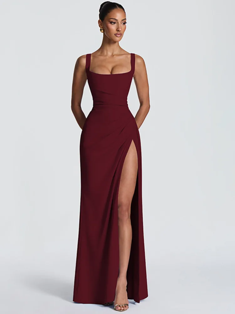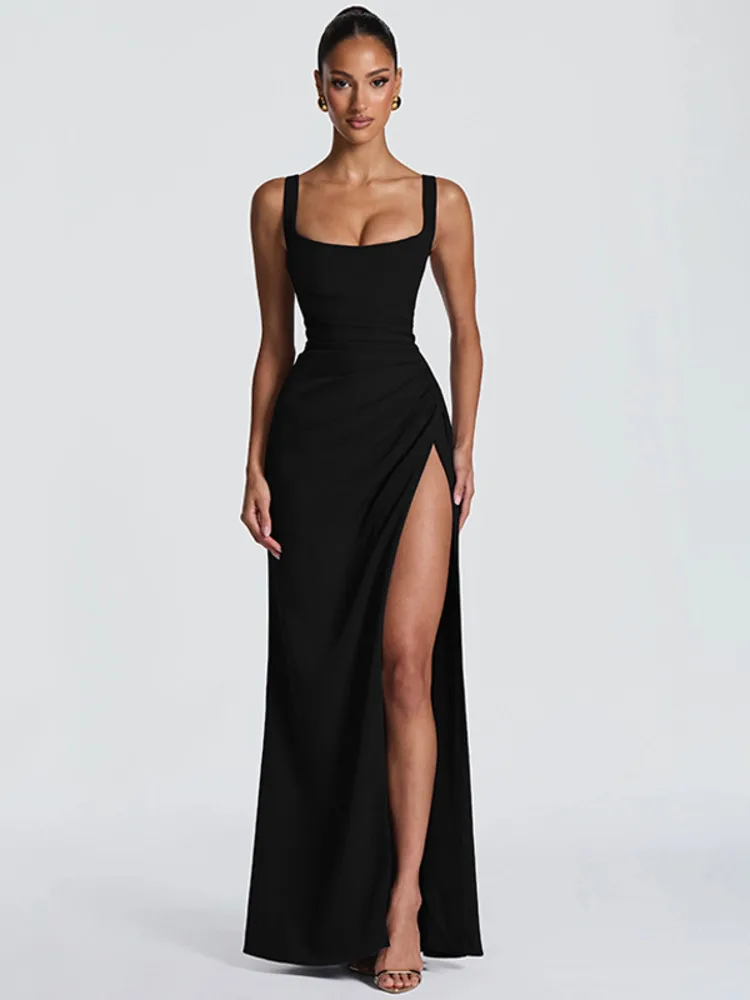 Victoria’s Vogue Square Collar Backless Sexy Maxi Dress Women Elegant Spaghetti Strap Sleeveless High Split Bodycon Club Party Dress