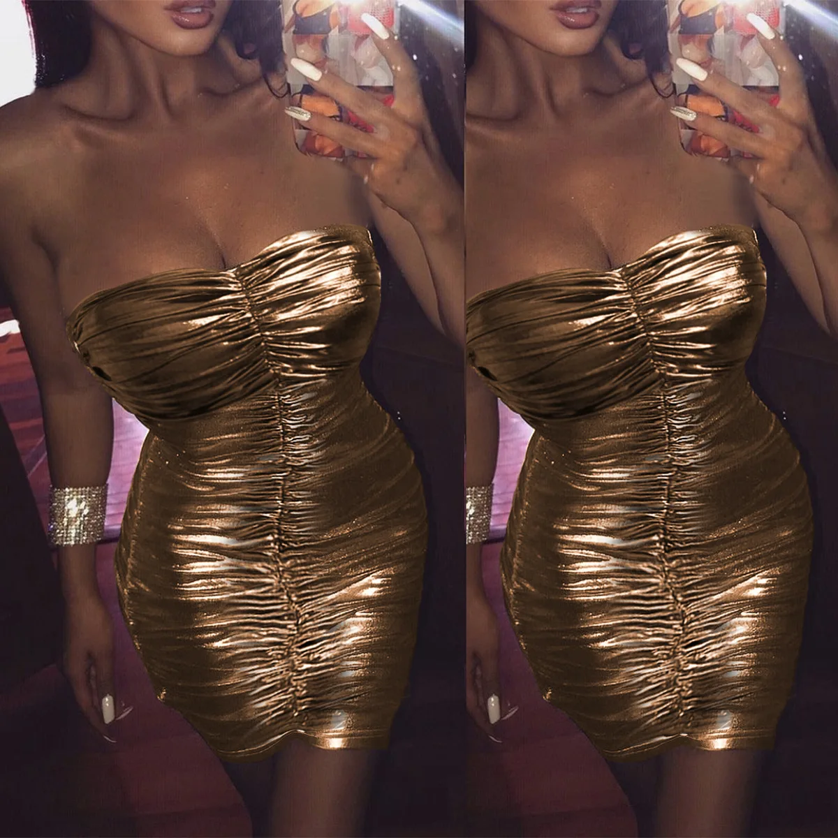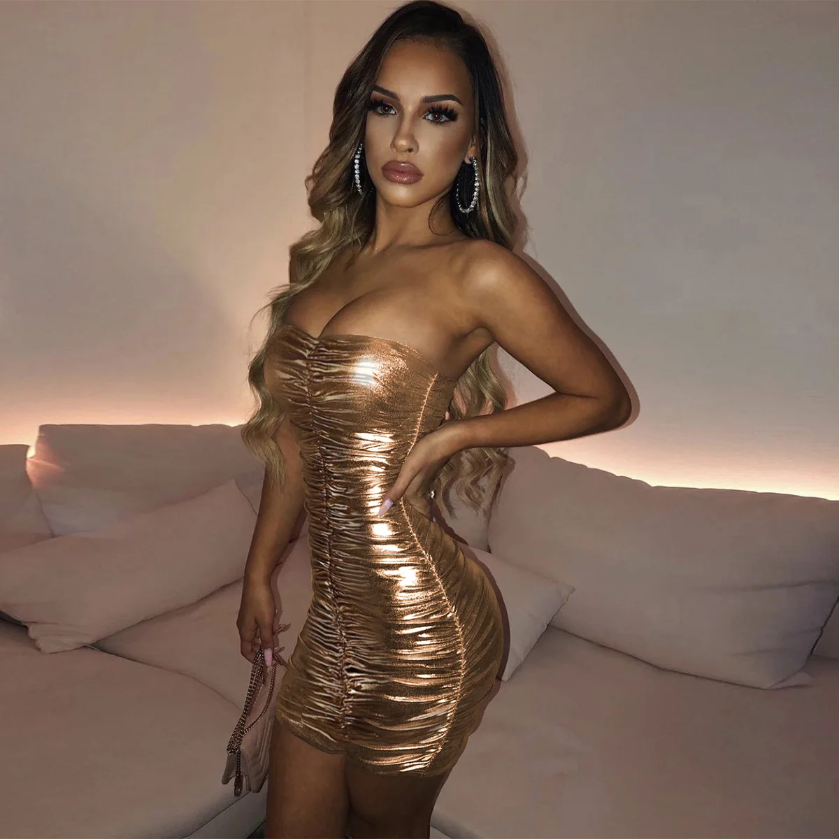 victoria’s vogue Strapless Bronzing Gold Mini Dress For Women Summer Sexy Backless Ruched Vestidos Sleeve Bodycon Nightclub Party Dress