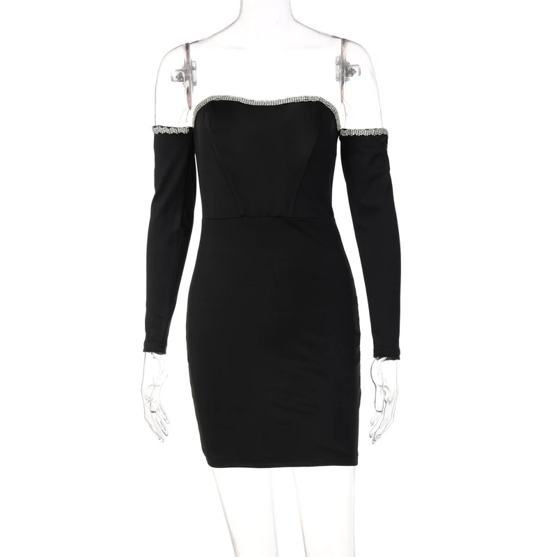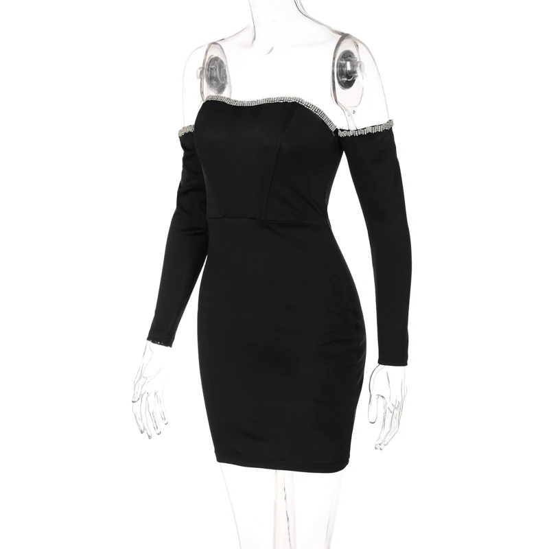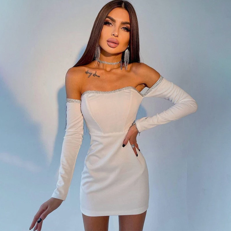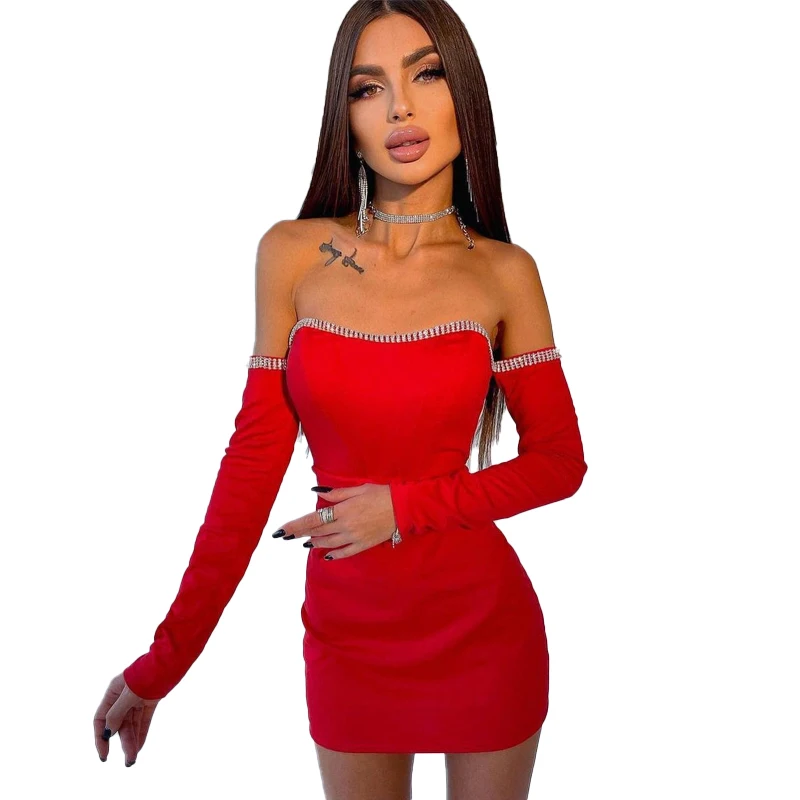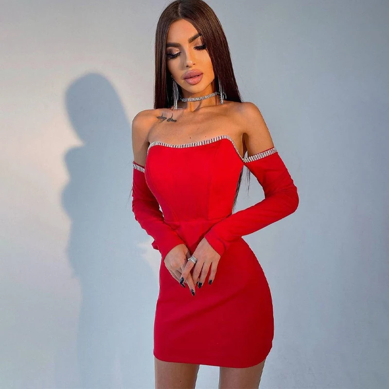 victoria’s vogue Strapless Tube Off Shoulder Long Sleeve Diamond Edging Bodycon Slim Sexy Mini Dress 2022 Fall Women Christmas Party Y2K