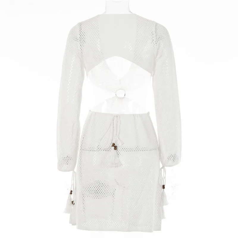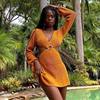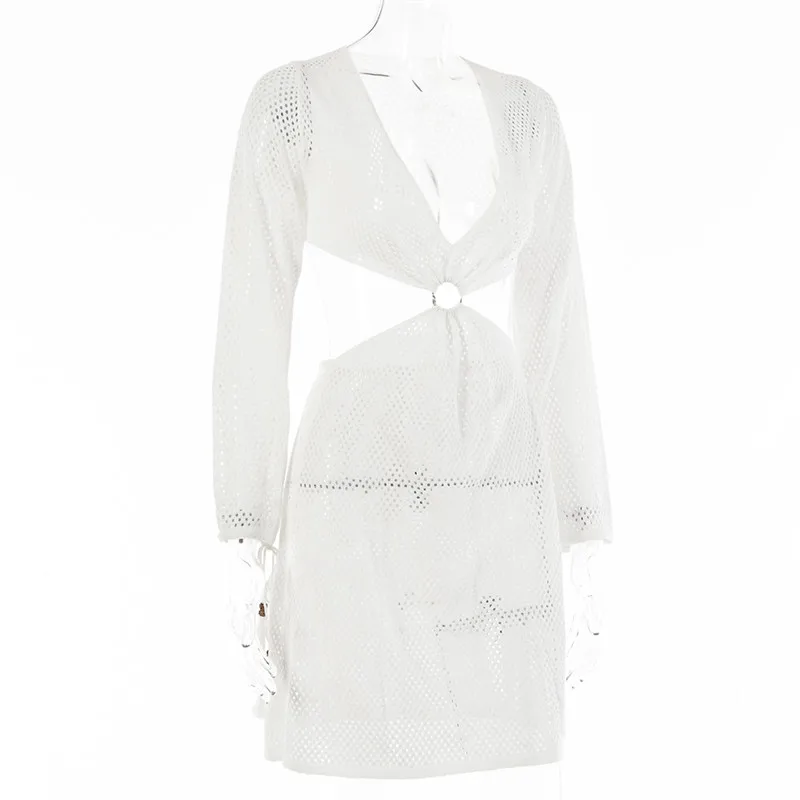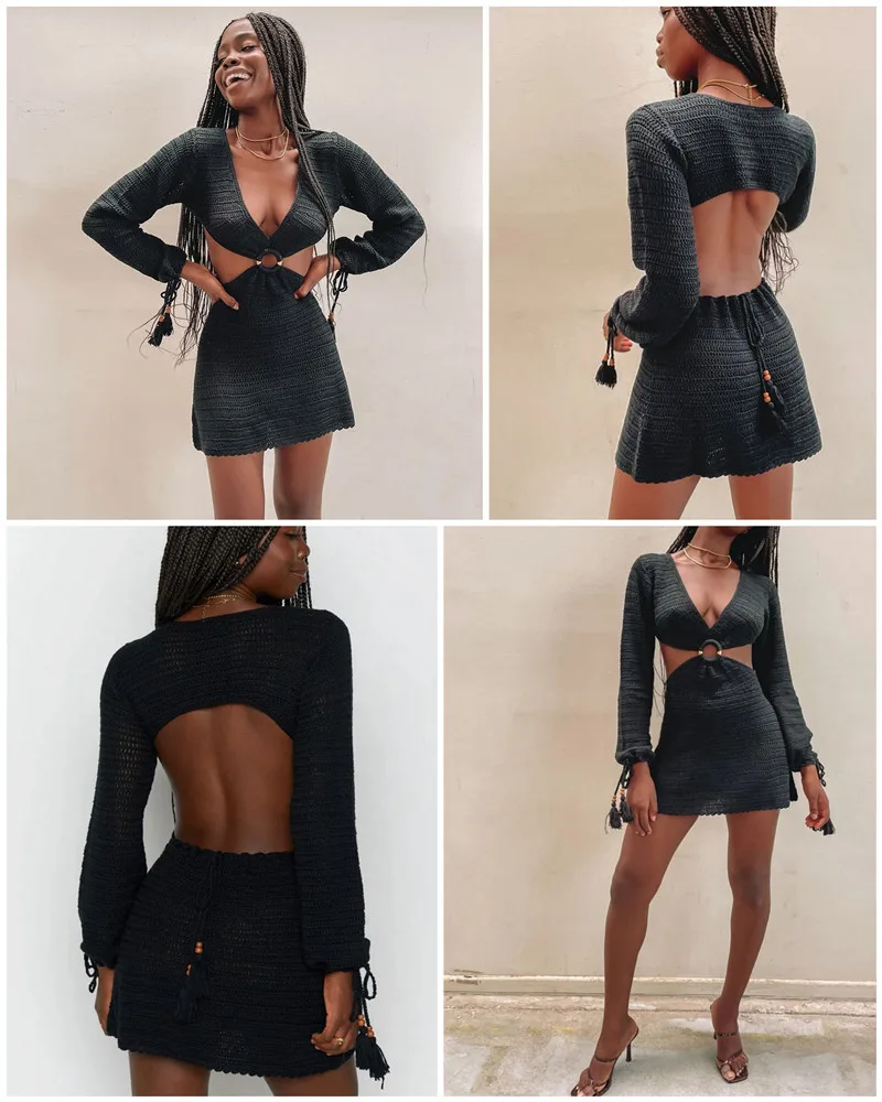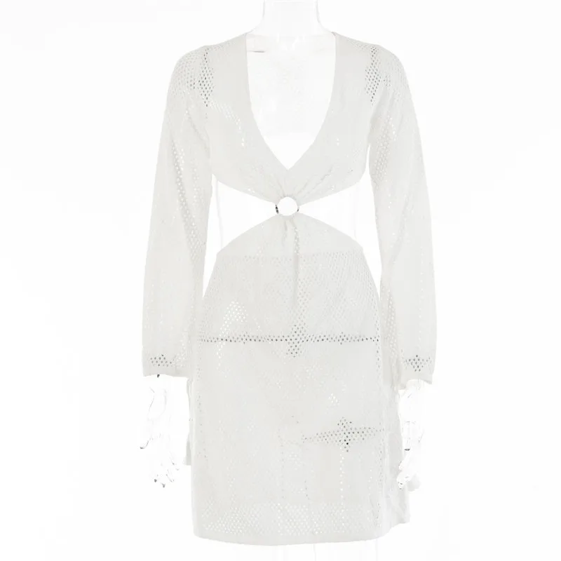 victoria’s vogue Summer Knitted Long Sleeve Beach Dress Women Sexy Backless Hollow Out V Neck Party Mini Casual Dresses