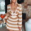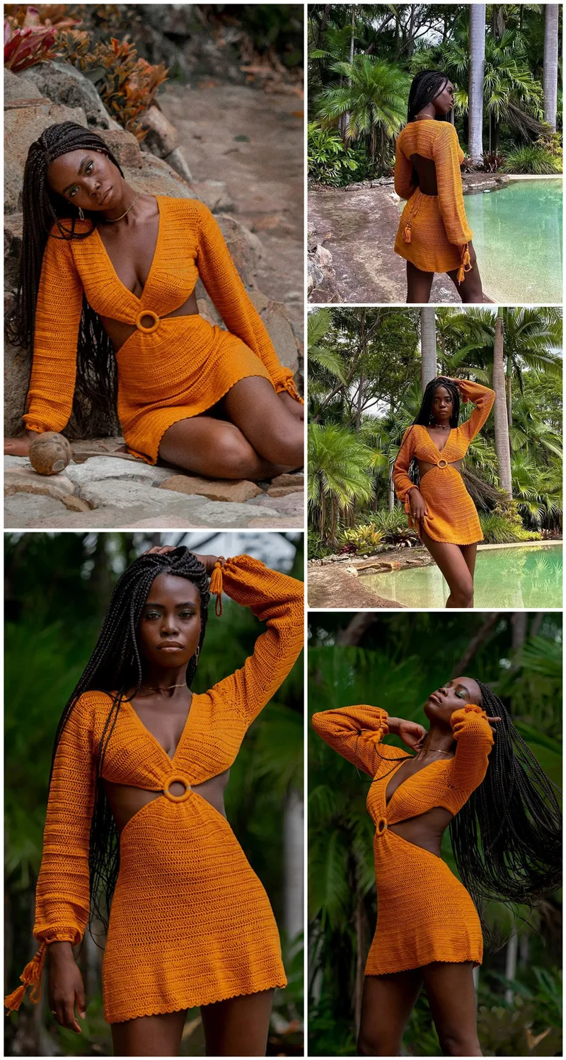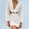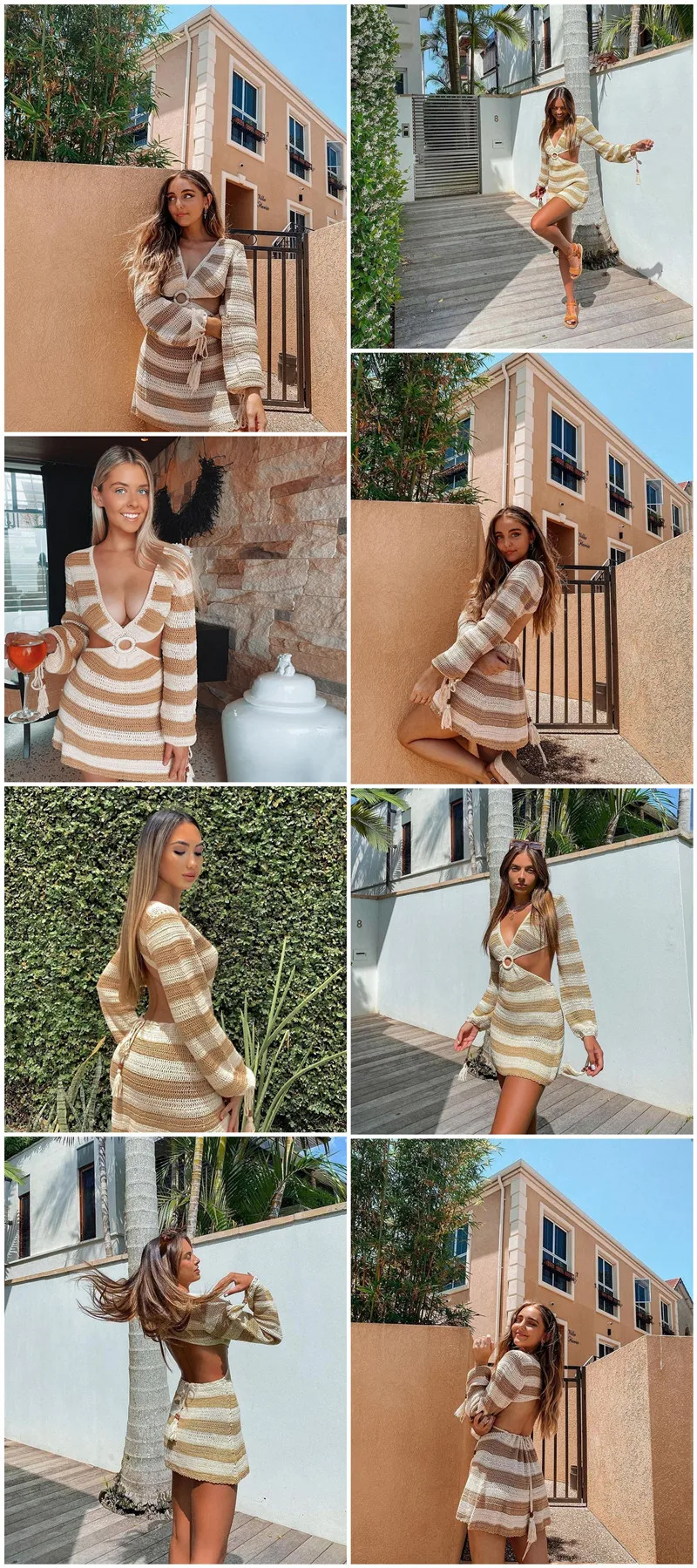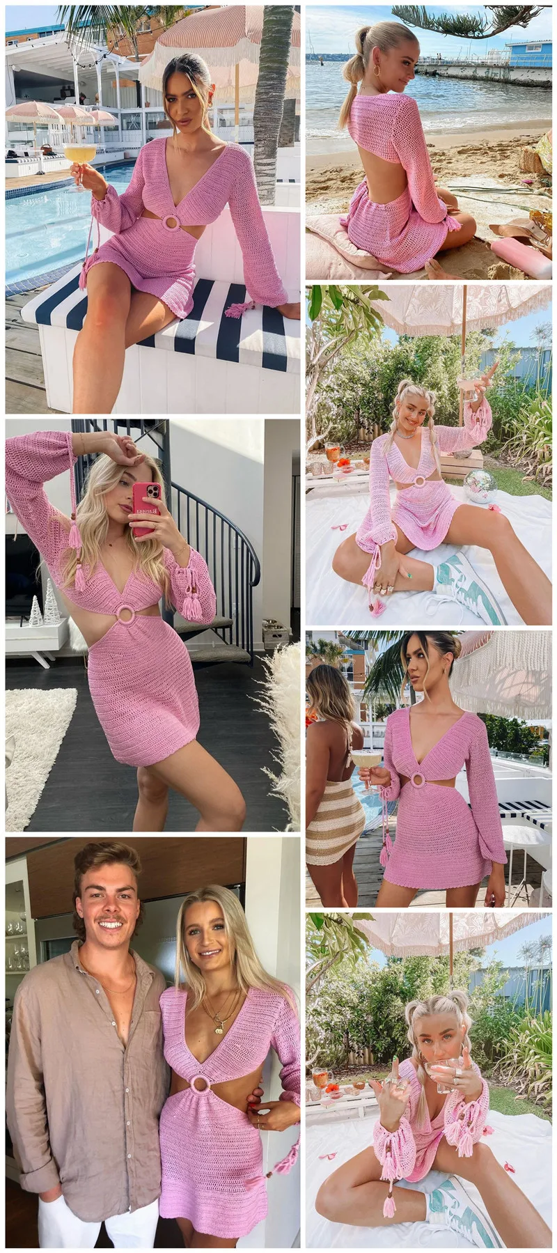 victoria’s vogue Summer Knitted Long Sleeve Beach Dress Women Sexy Backless Hollow Out V Neck Party Mini Casual Dresses