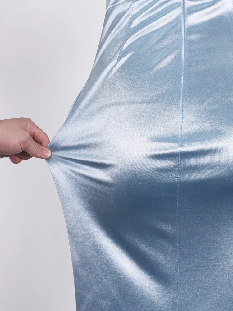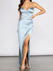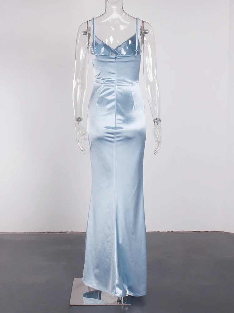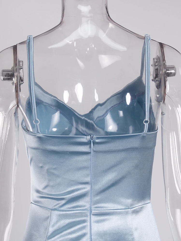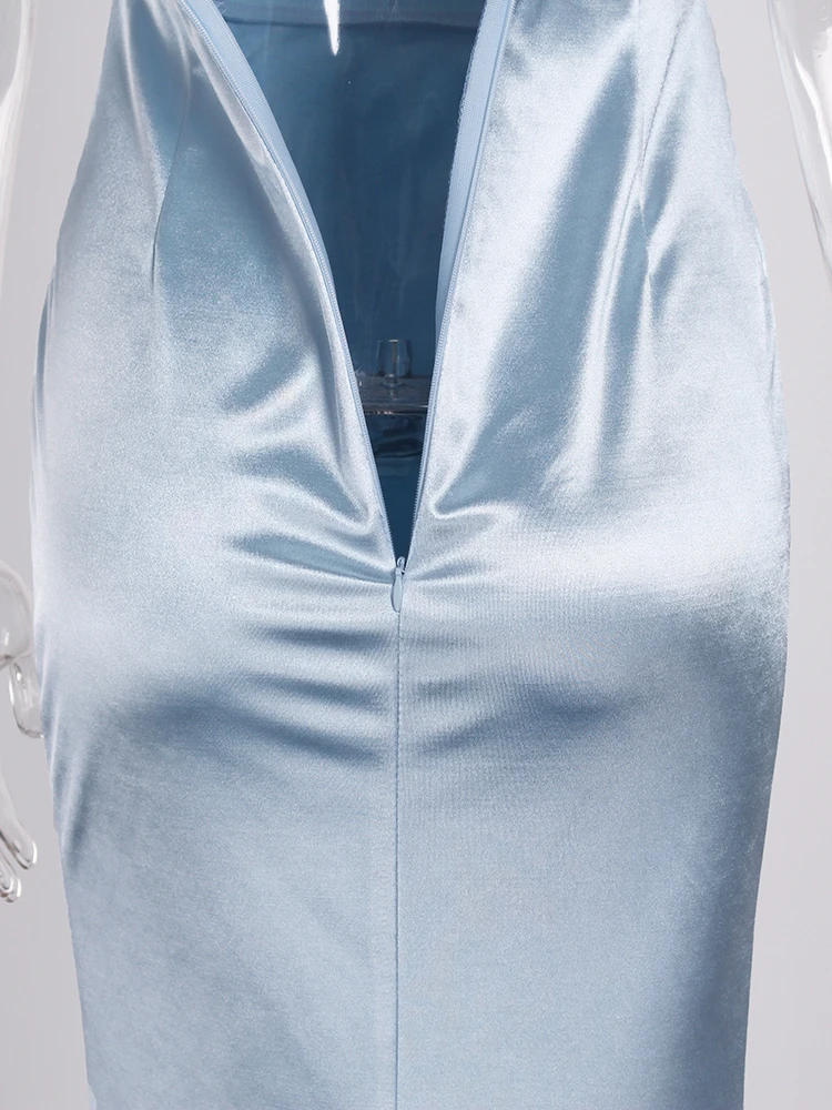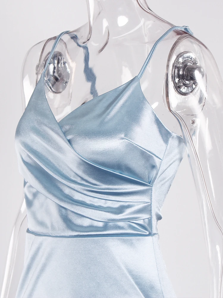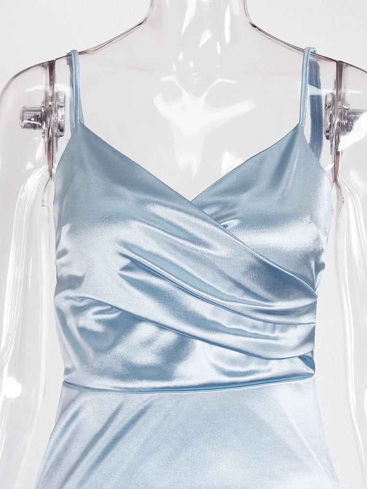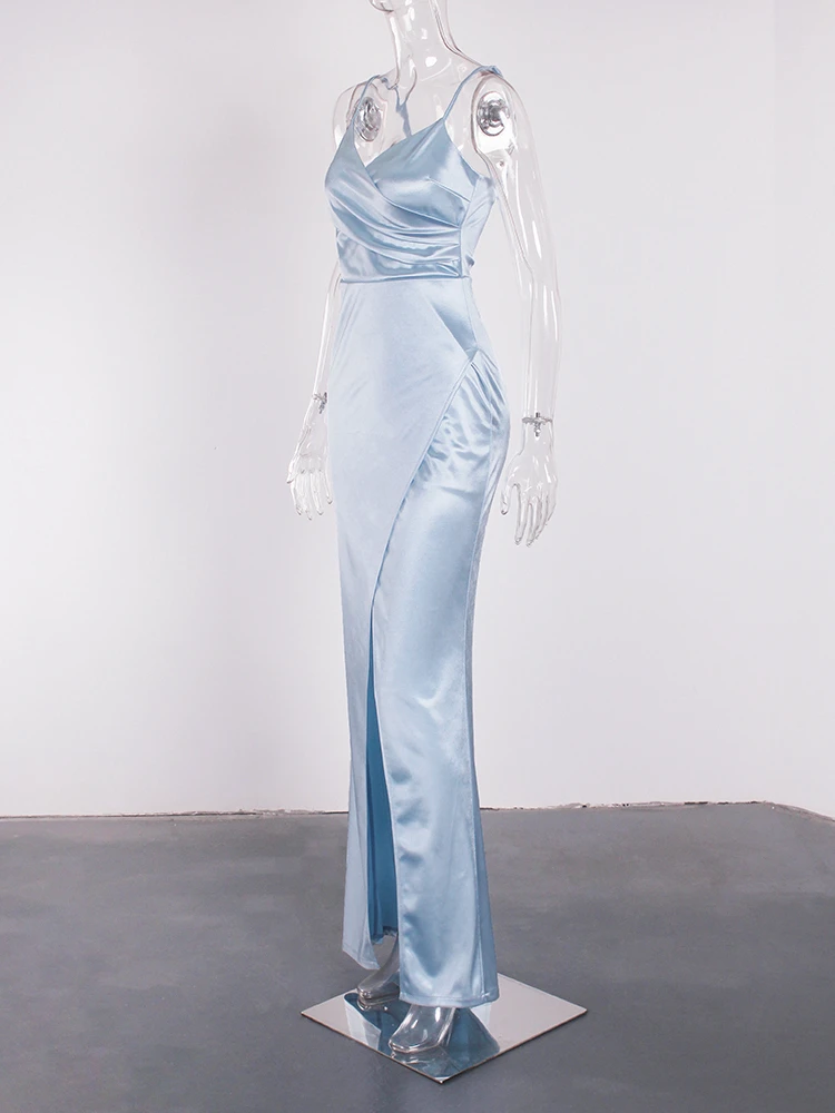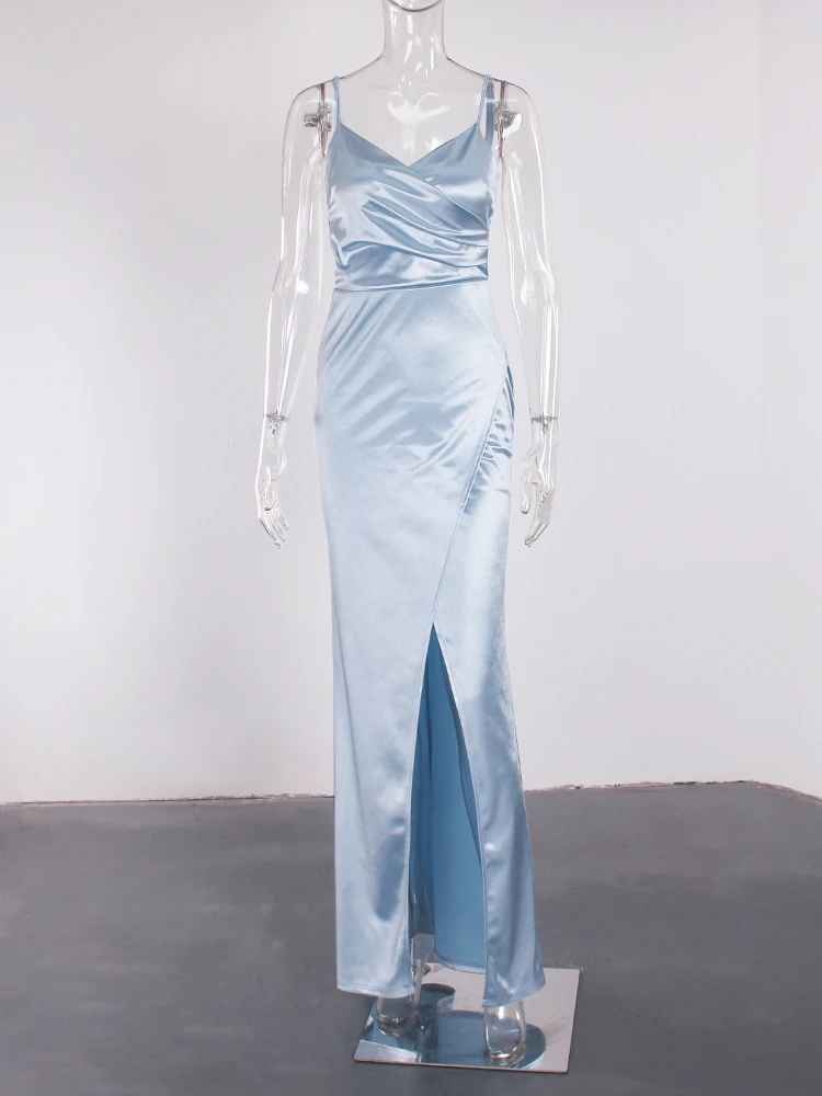 victoria’s vogue Summer V Neck Wrap Satin Maxi Dress Stretch Split Sky Blue Sexy Bodycon Night Club Evening Party