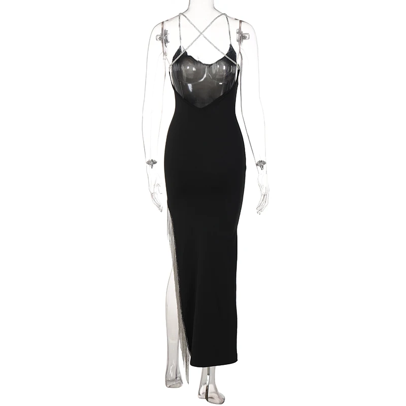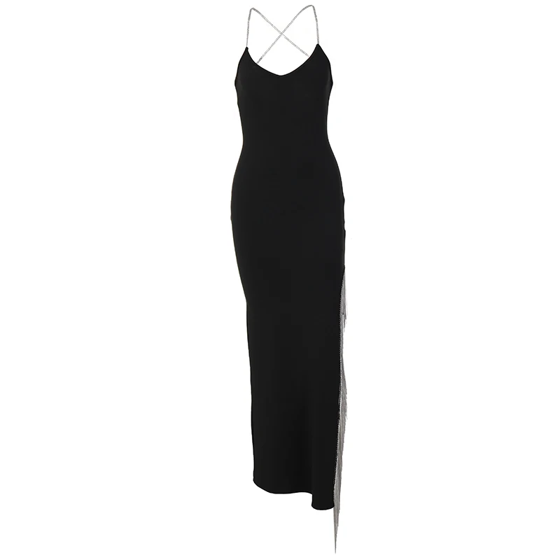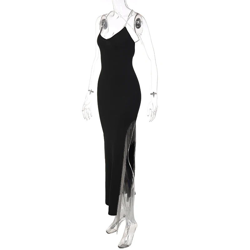 victoria’s vogue Tassel Solid Shine Strings Slip Sleeveless Slit Maxi Dress 2022 Summer Bodycon Fashion Y2K Outfit Elegant Wear