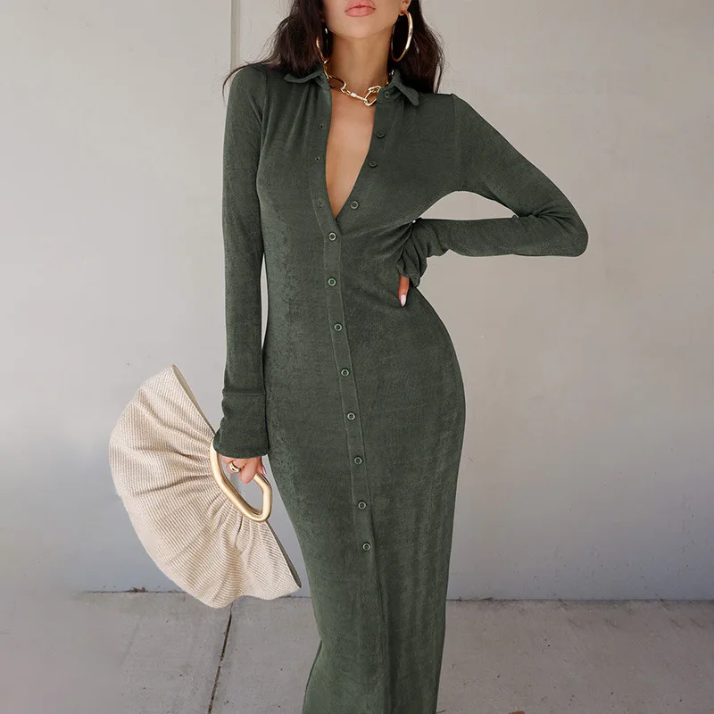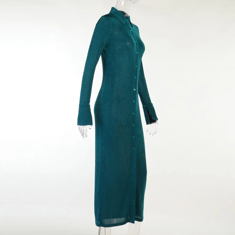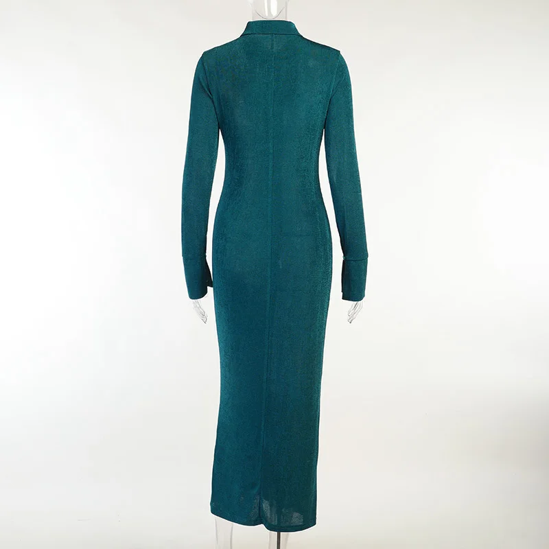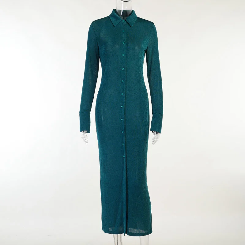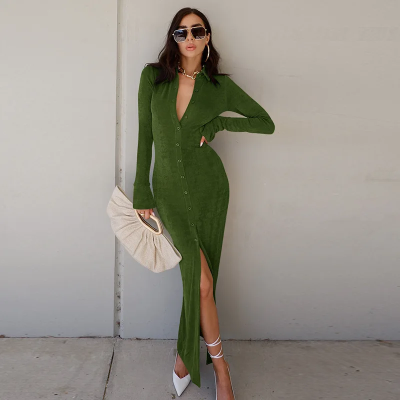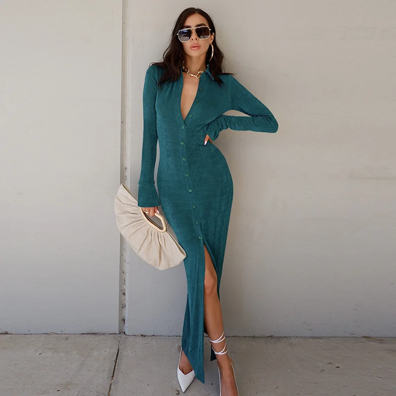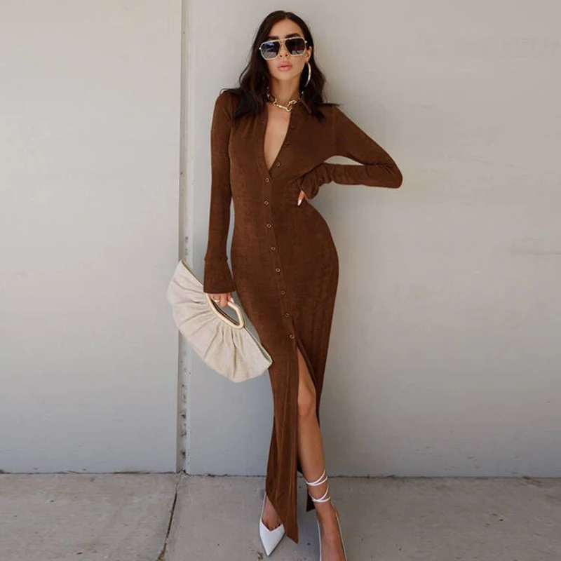 victoria’s vogue Turn Down Collar Knitted Dresses Women 2022 Spring Sexy Long Sleeve High Waist Single Breasted Side Split Evening Dress