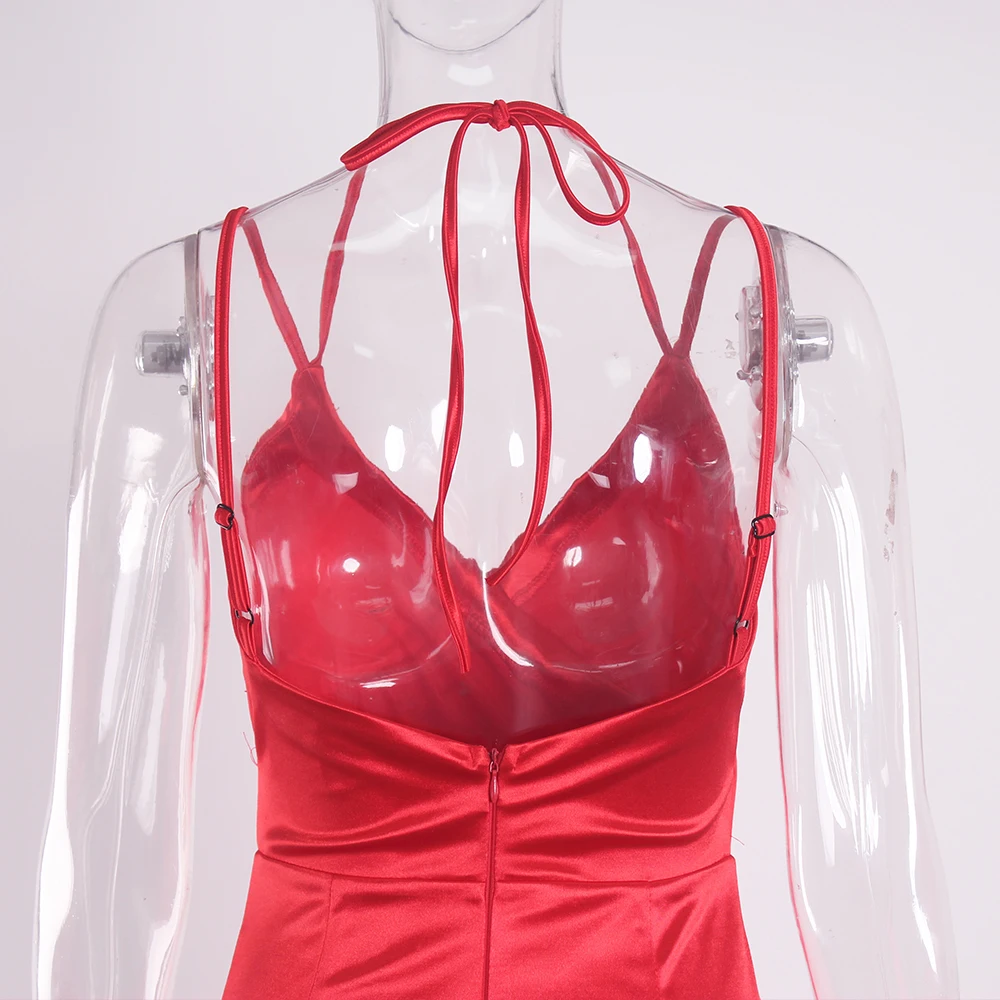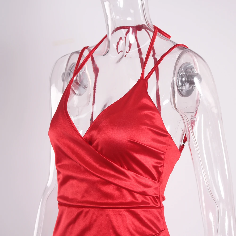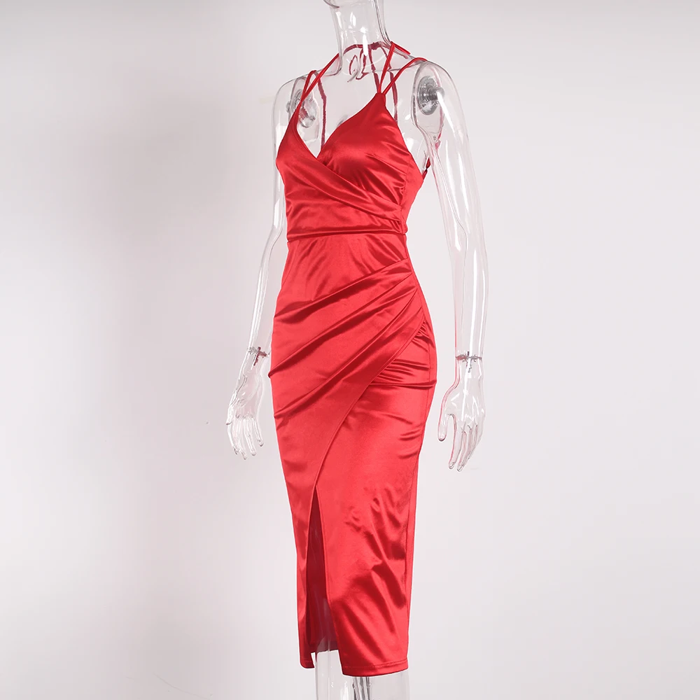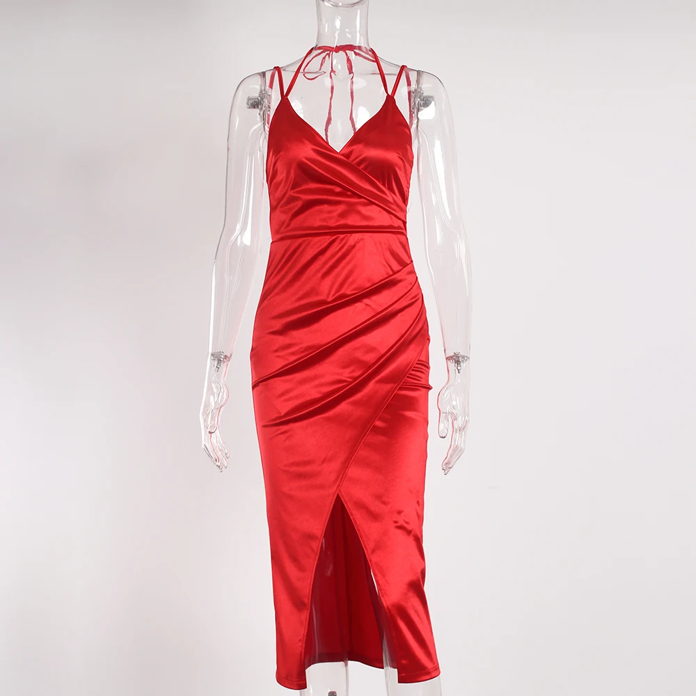 victoria’s vogue V Neck Halter Strap Deep V Neck Wrap Satin Midi Dress Stretch Teal Red Sexy Bodycon Night Club Red Teal