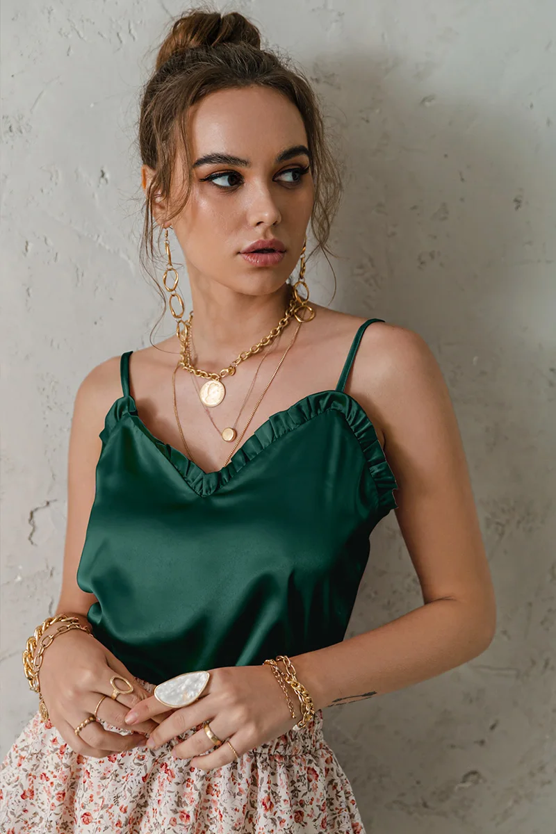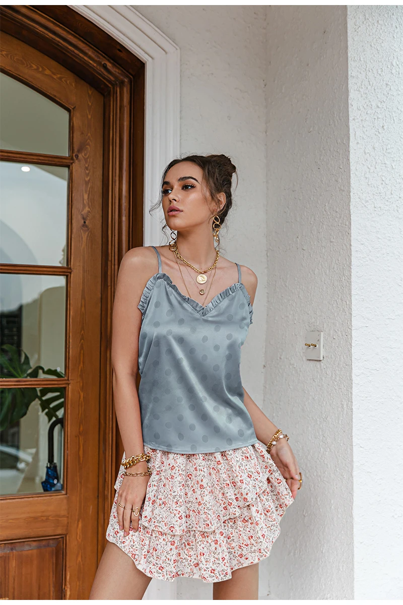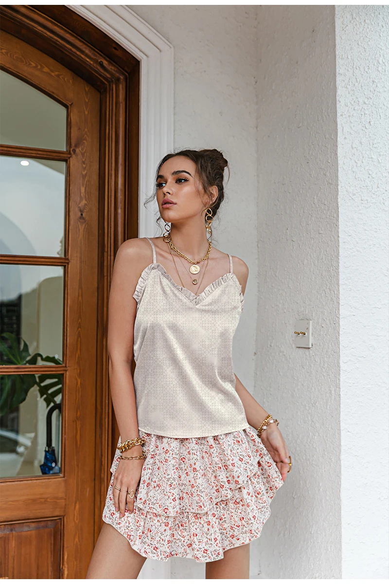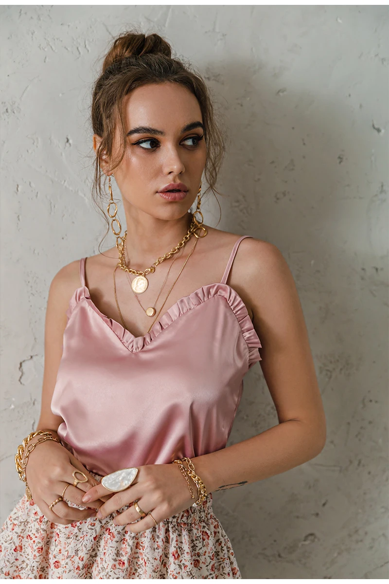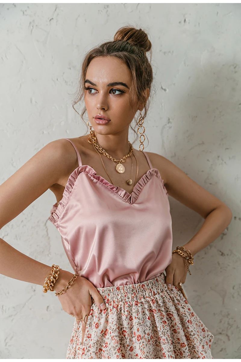 victoria’s vogue V-neck Sexy Satin ruffle Female Tanks Pink Loose Basic Sleeveless Office Lady Camis Fashion Women’s Summer Sling Top