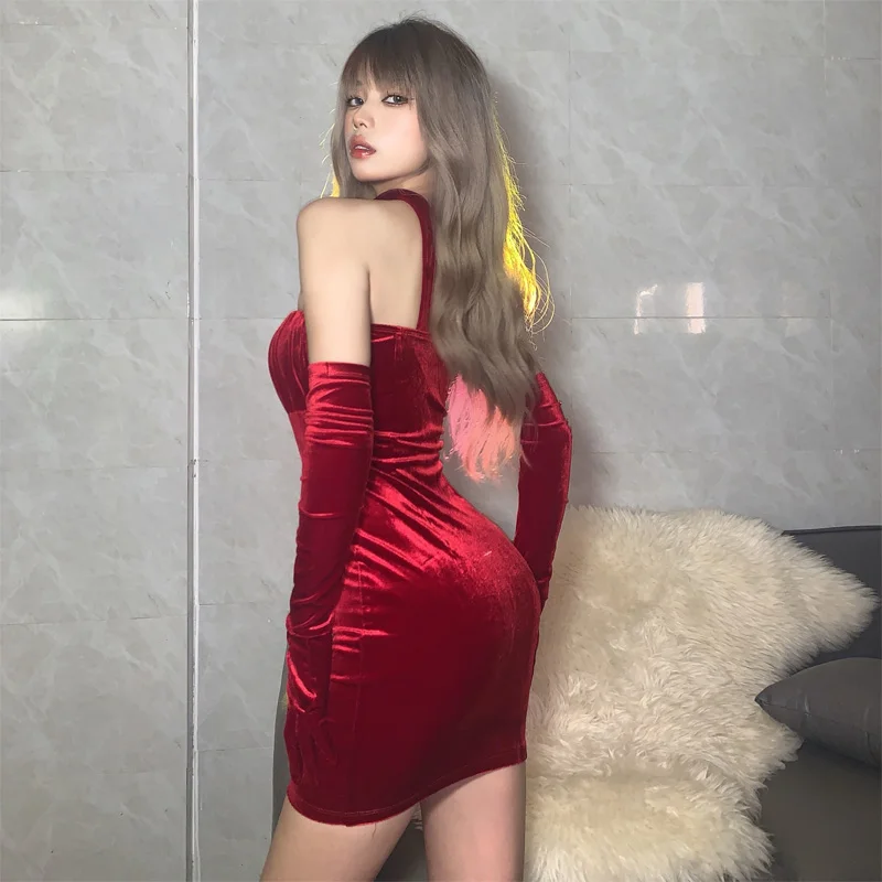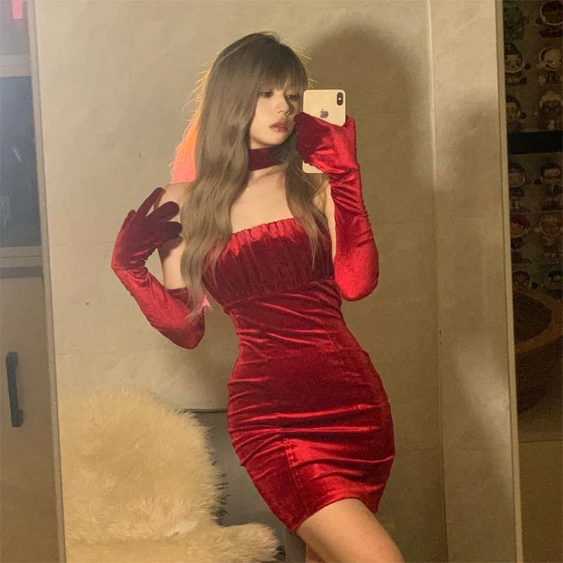 victoria’s vogue Velvet Sleeveless With Gloves Slashneck Bodycon Skinny Mini Cute Dress 2021 Autumn Women Stretch Streetwear Casual