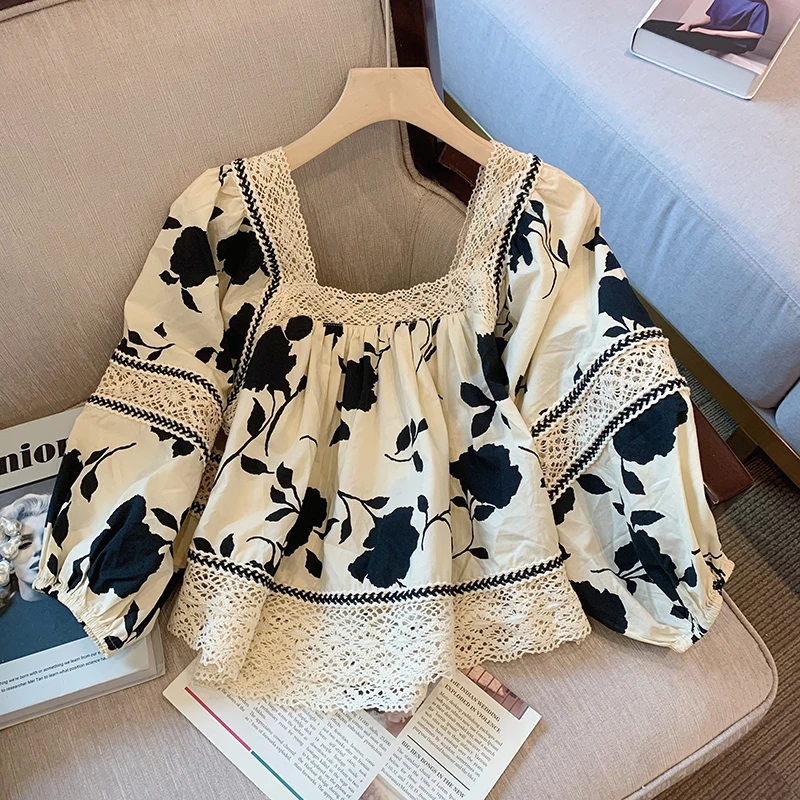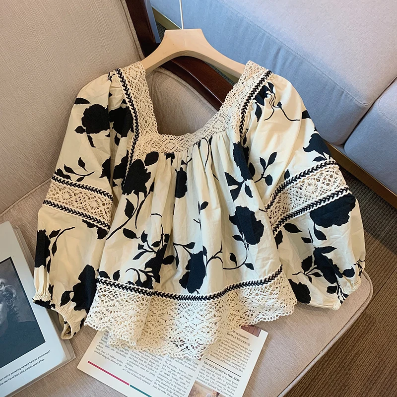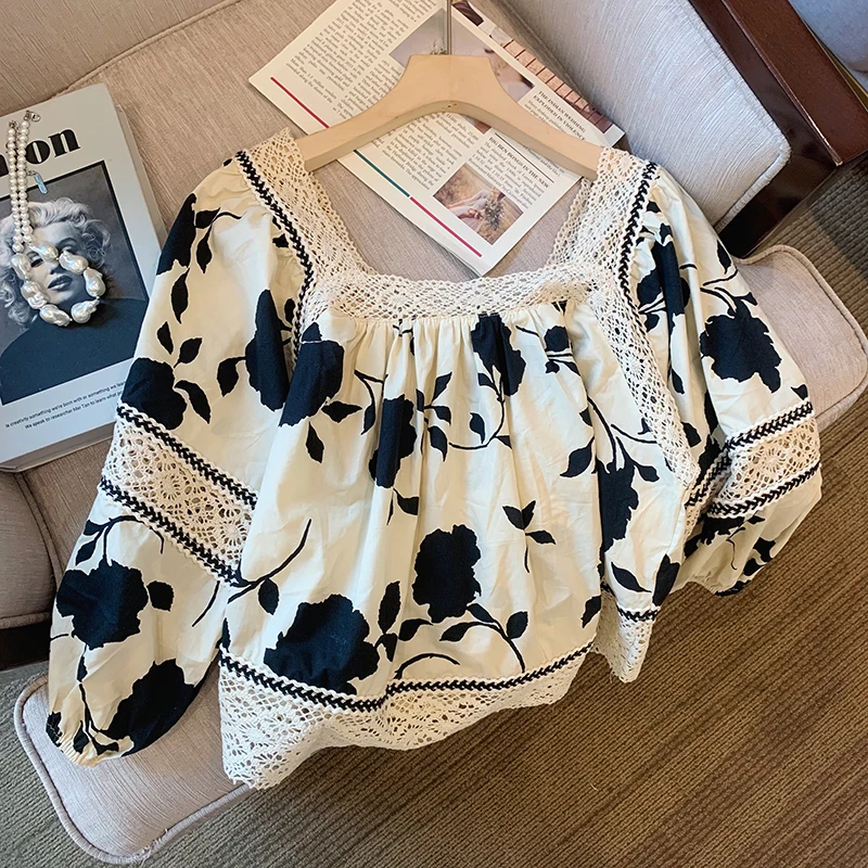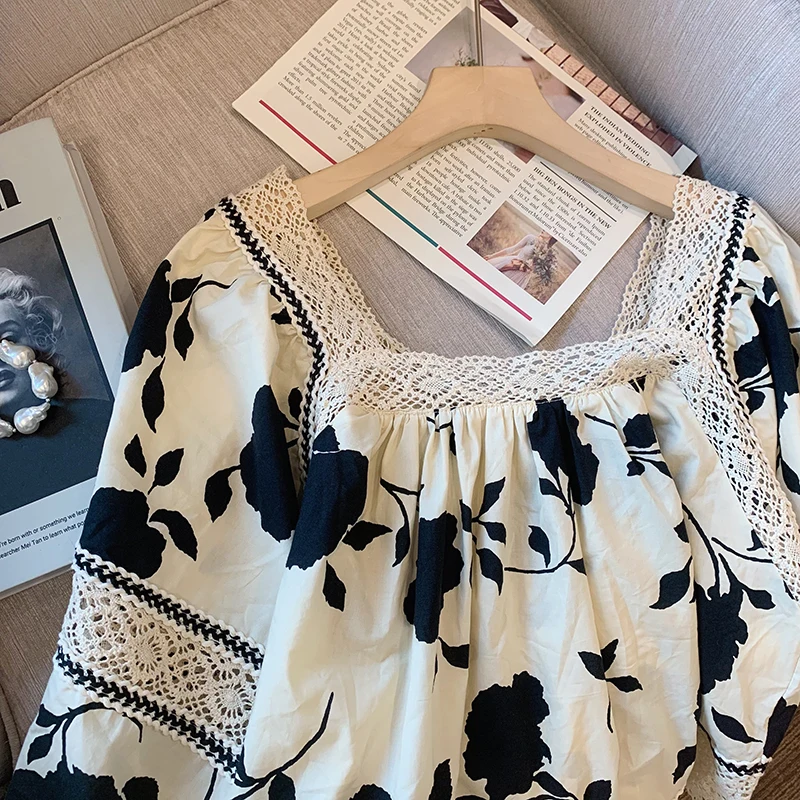 Victoria’s Vogue Vintage Black White Floral Lace Square Neck Blouse Women Korean Fashion Lantern Sleeve Loose Top Holiday Clothing