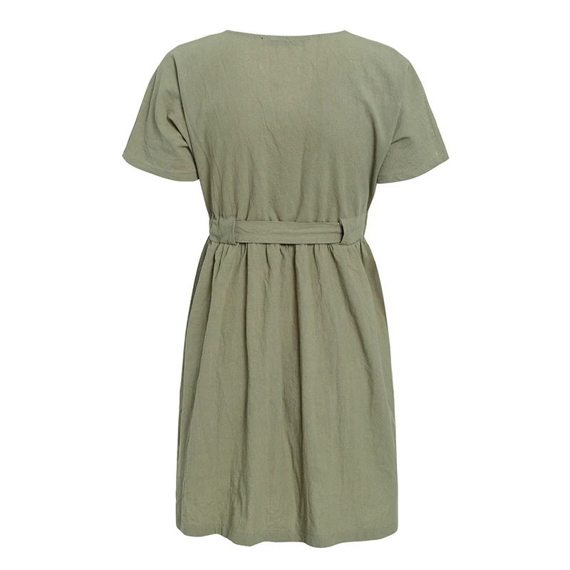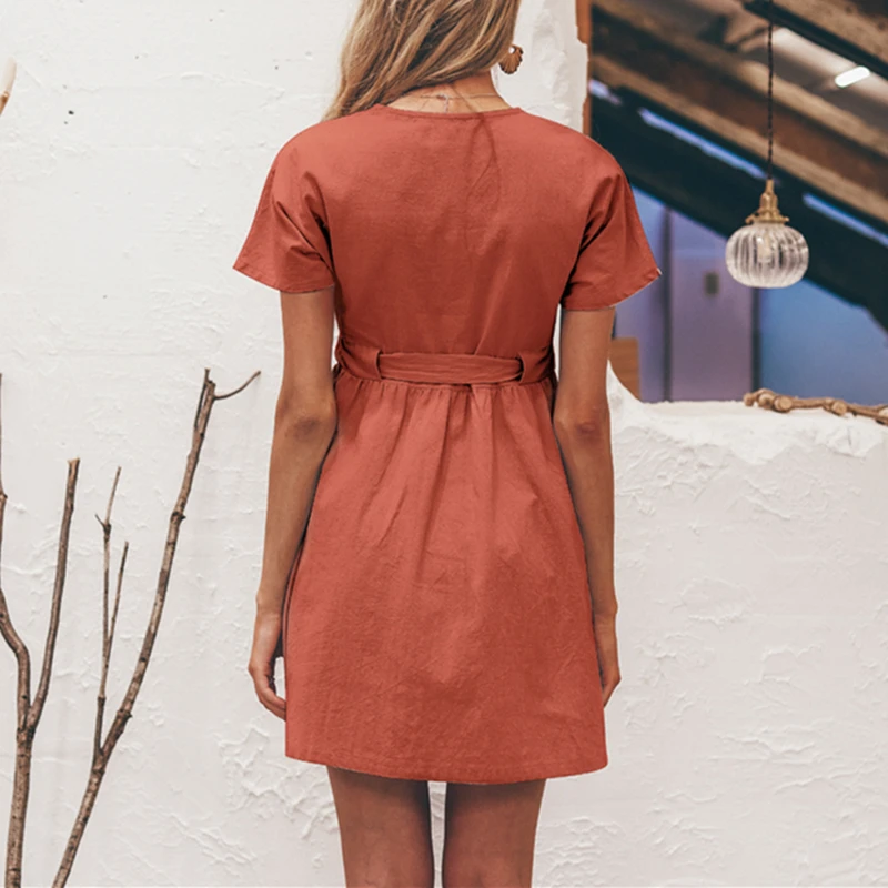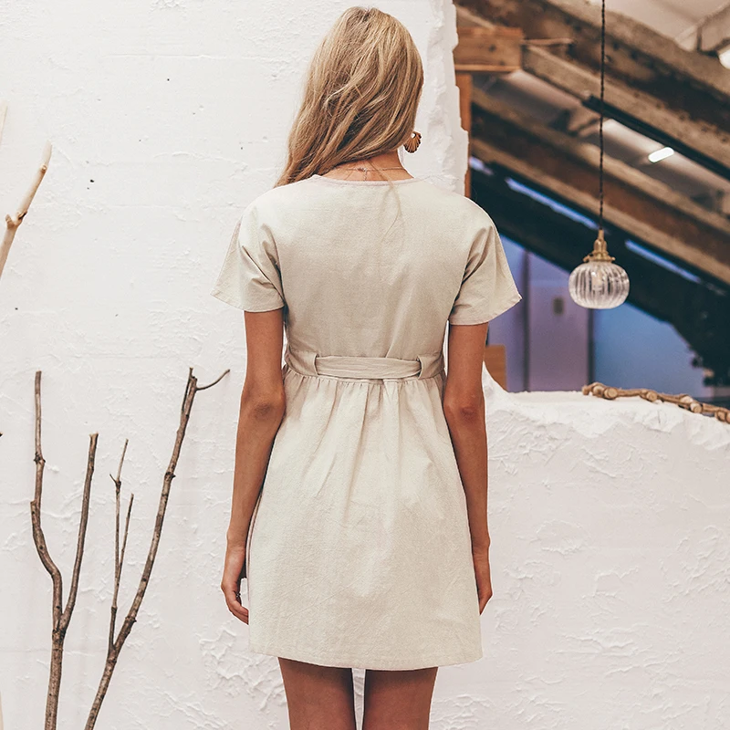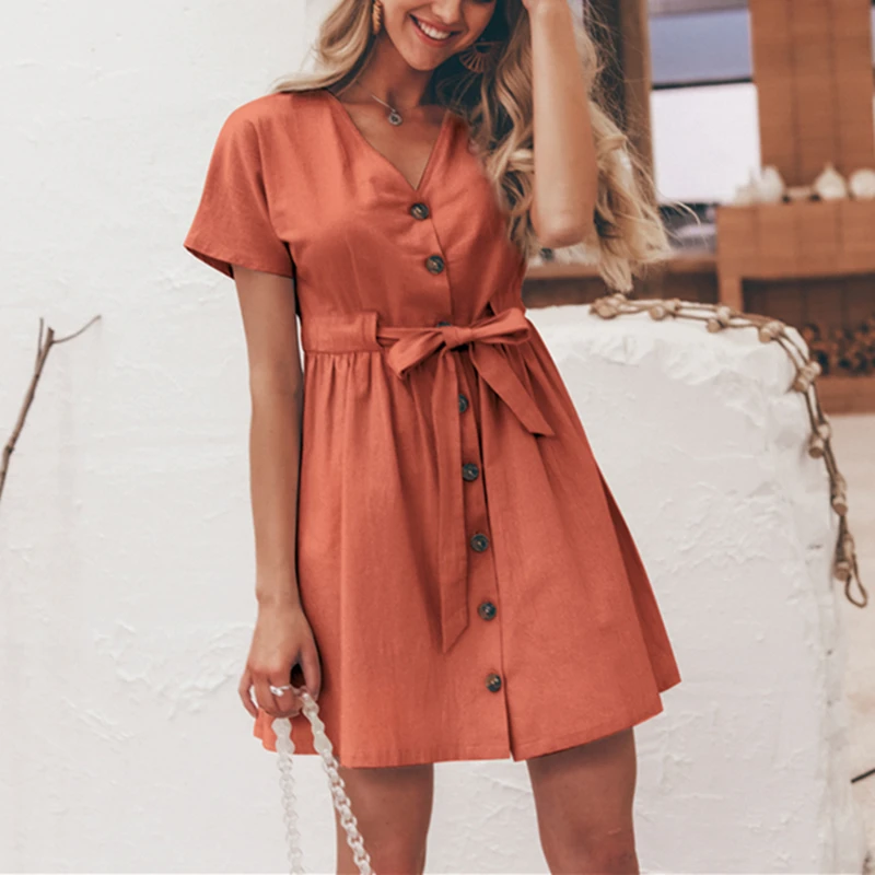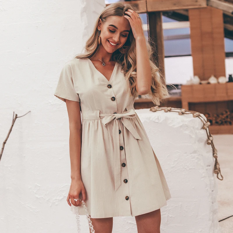 victoria’s vogue Vintage buttons women dress shirt V neck short sleeve cotton linen short summer office dresses Casual korean vestidos