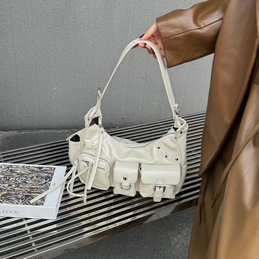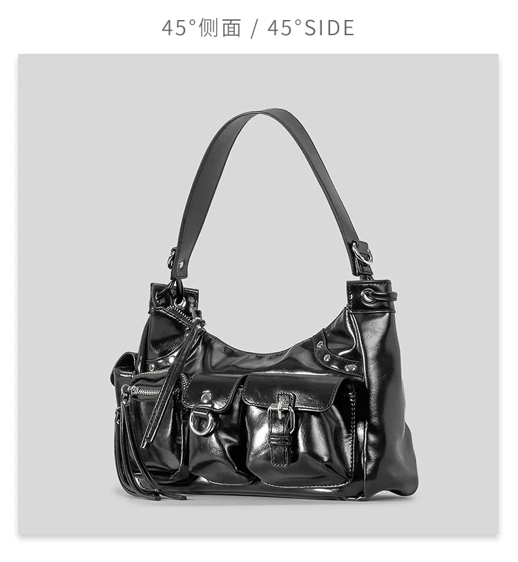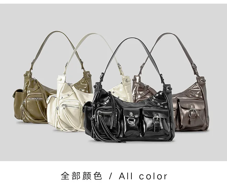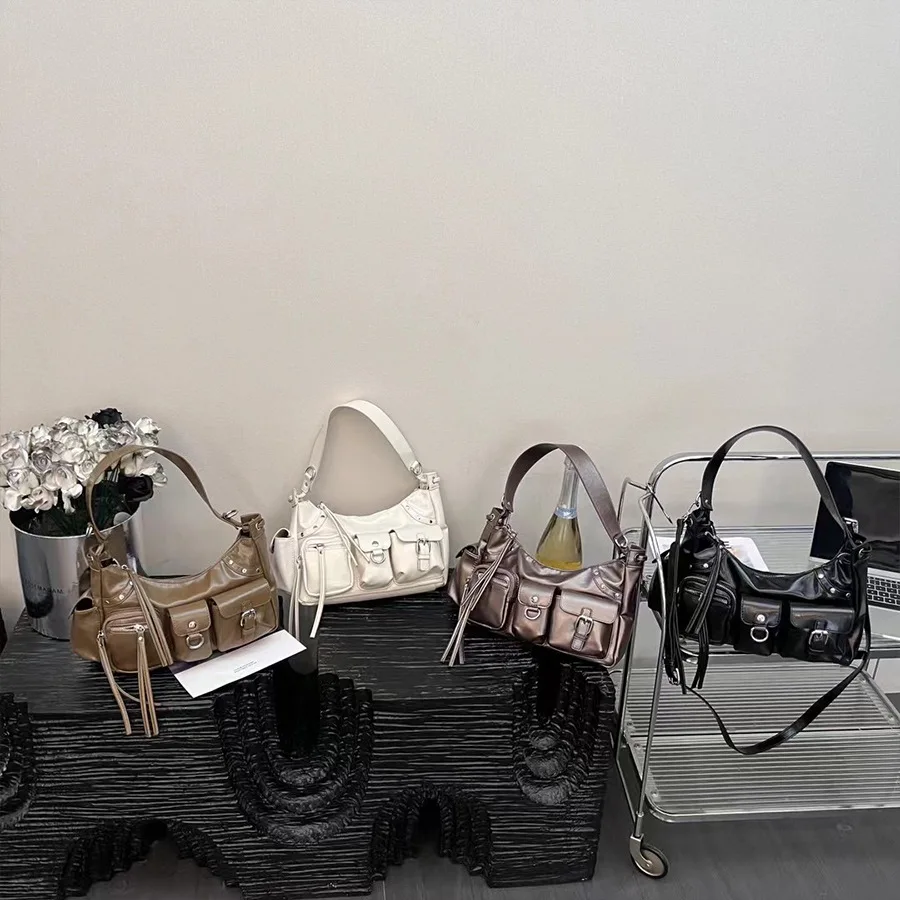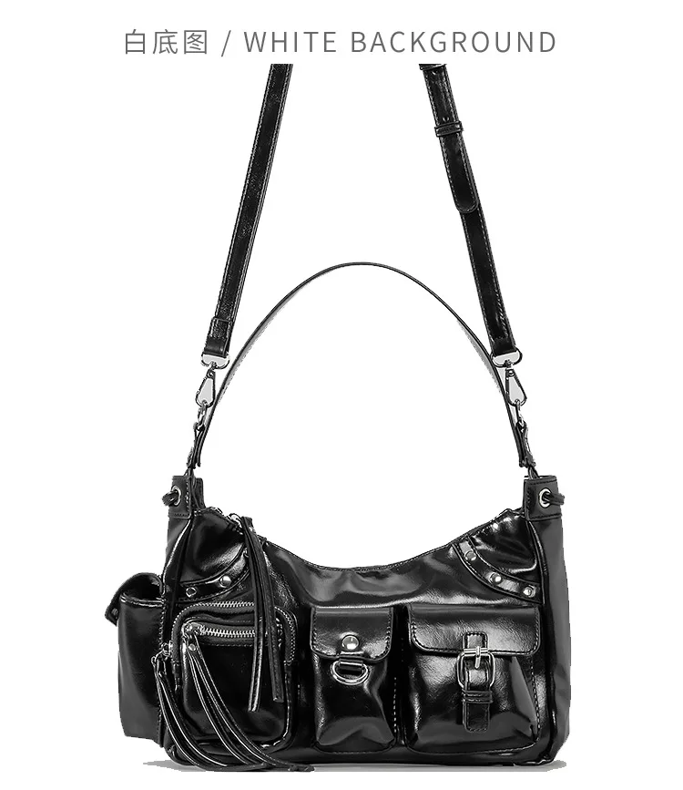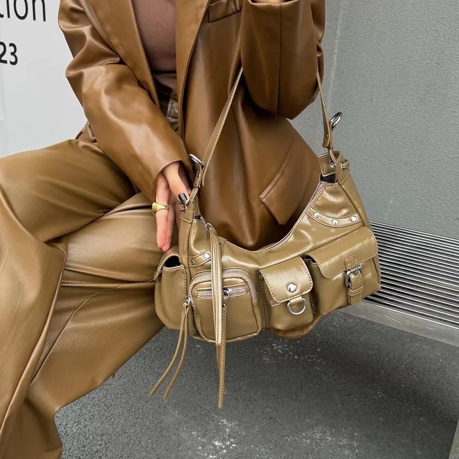 Victoria’s Vogue Vintage Rivet Multiple Pockets Motorcycle Bag Soft Pu Leather Women Handbags Long Tassel Shoulder Bags Retro Y2K Female Bag 2023