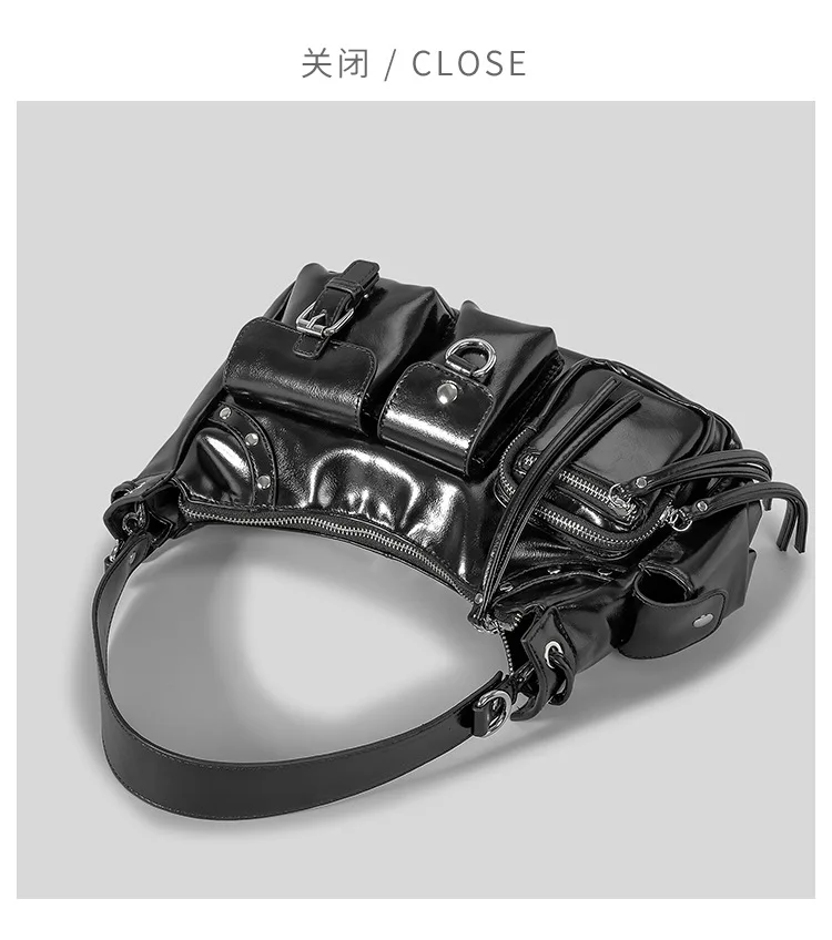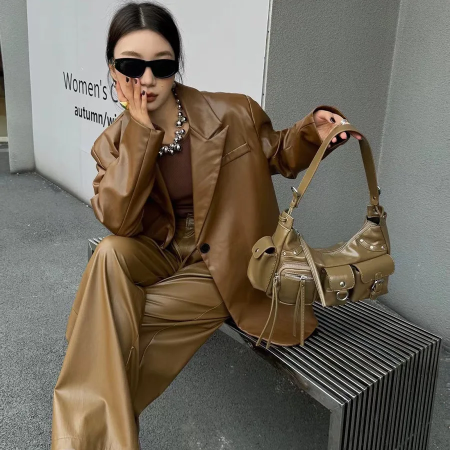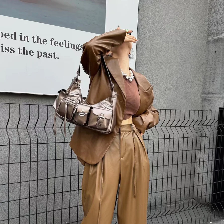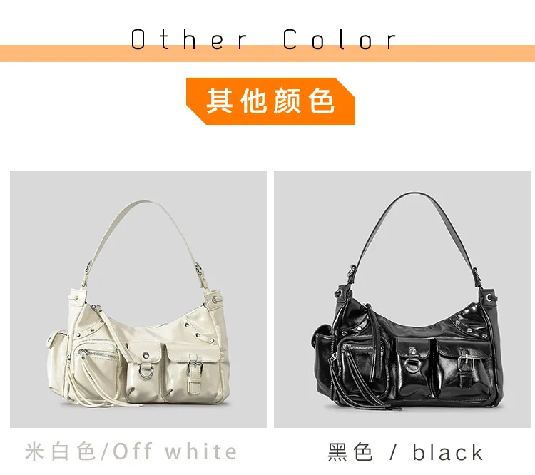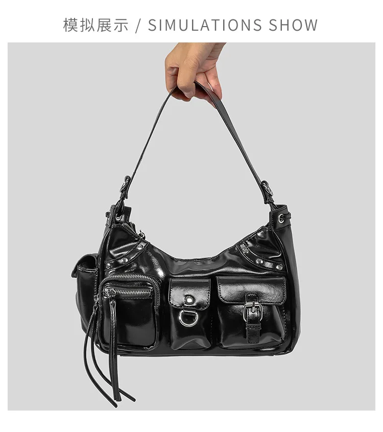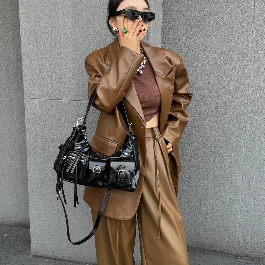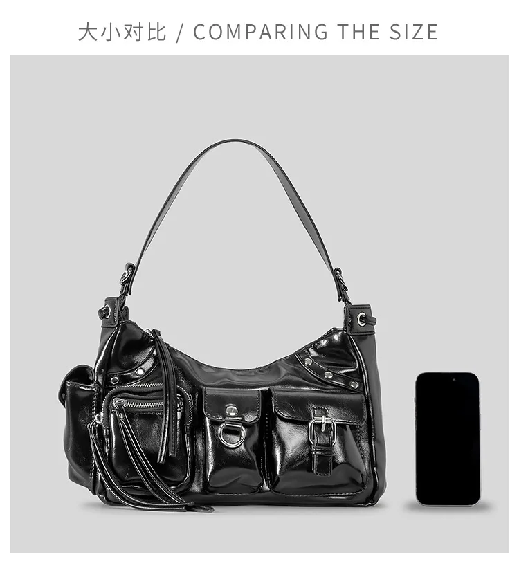 Victoria’s Vogue Vintage Rivet Multiple Pockets Motorcycle Bag Soft Pu Leather Women Handbags Long Tassel Shoulder Bags Retro Y2K Female Bag 2023