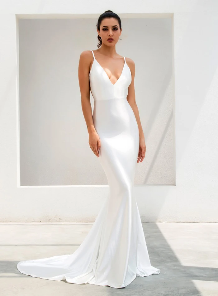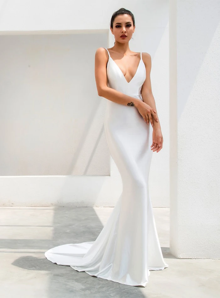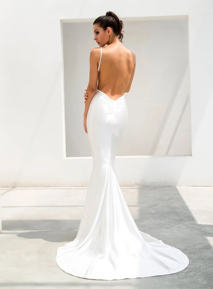 victoria’s vogue White Deep V-Neck Open Back Slim Flash Material Long Dress