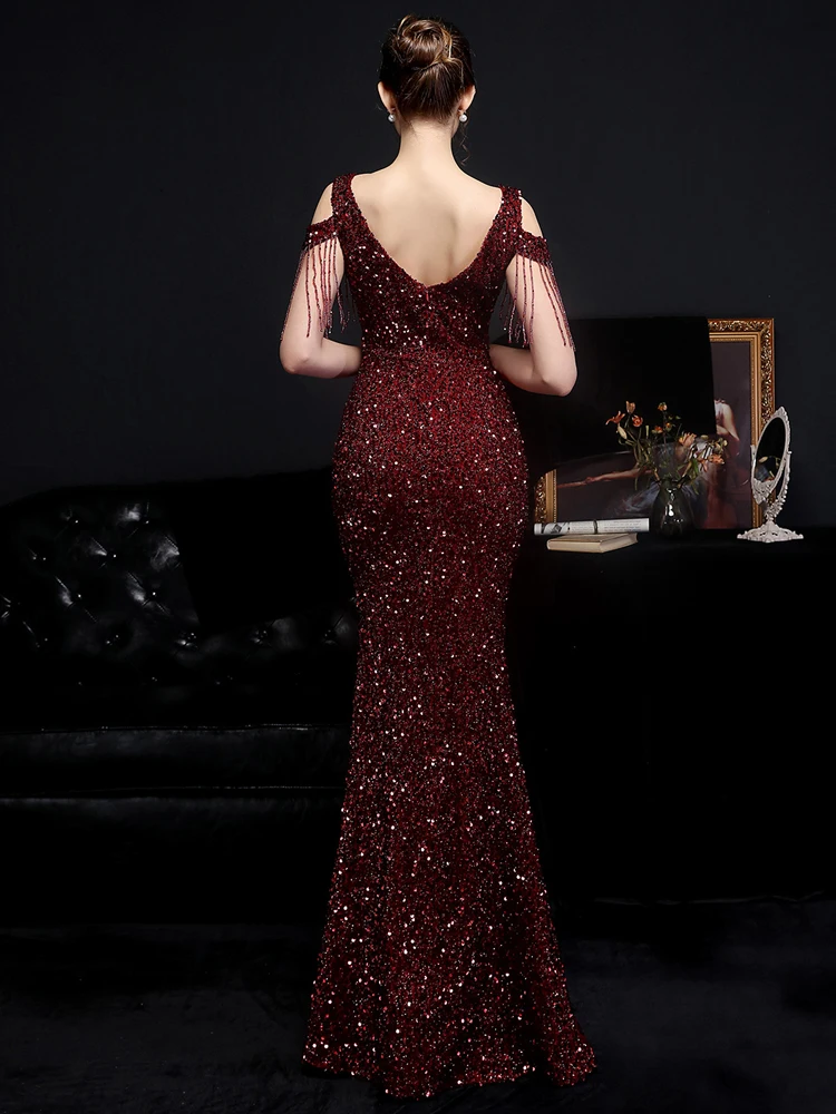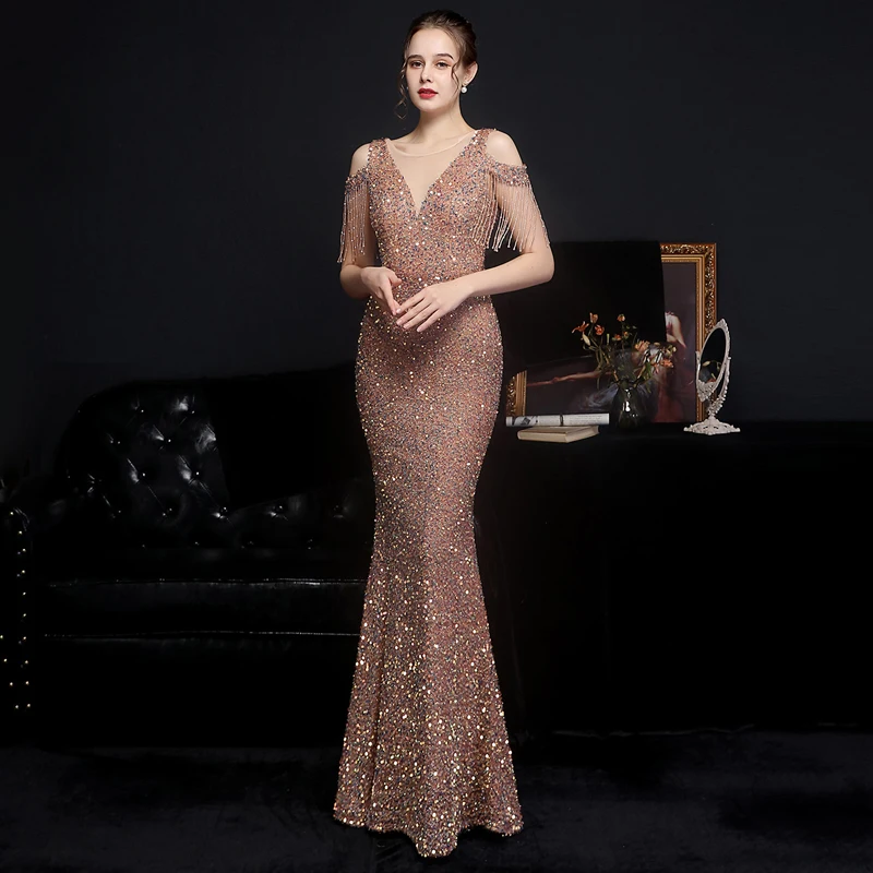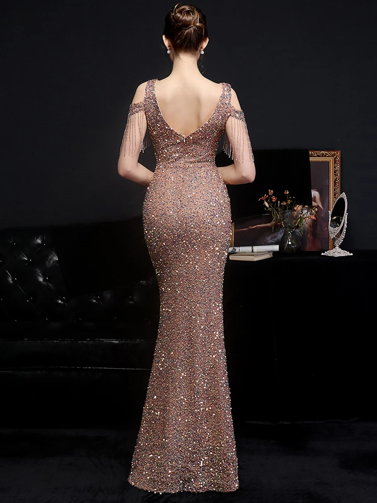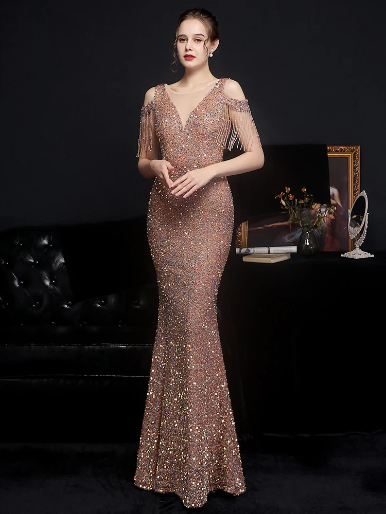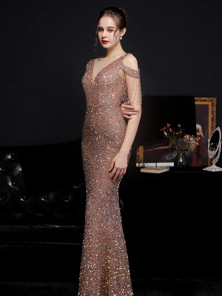 victoria’s vogue Women 2022New Off Shoulder Party Bodycon Maxi Dress Elegant V Neck Gold Sequin Evening Dress 18580