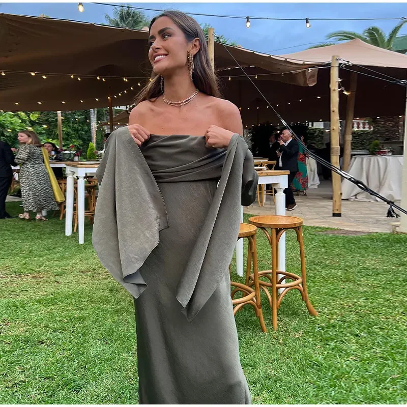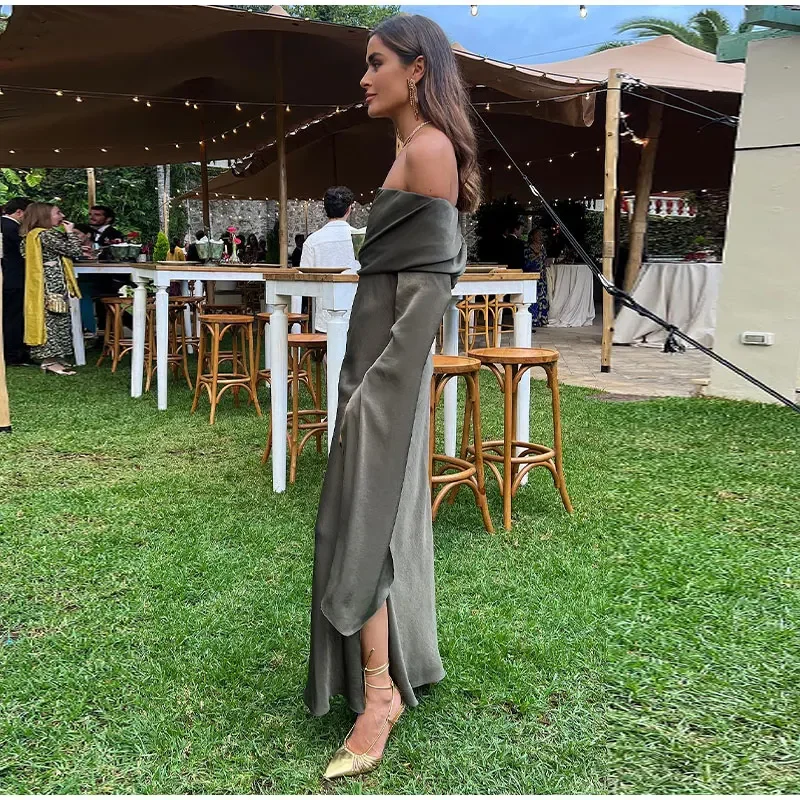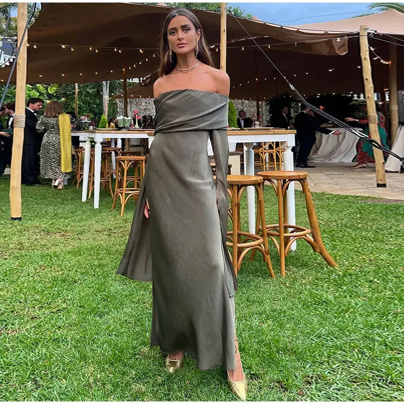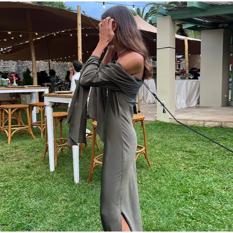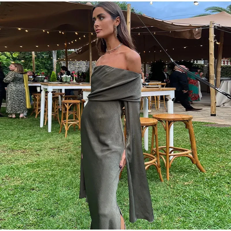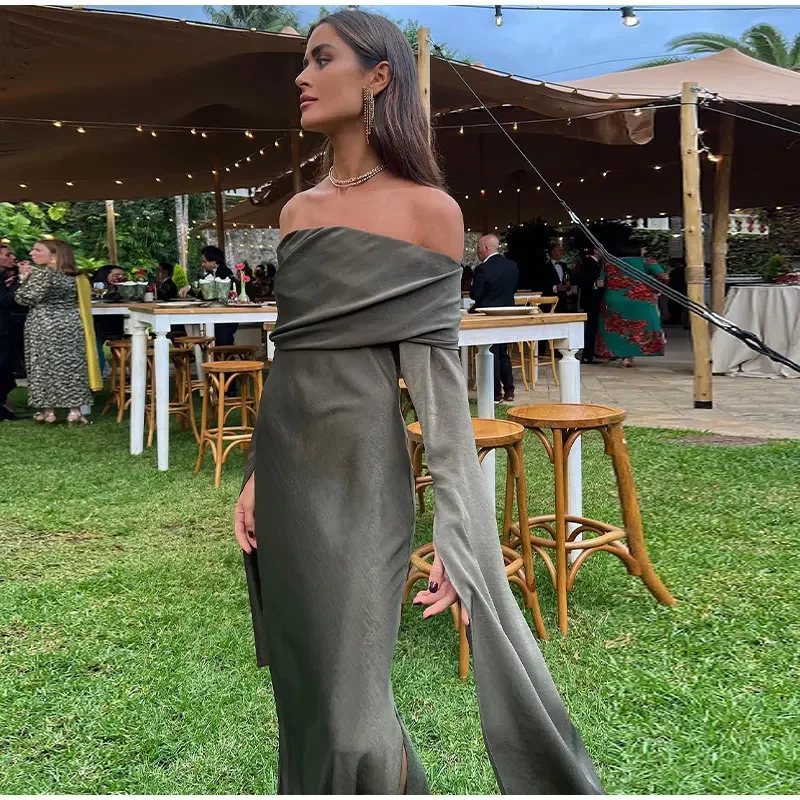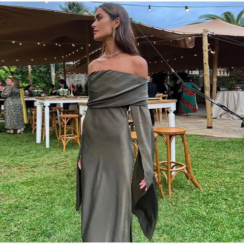 Victoria’s Vogue Women 2024 Sexy Solid Off Shoulder Midi Dress Elegant Chic Slash Neck Long Flare Sleeve Dresses Female High Street Club Robes