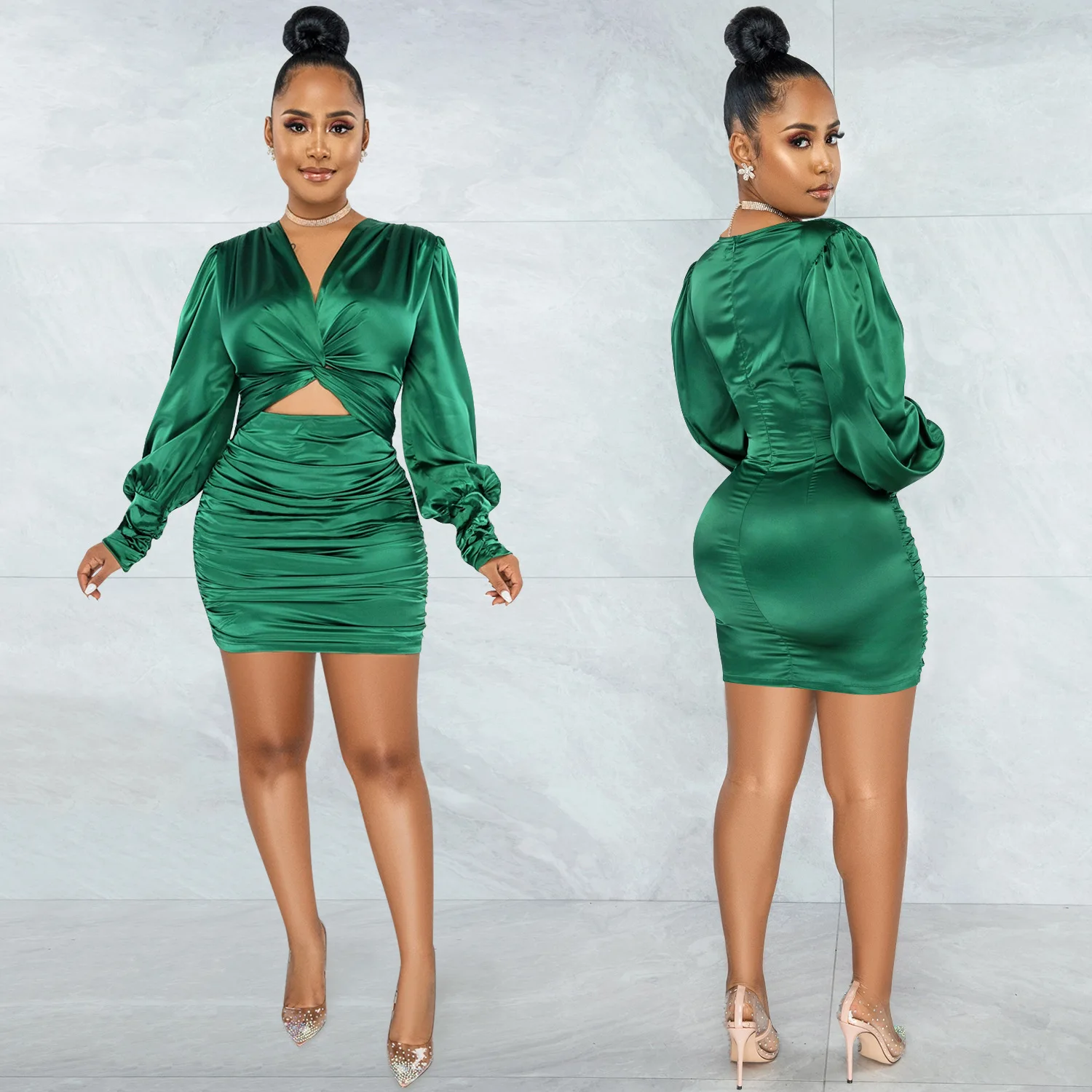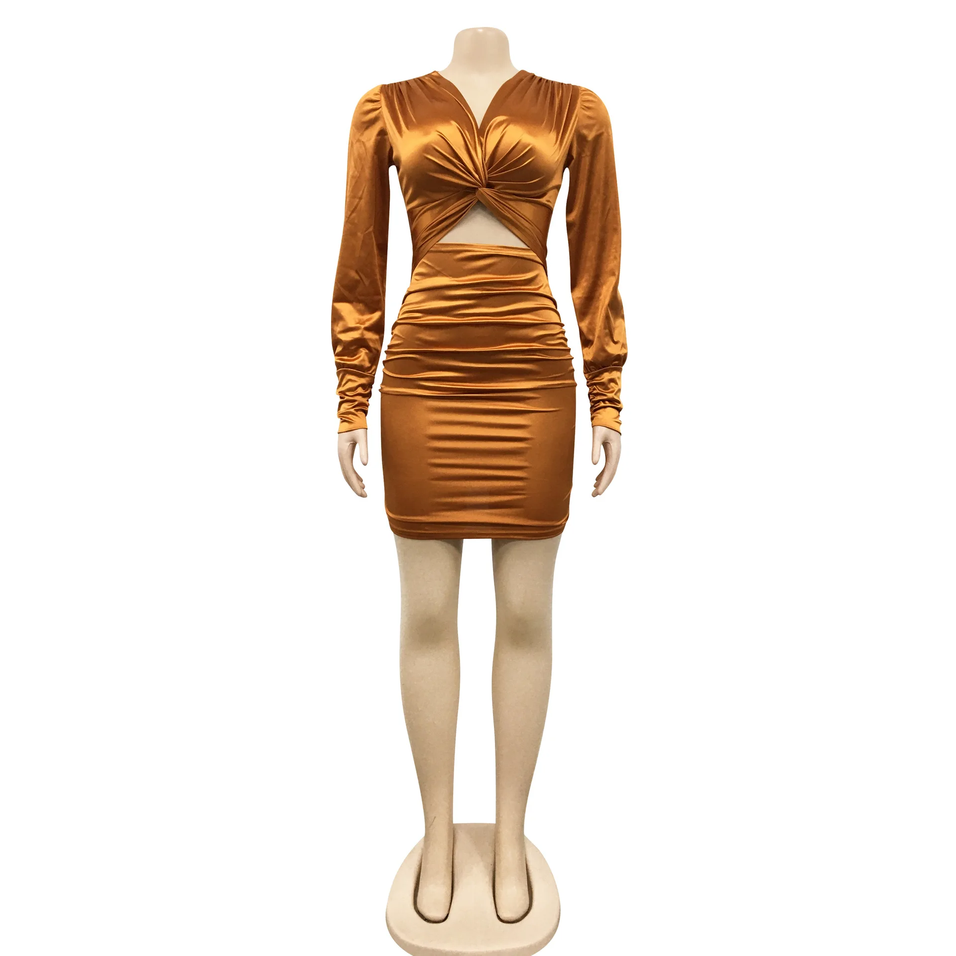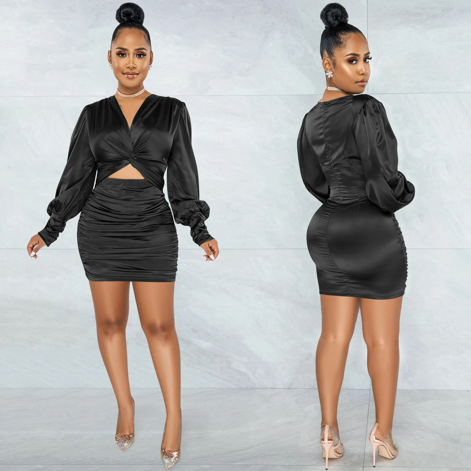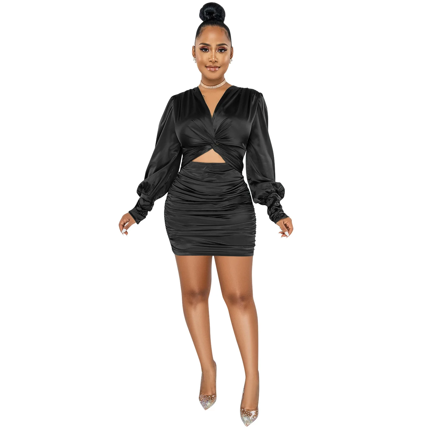 victoria’s vogue Women Dress Long Sleeve Cut Out V Neck Sexy Shiny Satin Clubwear African Evening Night Sheath Bodycon Date Event Robes Y2K 2022