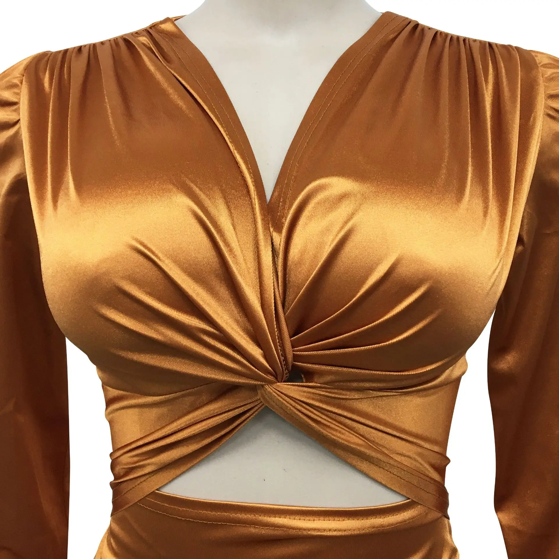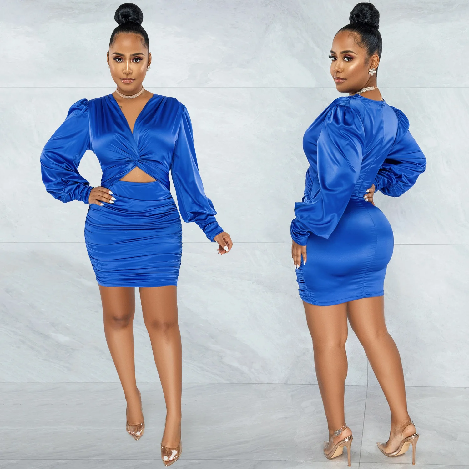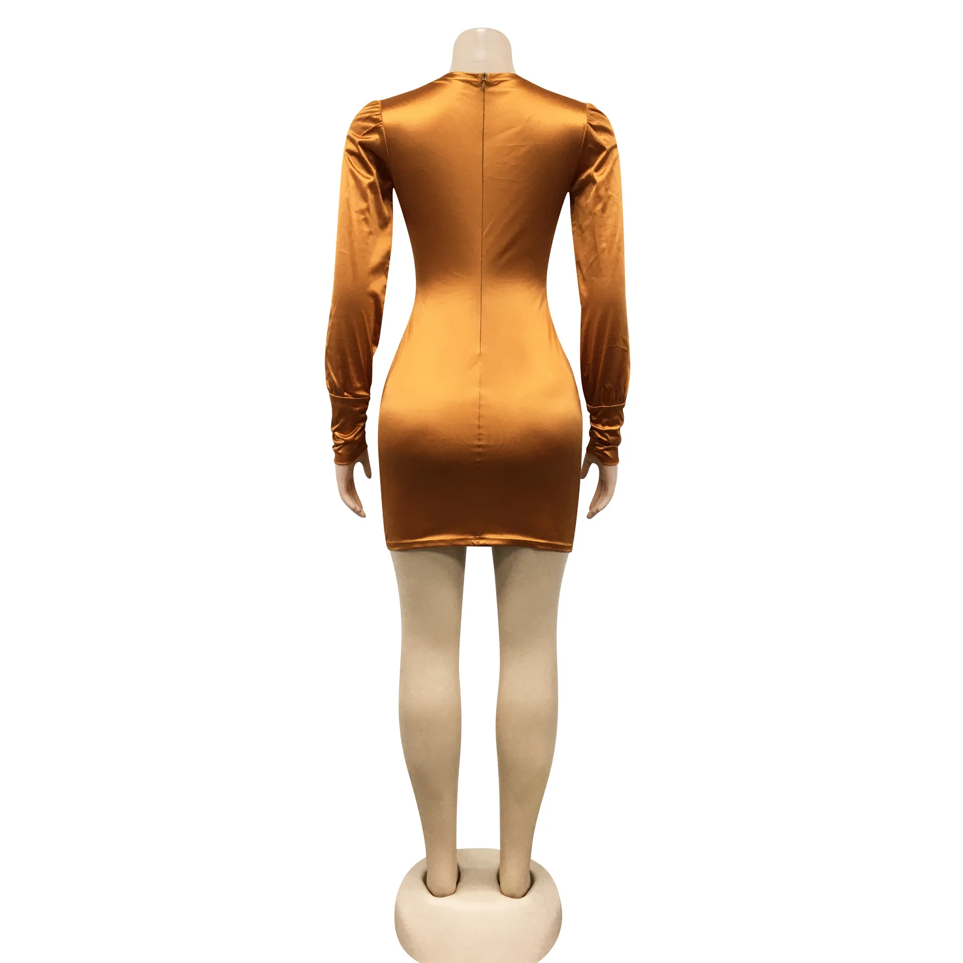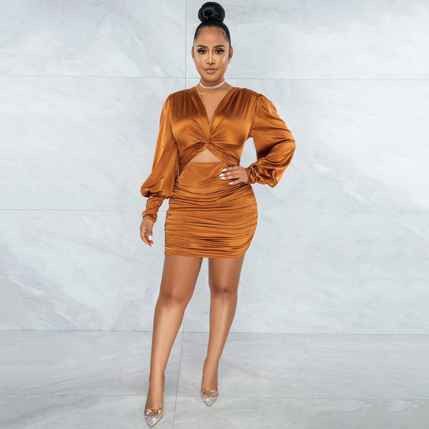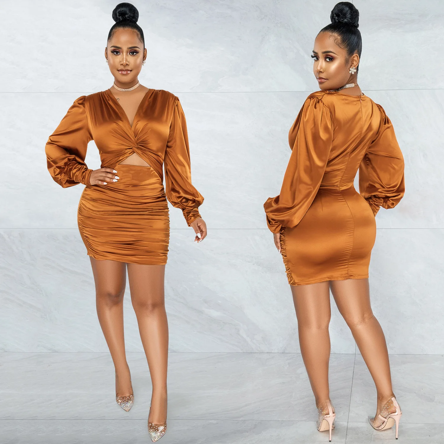 victoria’s vogue Women Dress Long Sleeve Cut Out V Neck Sexy Shiny Satin Clubwear African Evening Night Sheath Bodycon Date Event Robes Y2K 2022