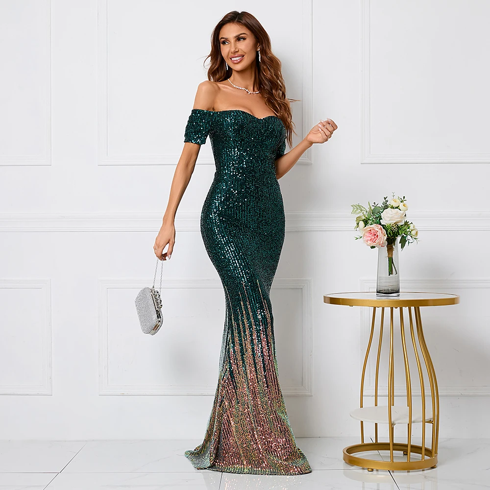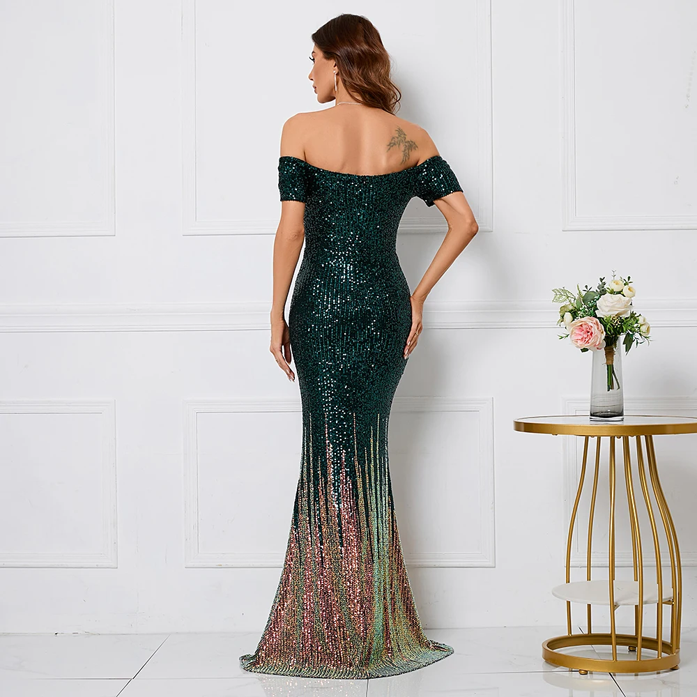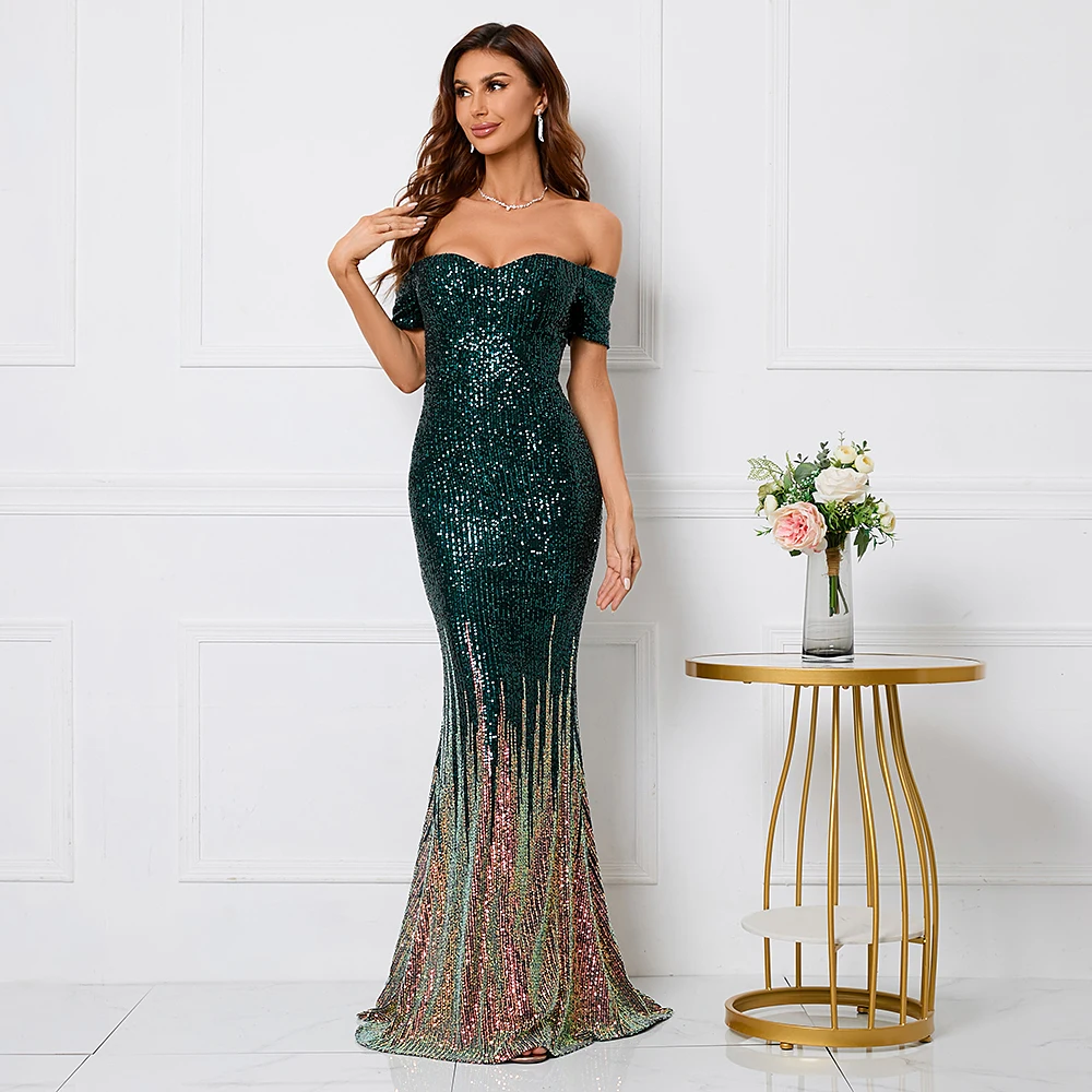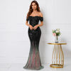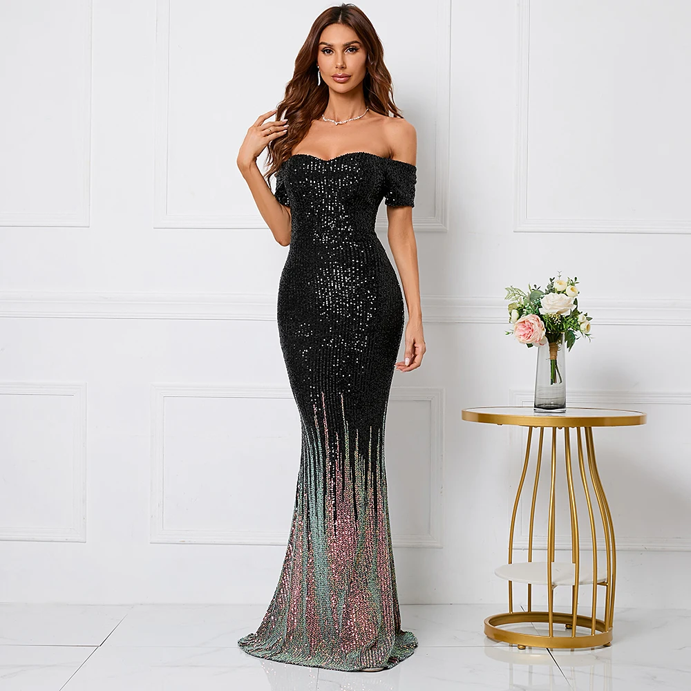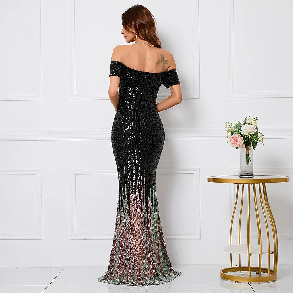 Victoria’s Vogue Women Elegant Boat Neck Party Maxi Dress Off Shoulder Black Sequin Evening Dress Long Prom Dress