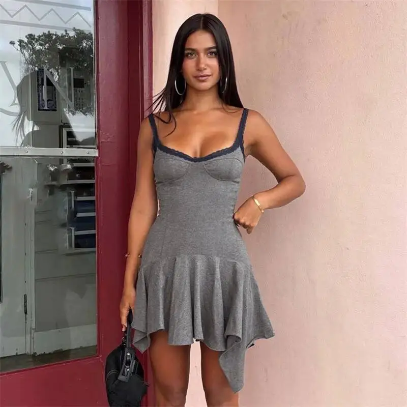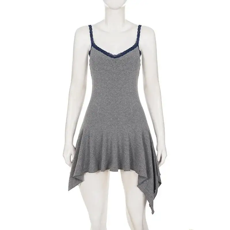 Victoria’s Vogue Women Gray Lace Trim Cami Sexy Mini Dress Women Elegant Spaghetti Strap Sleeveless Backless Asymmetric Hem Club Dresses