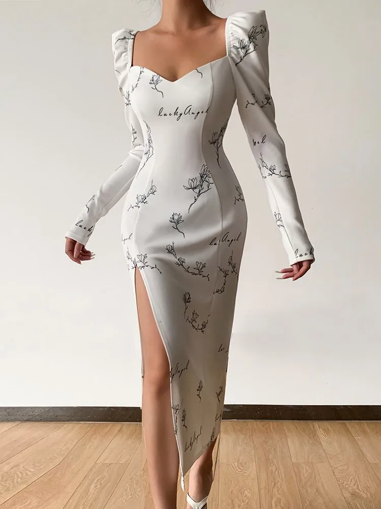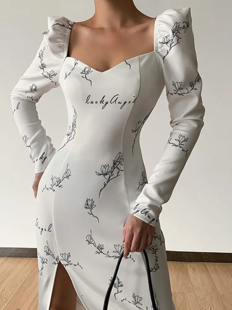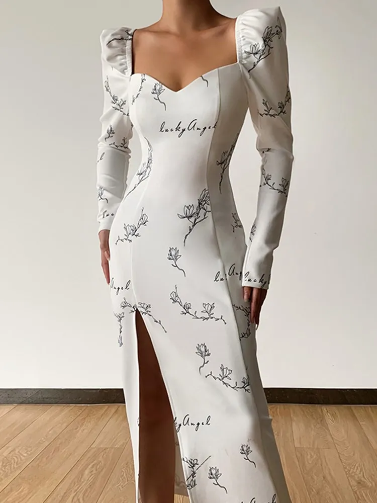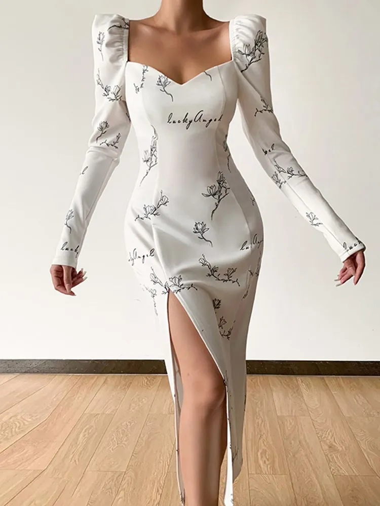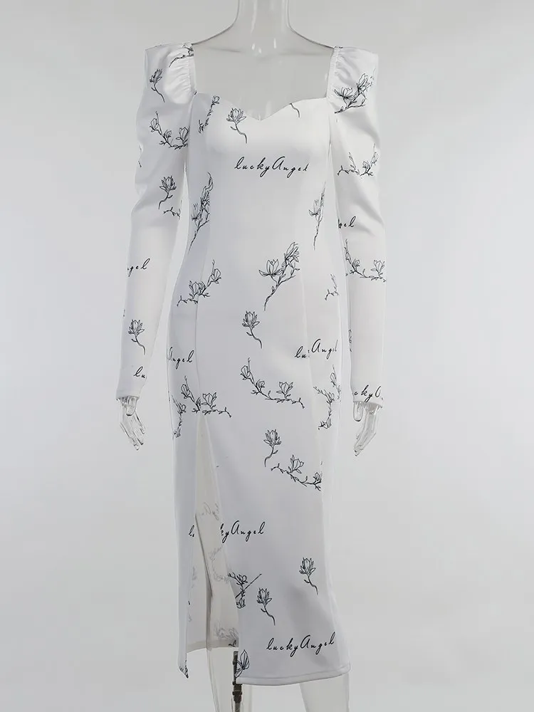 victoria’s vogue Women Midi Dress Floral Print Side Split Casual Sexy Puff Sleeve Square Collar Partywear Fall Aesthetic Elegant Dress