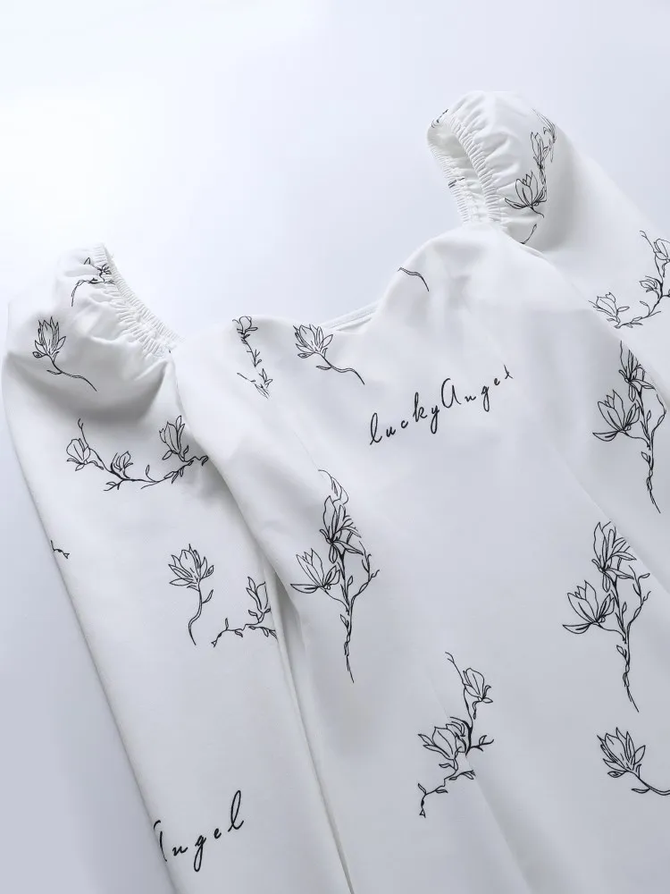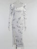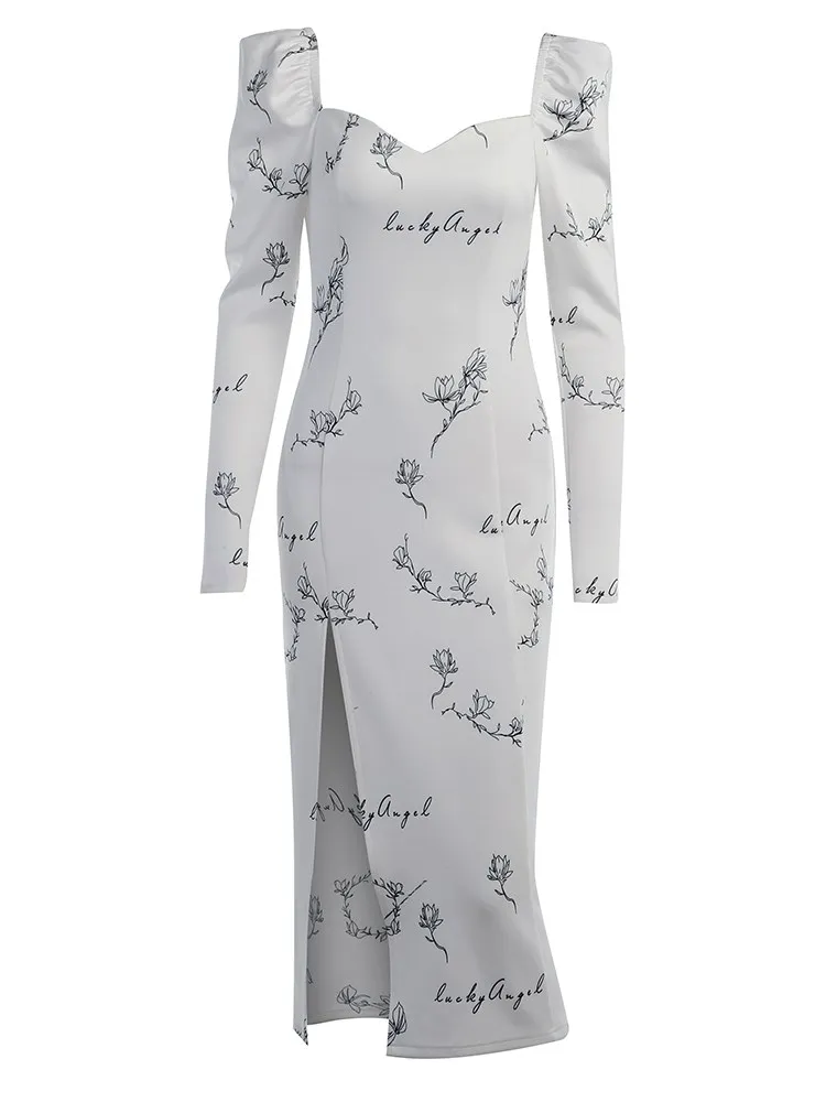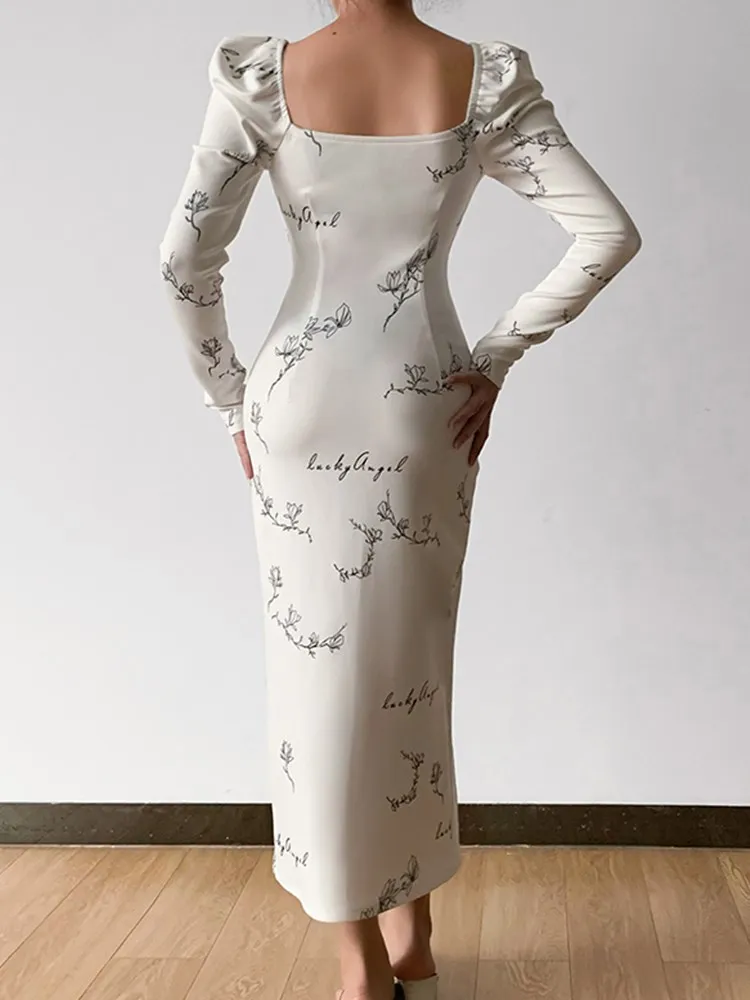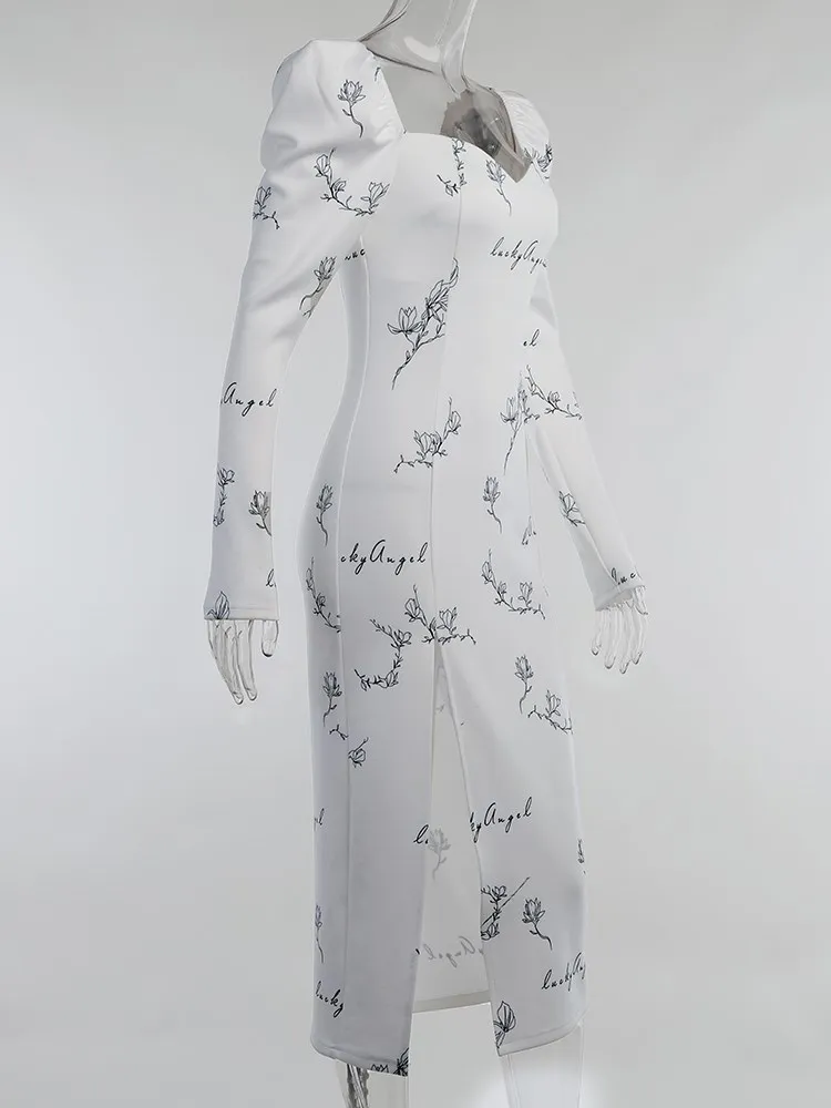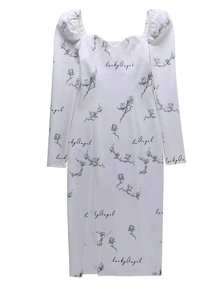 victoria’s vogue Women Midi Dress Floral Print Side Split Casual Sexy Puff Sleeve Square Collar Partywear Fall Aesthetic Elegant Dress