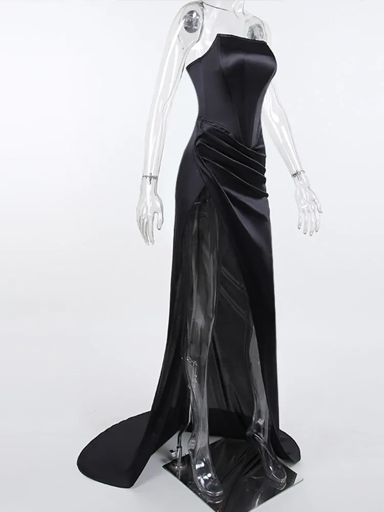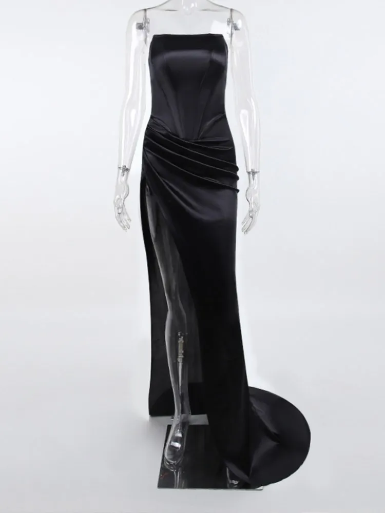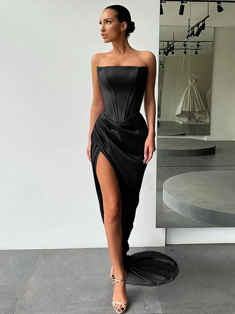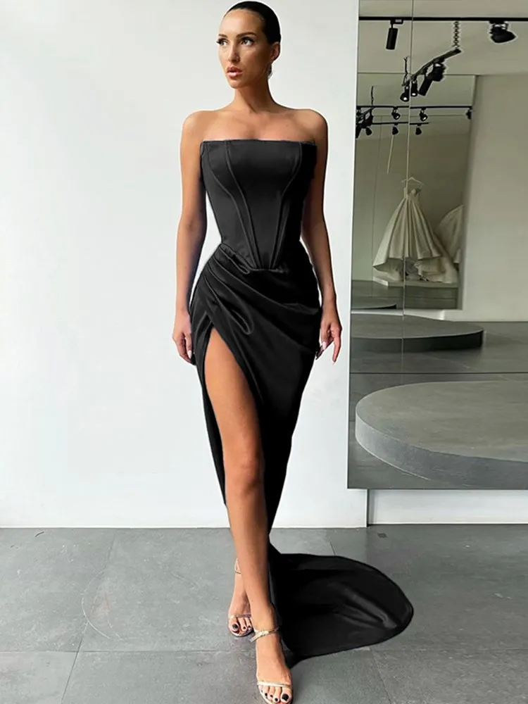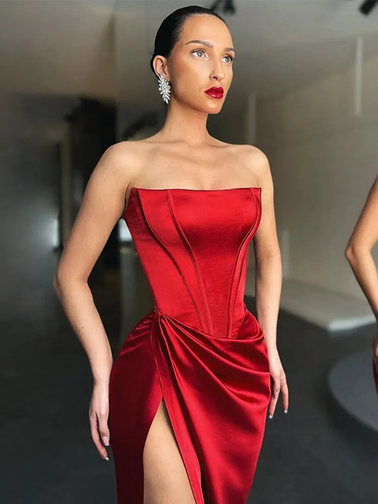 victoria’s vogue Women Midi Dress High Split Ruched Satin Corset Tube Elegant Sexy Vintage Fashion Asymmetric Partywear Long Dress 2021