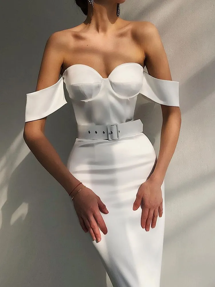 victoria’s vogue Women Off The Shoulder Midi Dresses With Belt Elegant Bodycon Summer Sexy Fashion Party Prom Long Robe Female Clothing