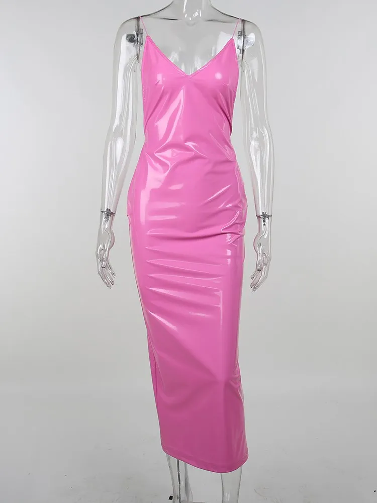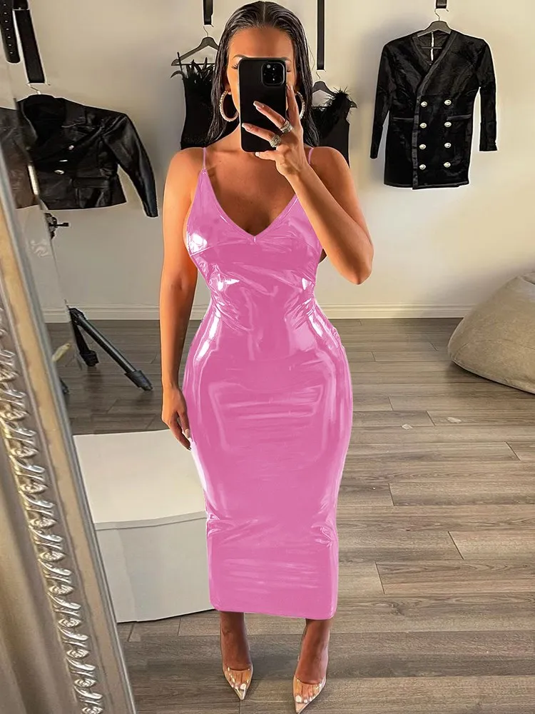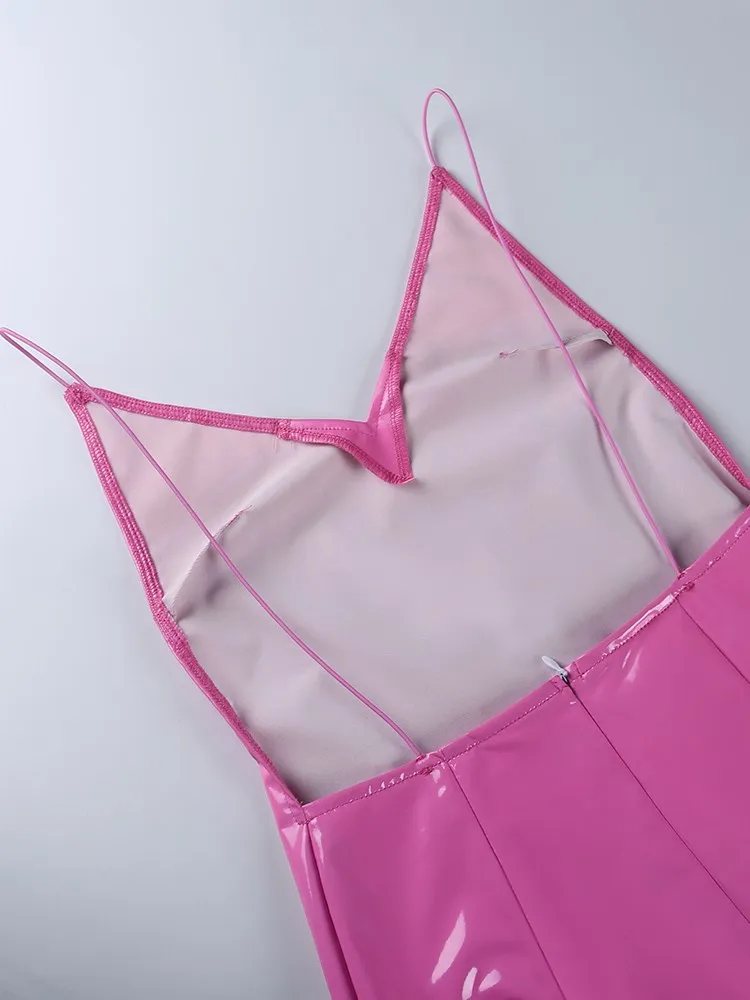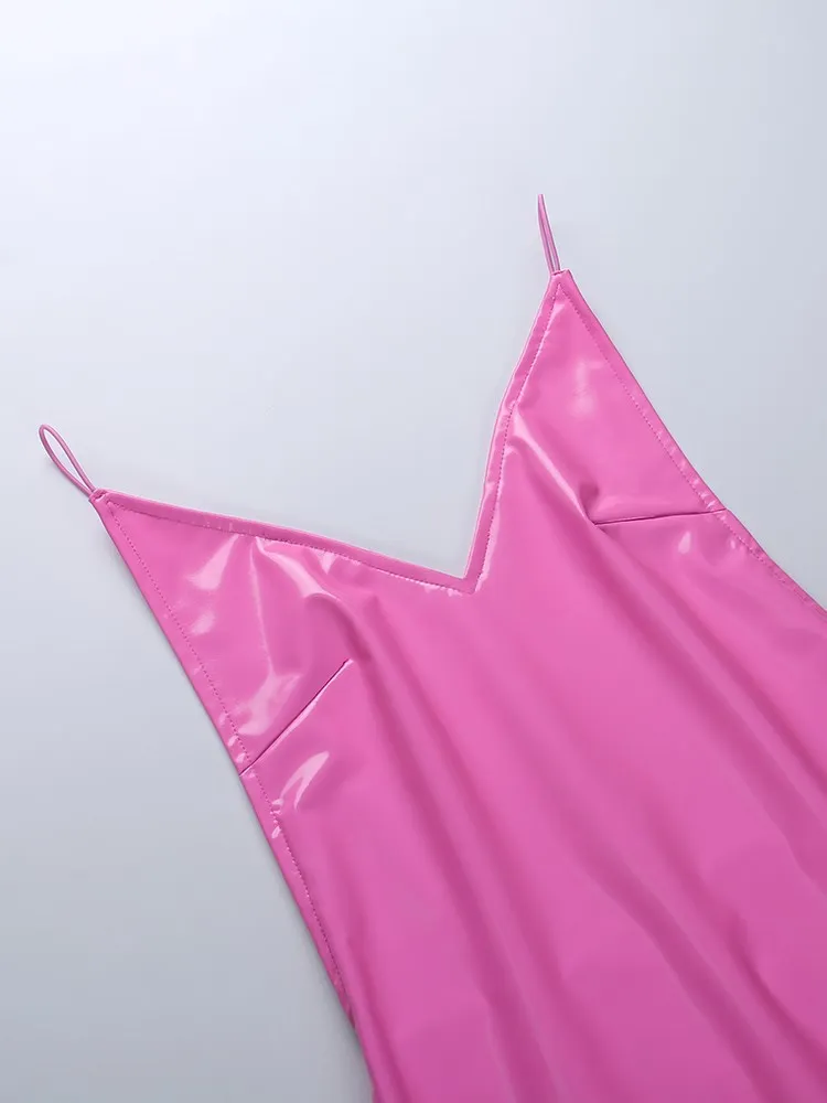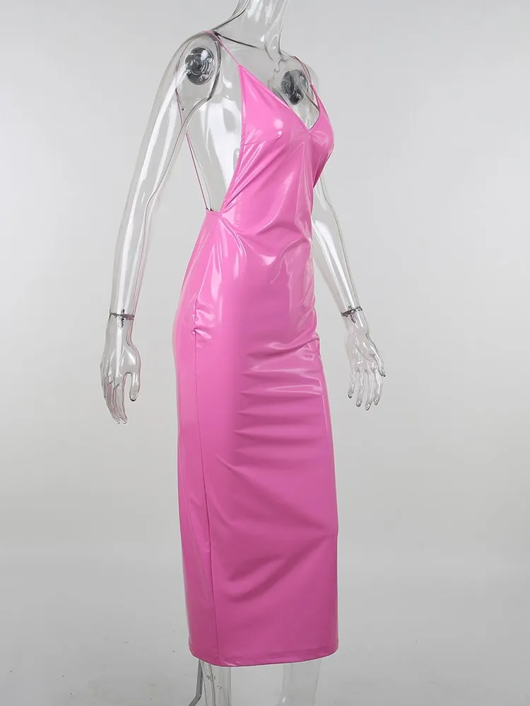 victoria’s vogue Women Party Dress Faux PU Leather V Neck Backless Sexy Fashion Bodycon Spaghetti Strap Zipper Clubwear Solid Dresses