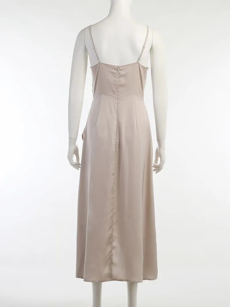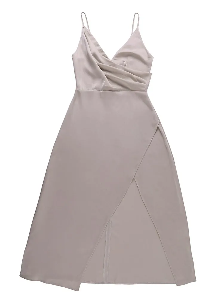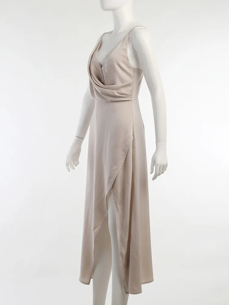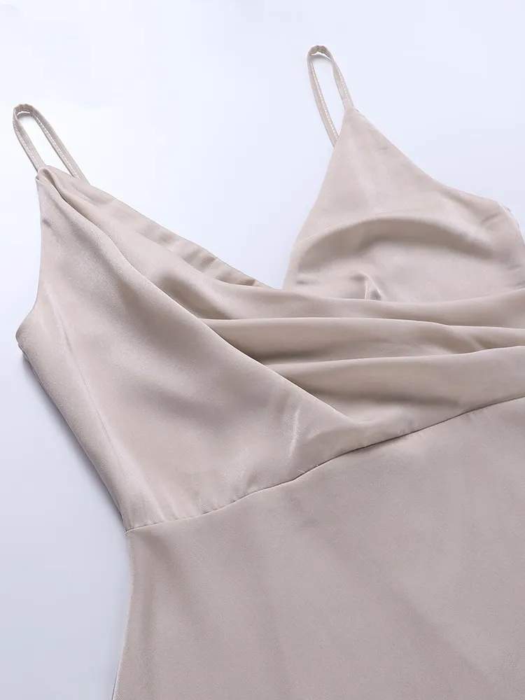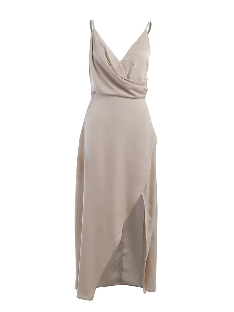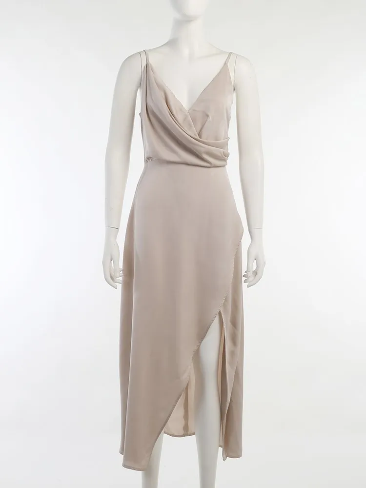 victoria’s vogue Women Party Dresses V Neck High Split Ruched Satin Sexy Elegant Sleeveless Clubwear Female Zipper Midi Vestidos