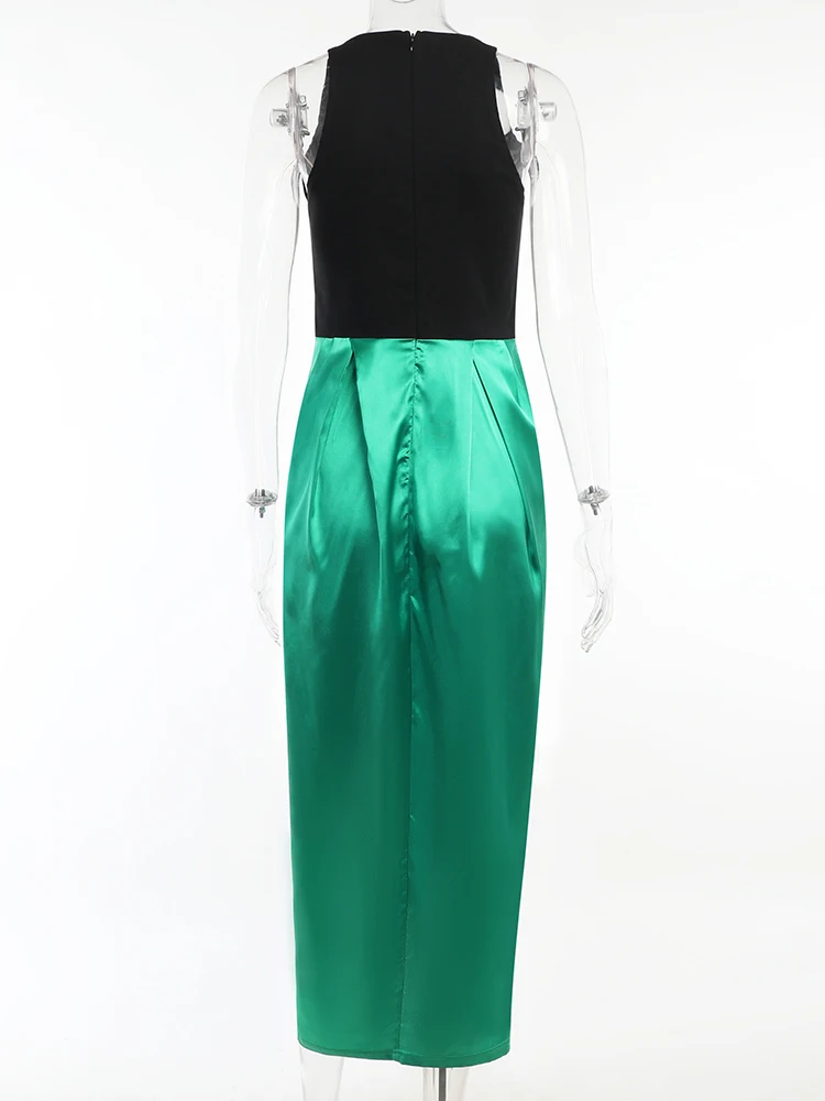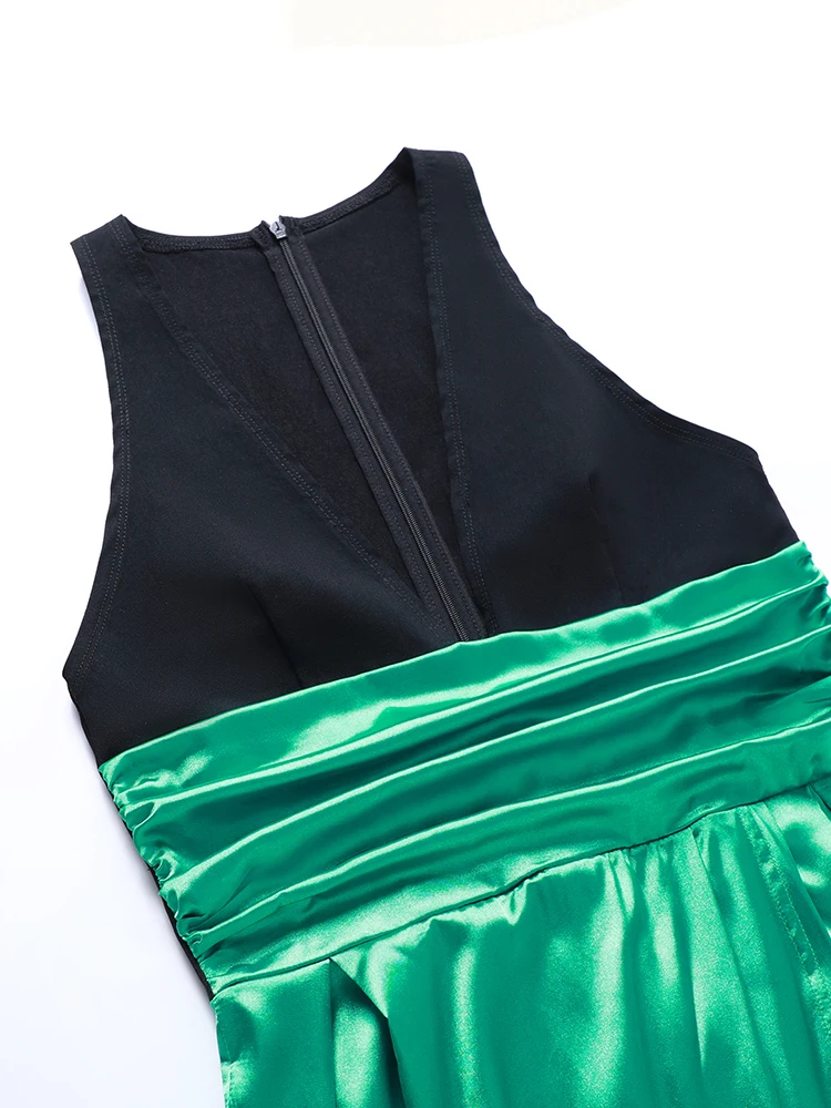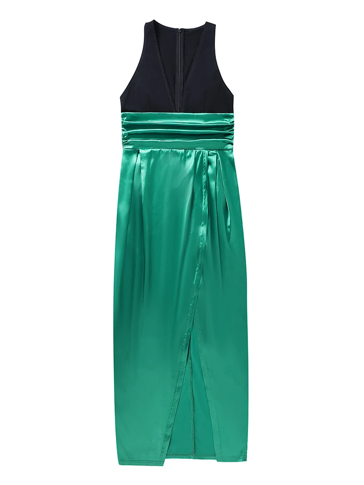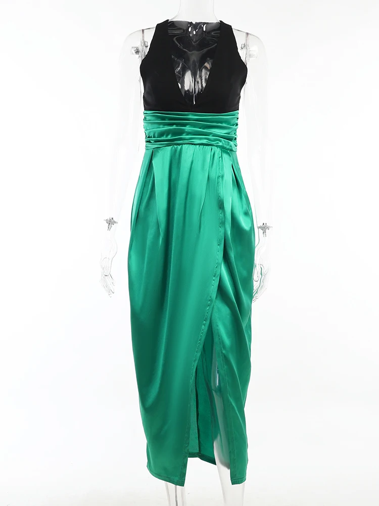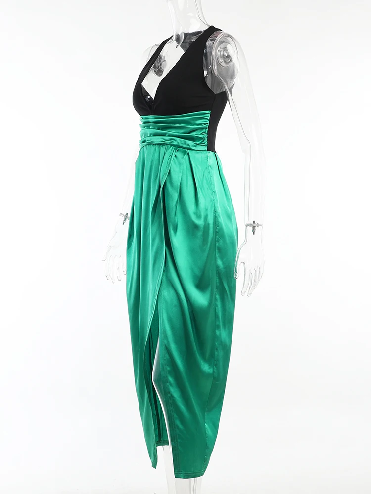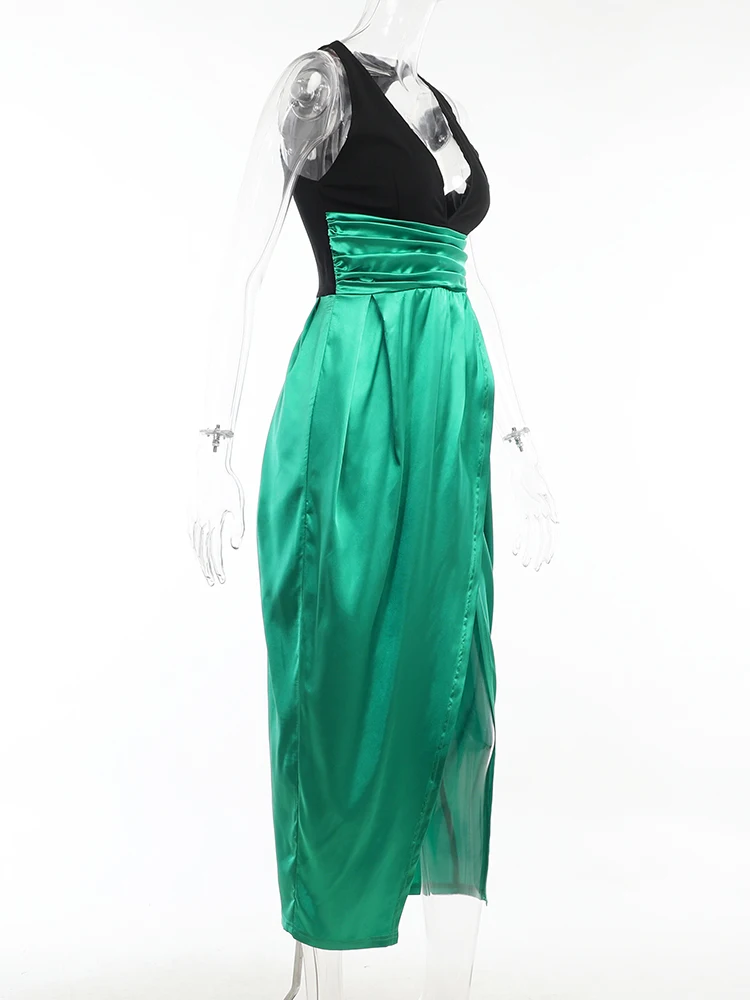 victoria’s vogue Women Party Floor Dress Deep V Neck Patchwork Silk Sleeveless Sexy High Split Elegant Fall Long Dresses