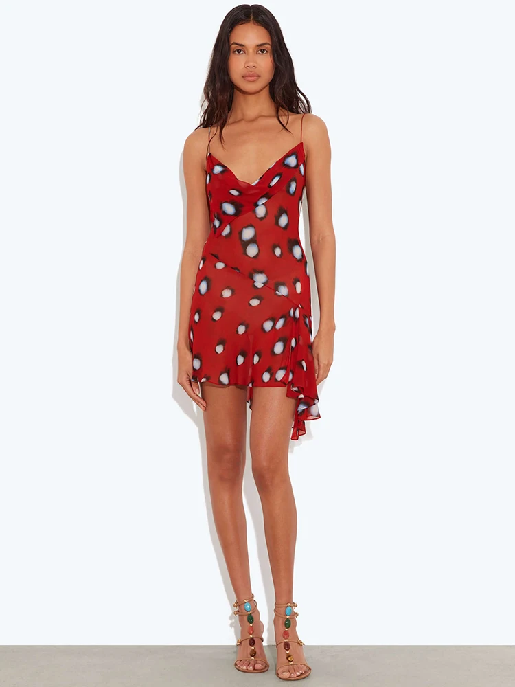 Victoria’s Vogue Women Red Polka Dot See Through Sexy Mini Dress Women Elegant Spaghetti Strap Sleeveless Backless Ruffle Slip Dress