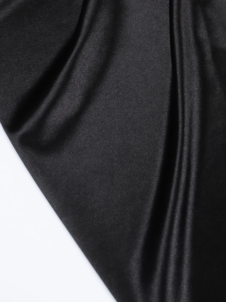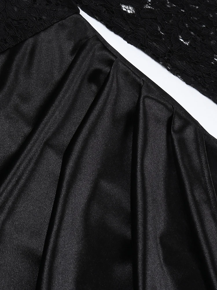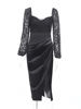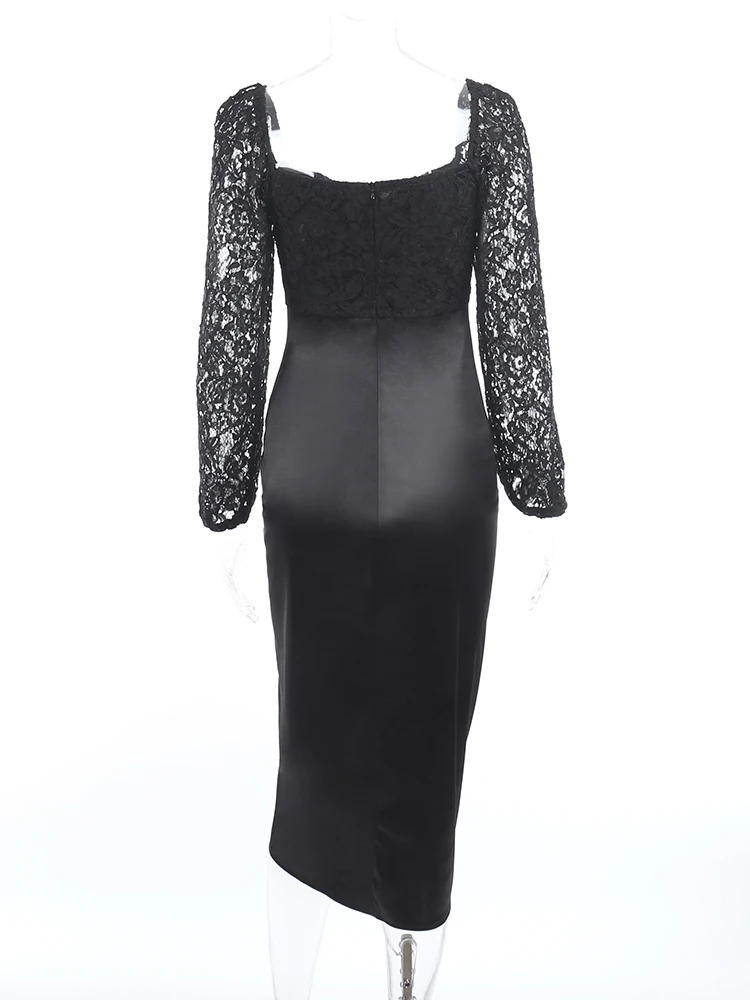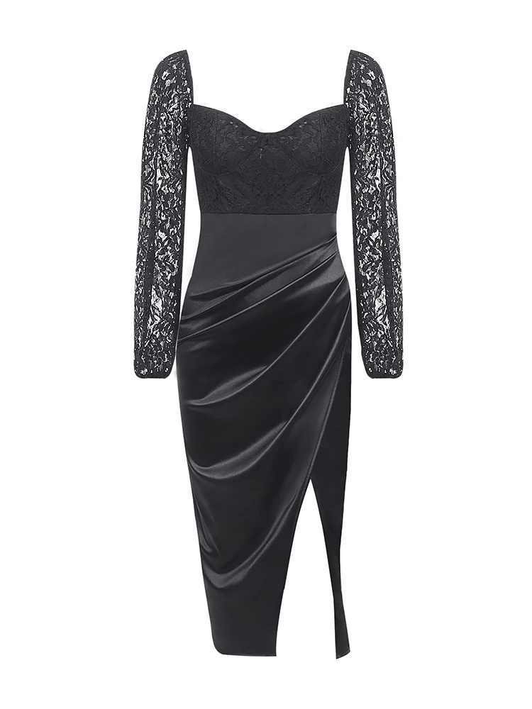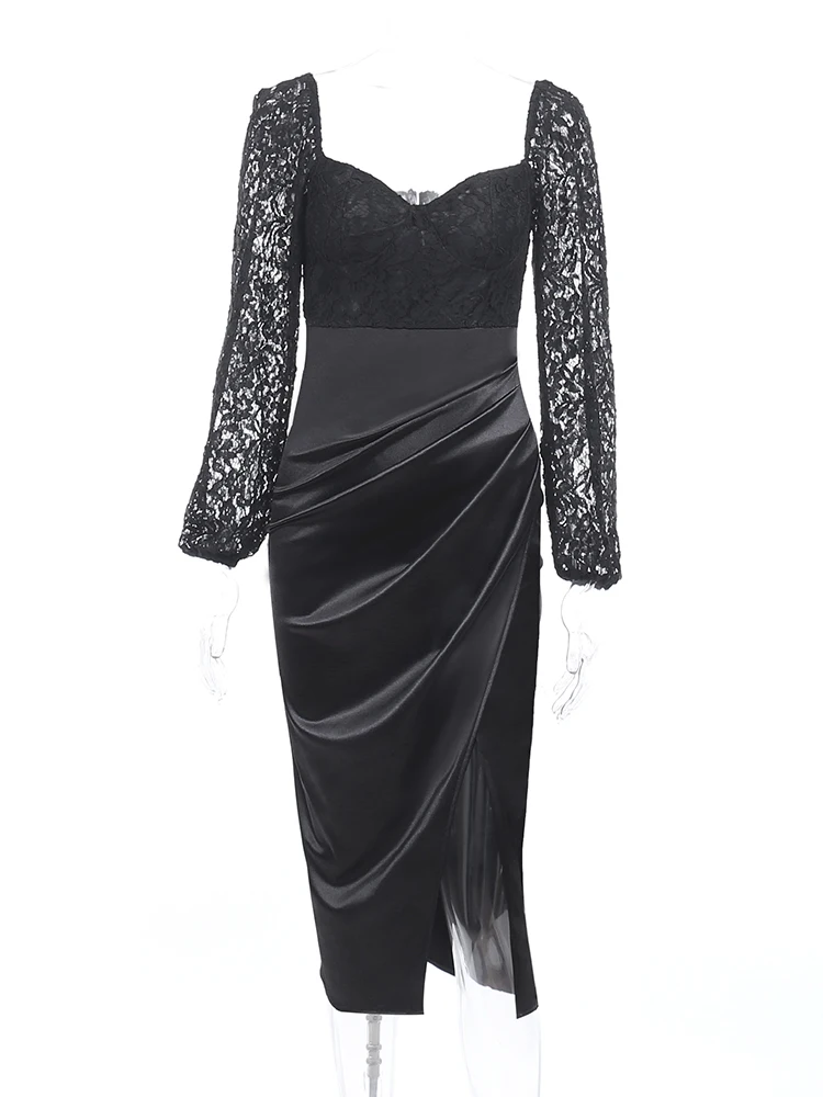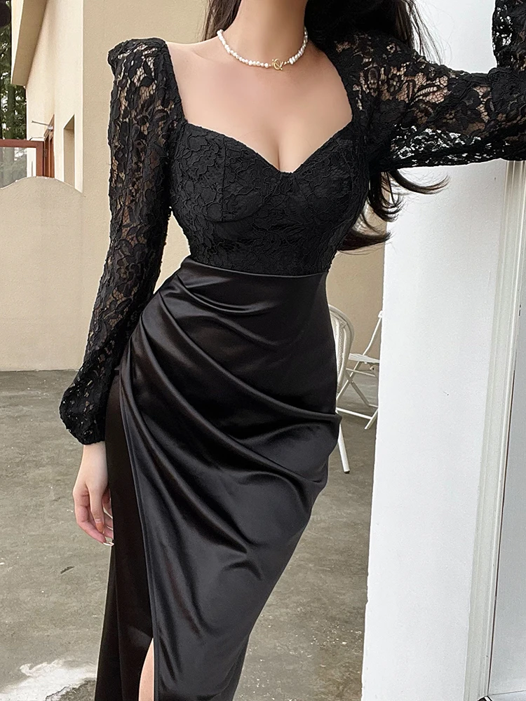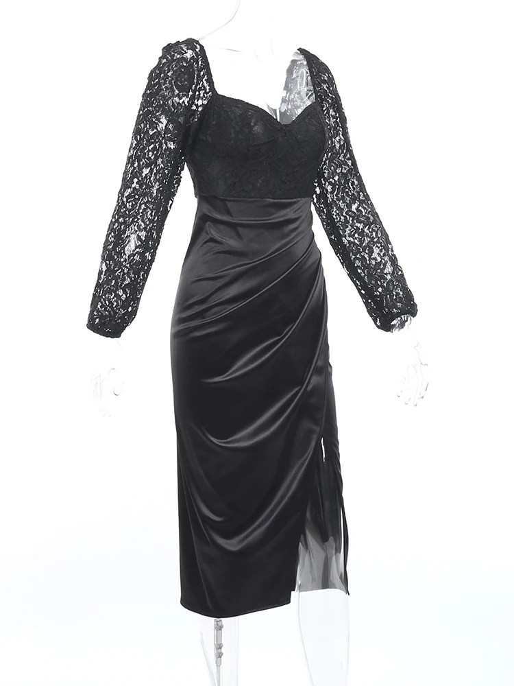 victoria’s vogue Women Satin Elegant Partywear Dress Split Lace V Neck Patchwork Ruched Autumn Black Sexy Streetwear Prom Midi Dresses