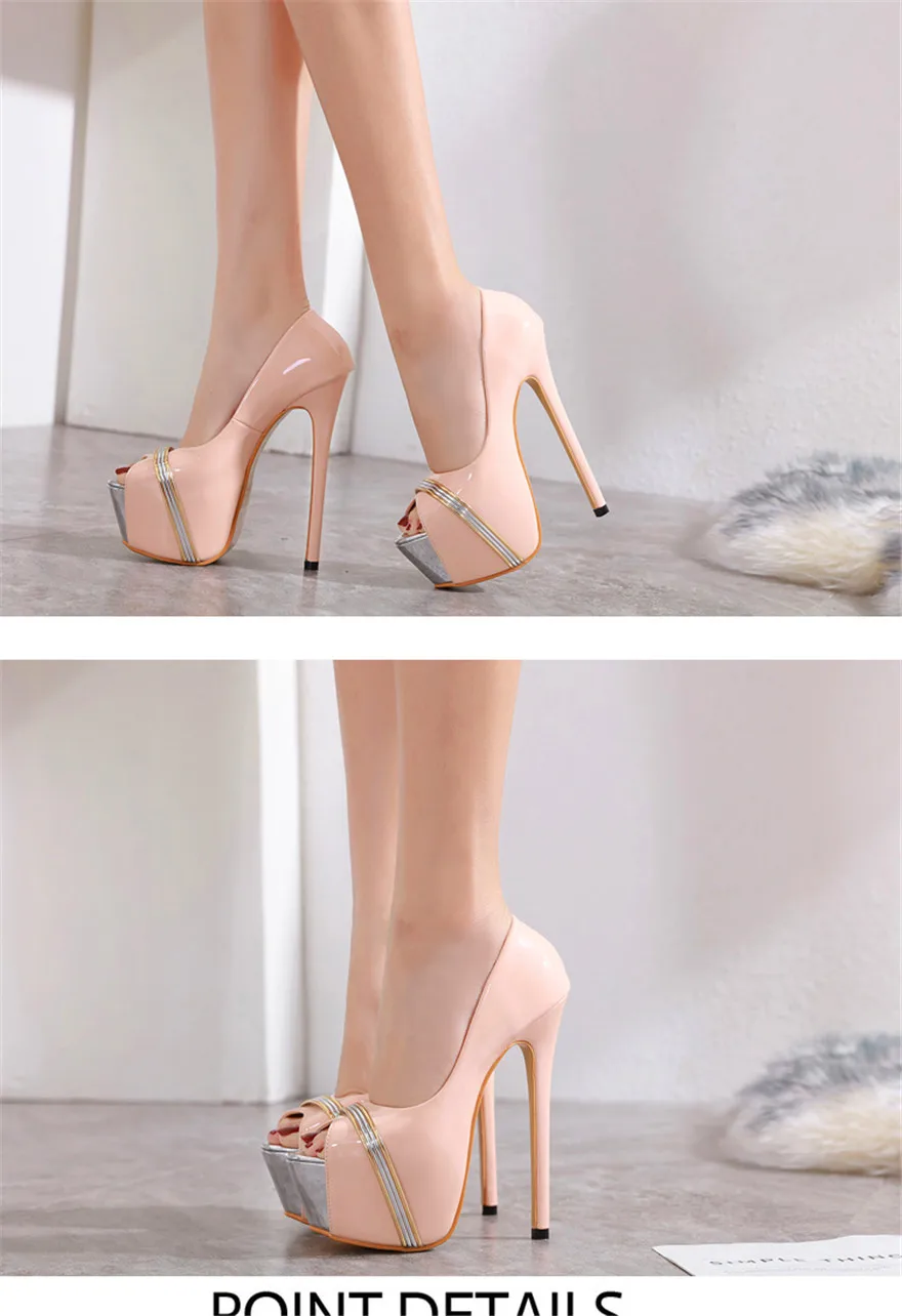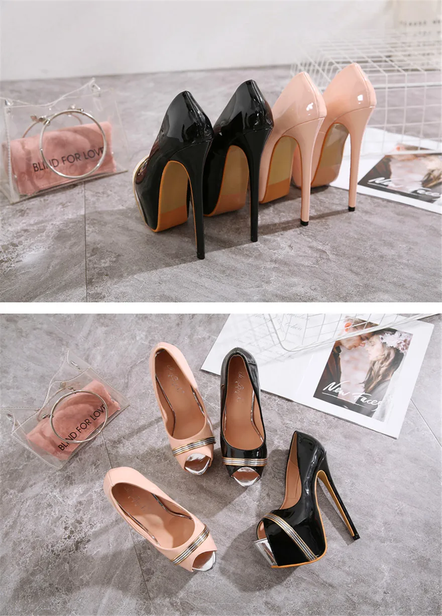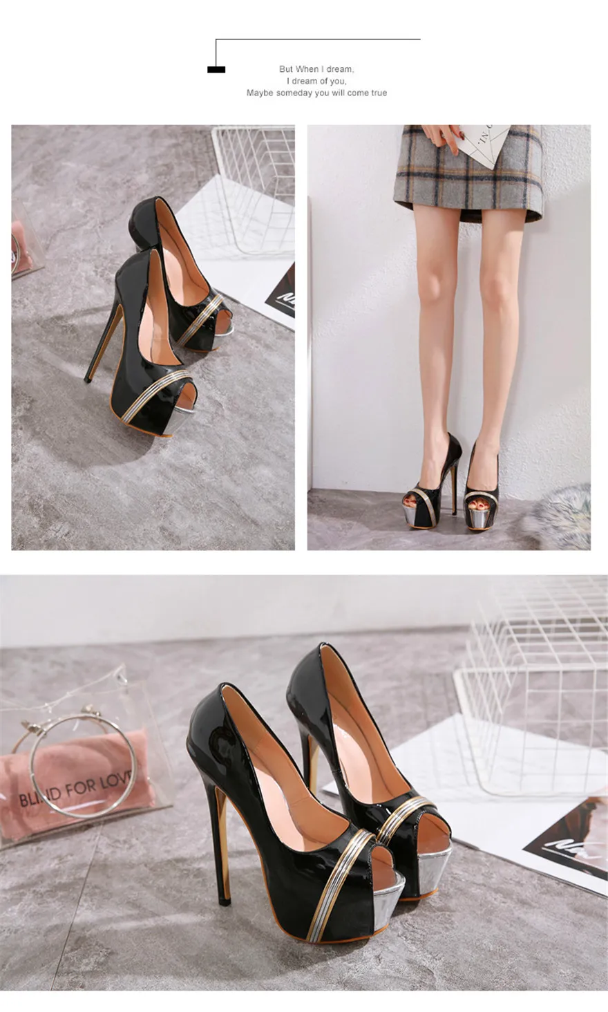Victoria’s Vogue Women Sexy 16cm Super High Heels Shoes 2021 Spring Party Peep Toe Patent Leather Pumps Platform Sweet Woman Stiletto Dress Shoes
