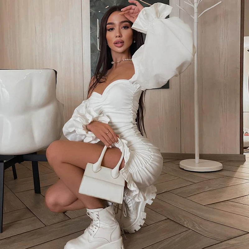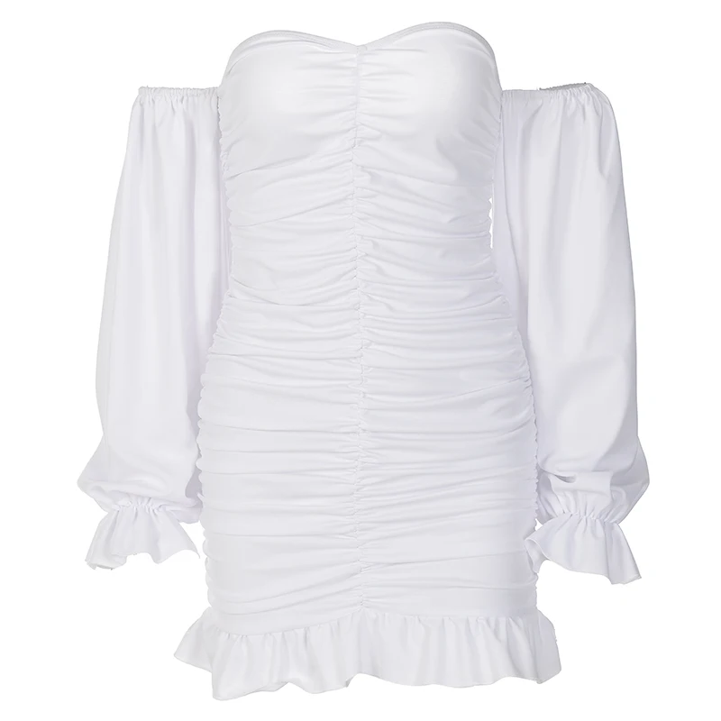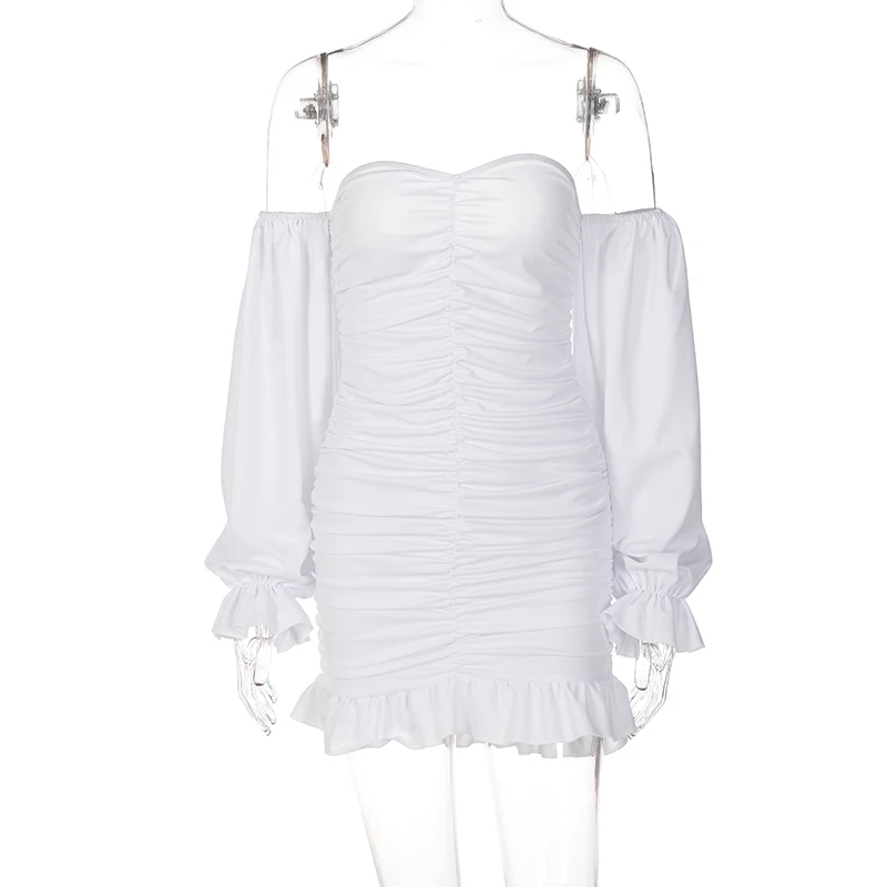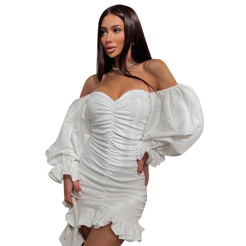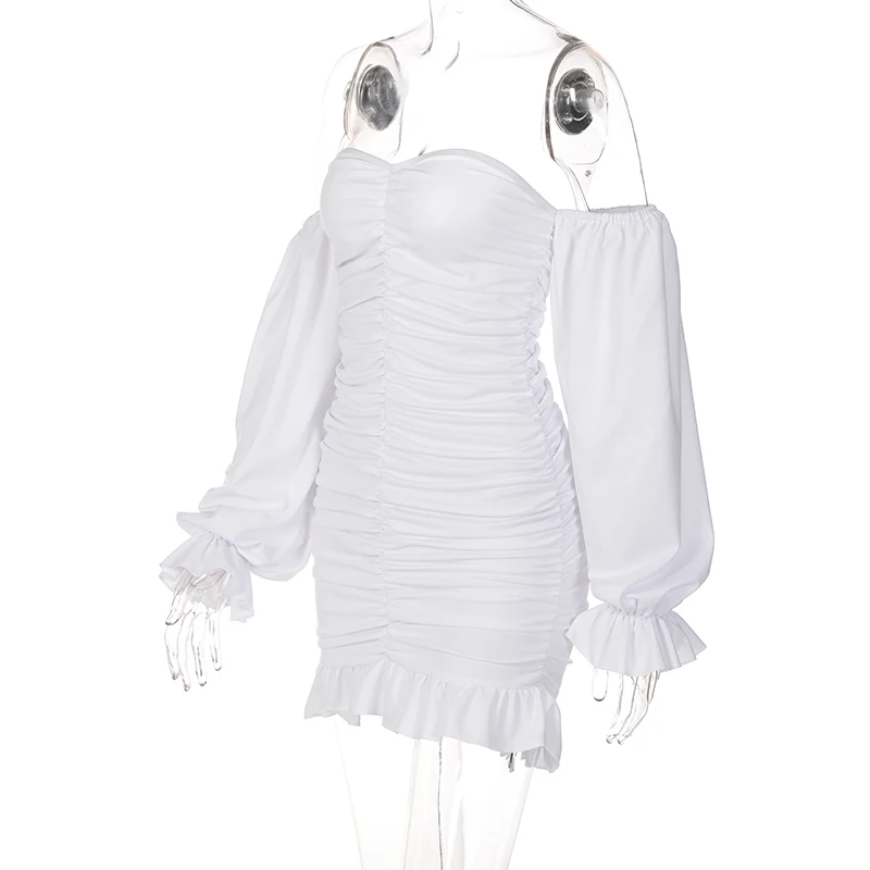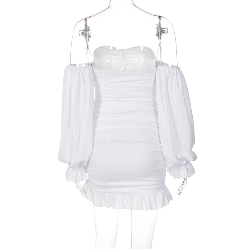 victoria’s vogue Women Solid Off Shoulder Long Loose Flare Puff Sleeve Ruched Mini Dress 2022 Autumn Streetwear Outfit Fashion Y2K