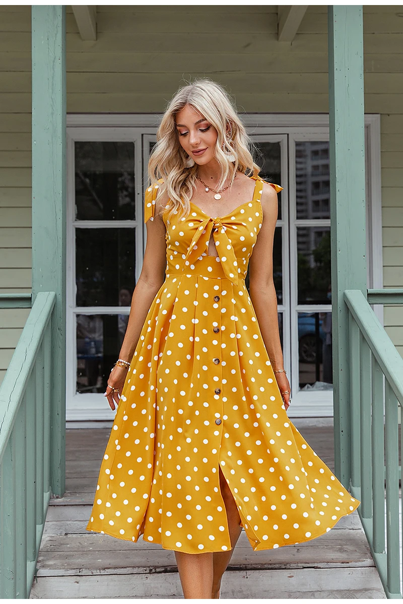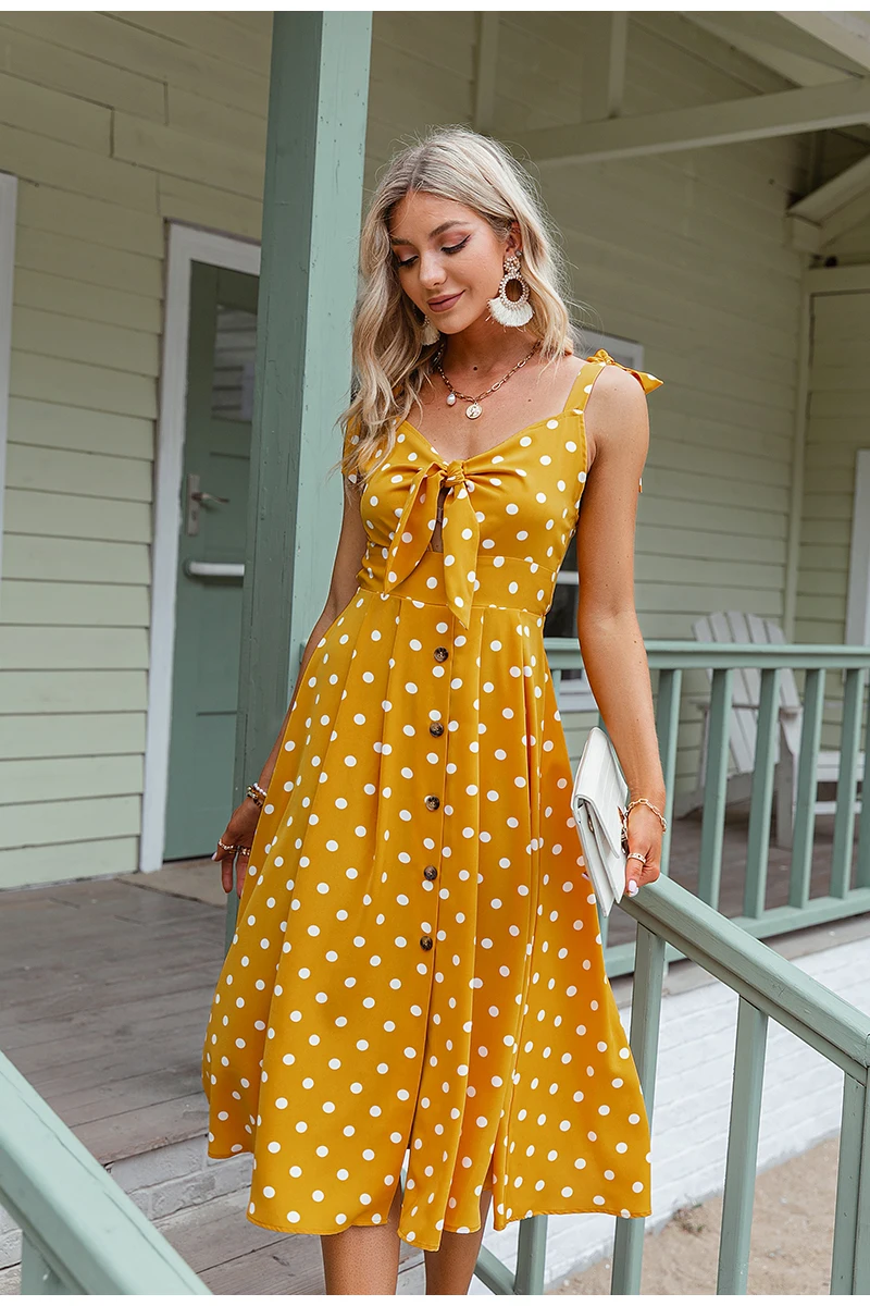 victoria’s vogue Yellow Polka Dot Print Spaghetti Strap Dress Sexy V-neck Summer Women Dress with Bow 2022 Boho Sleeveless Wrap Vestidos