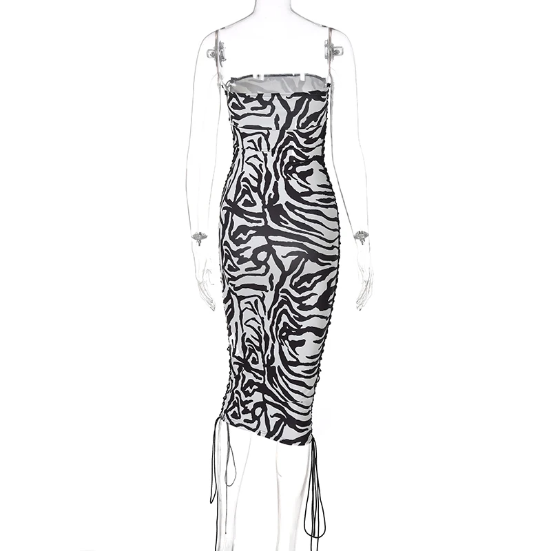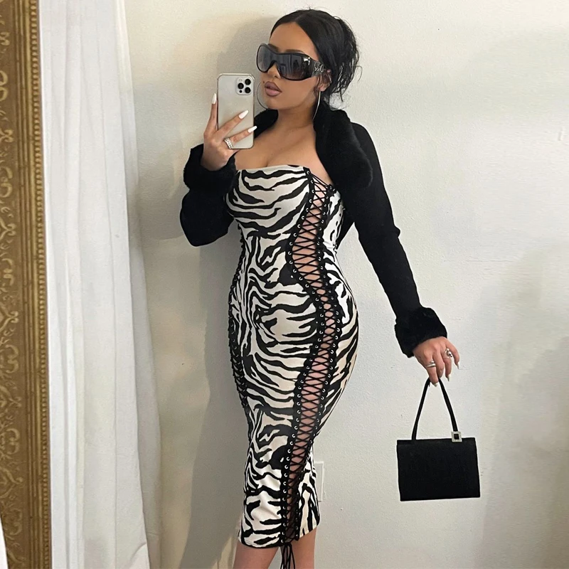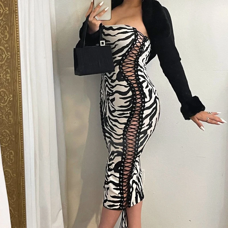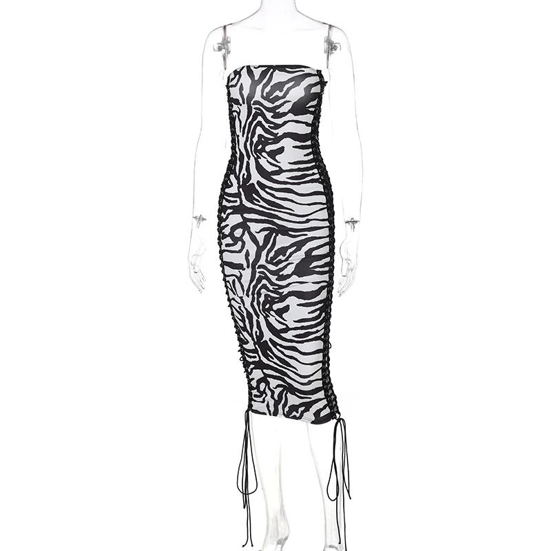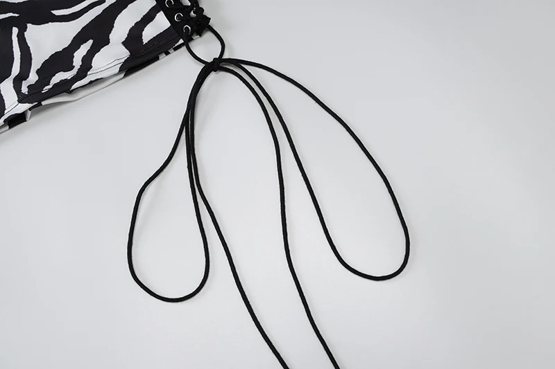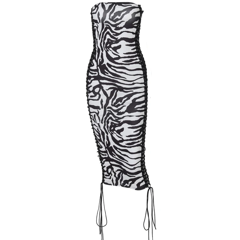 victoria’s vogue Zebra Print Off Shoulder Sleeveless Drawstring Bandage Crop Out Maxi Dress 2021 Fall Women Fashion Sexy Casual Outfit
