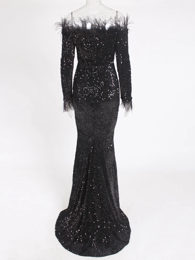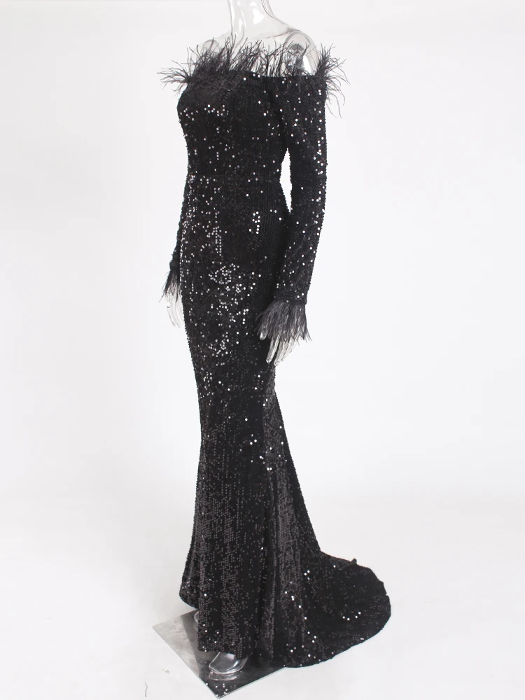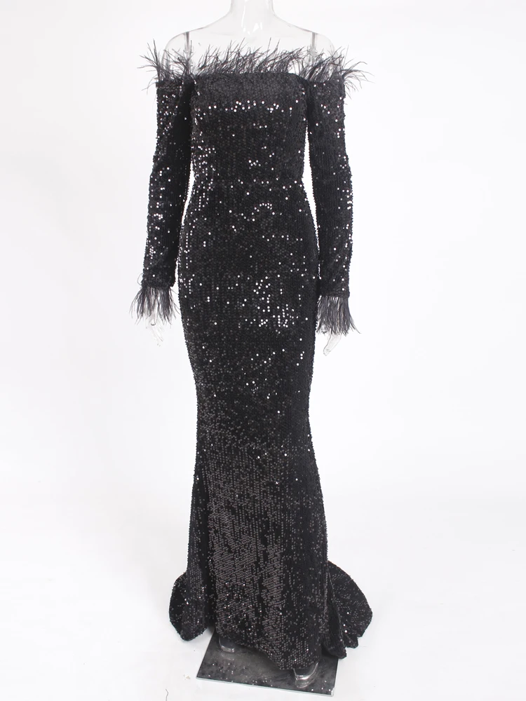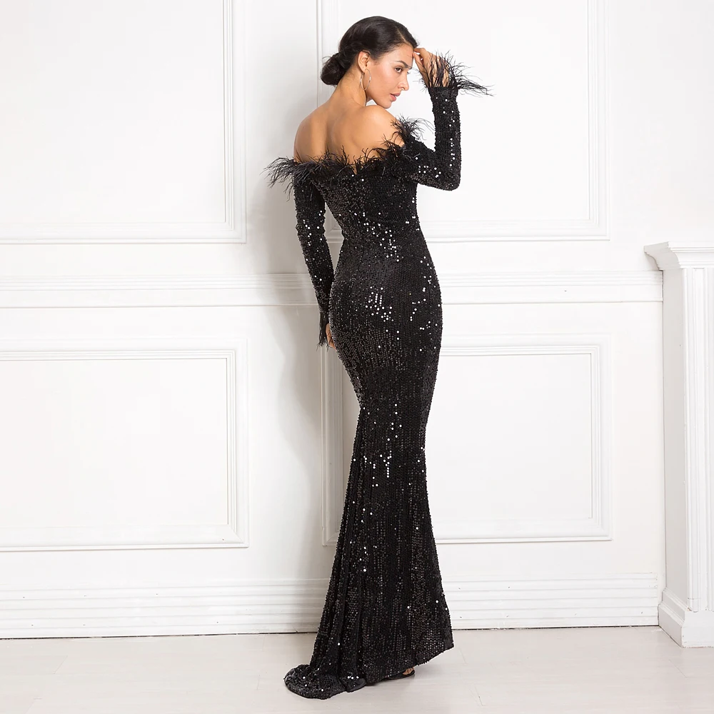 victoria’svogue 2021 Black Feather Patchwork Sequined Maxi Dress Slash Neck Stretch Bodycon Floor Length Sleeveless Long Evening Party Dress Gown
