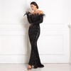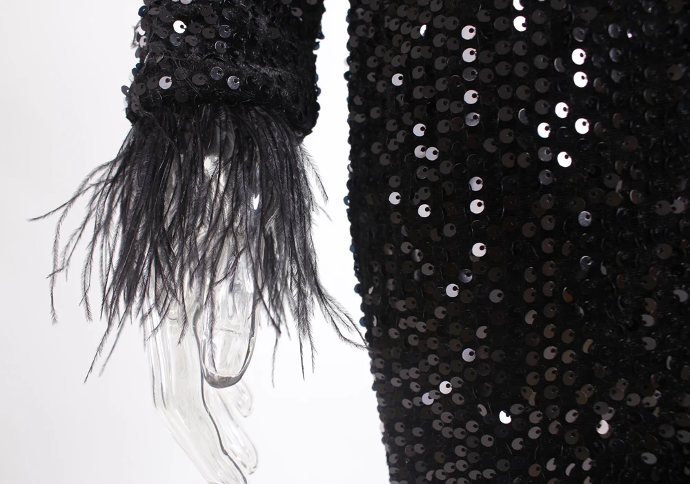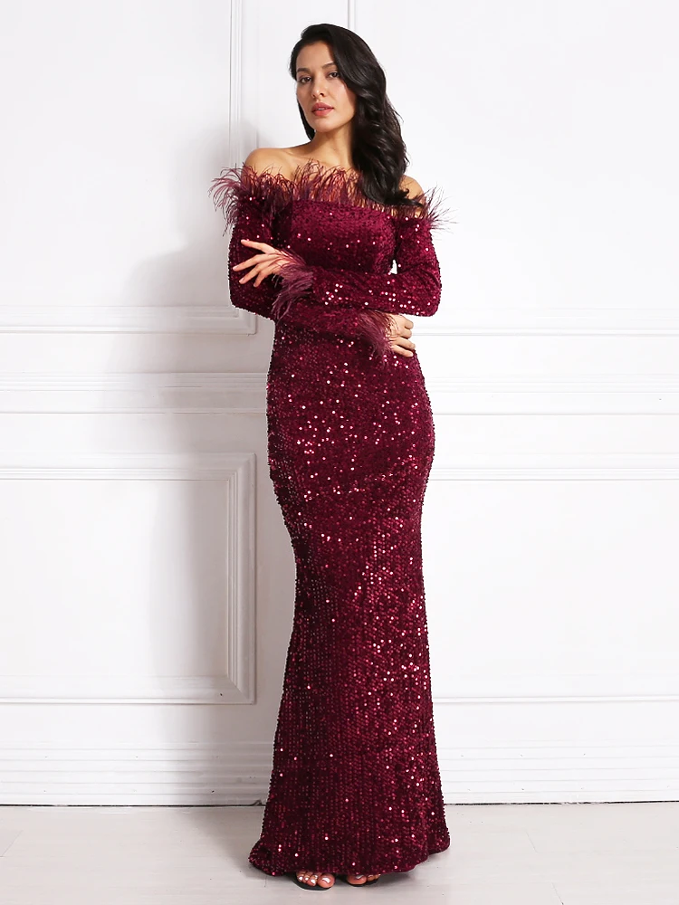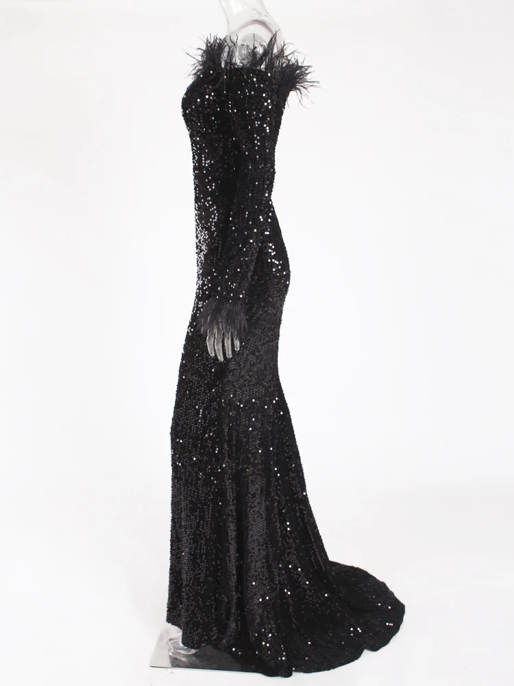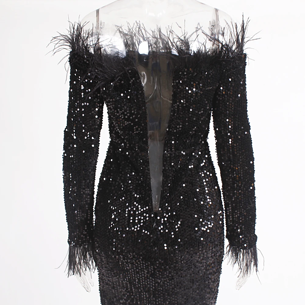 victoria’svogue 2021 Black Feather Patchwork Sequined Maxi Dress Slash Neck Stretch Bodycon Floor Length Sleeveless Long Evening Party Dress Gown