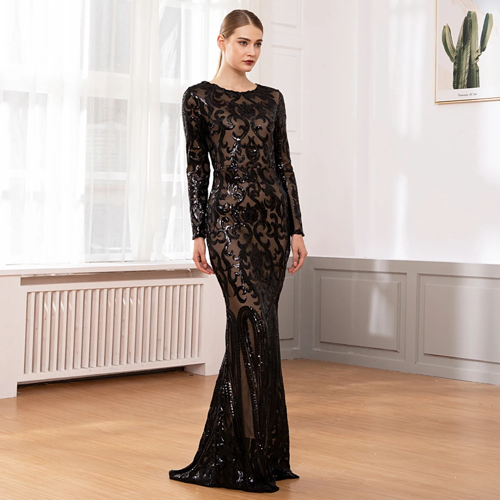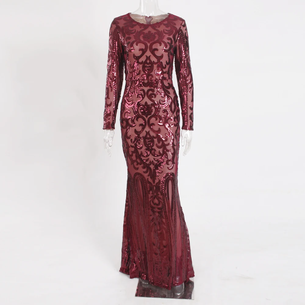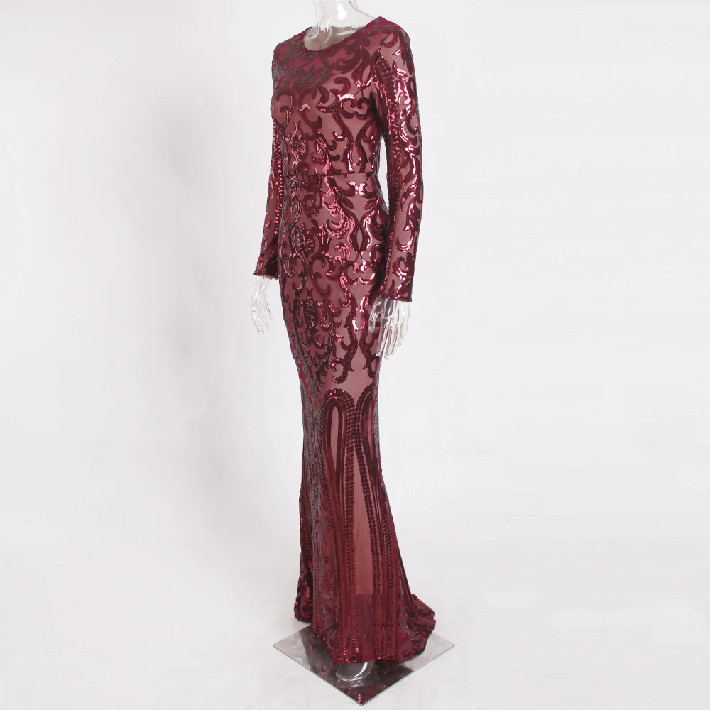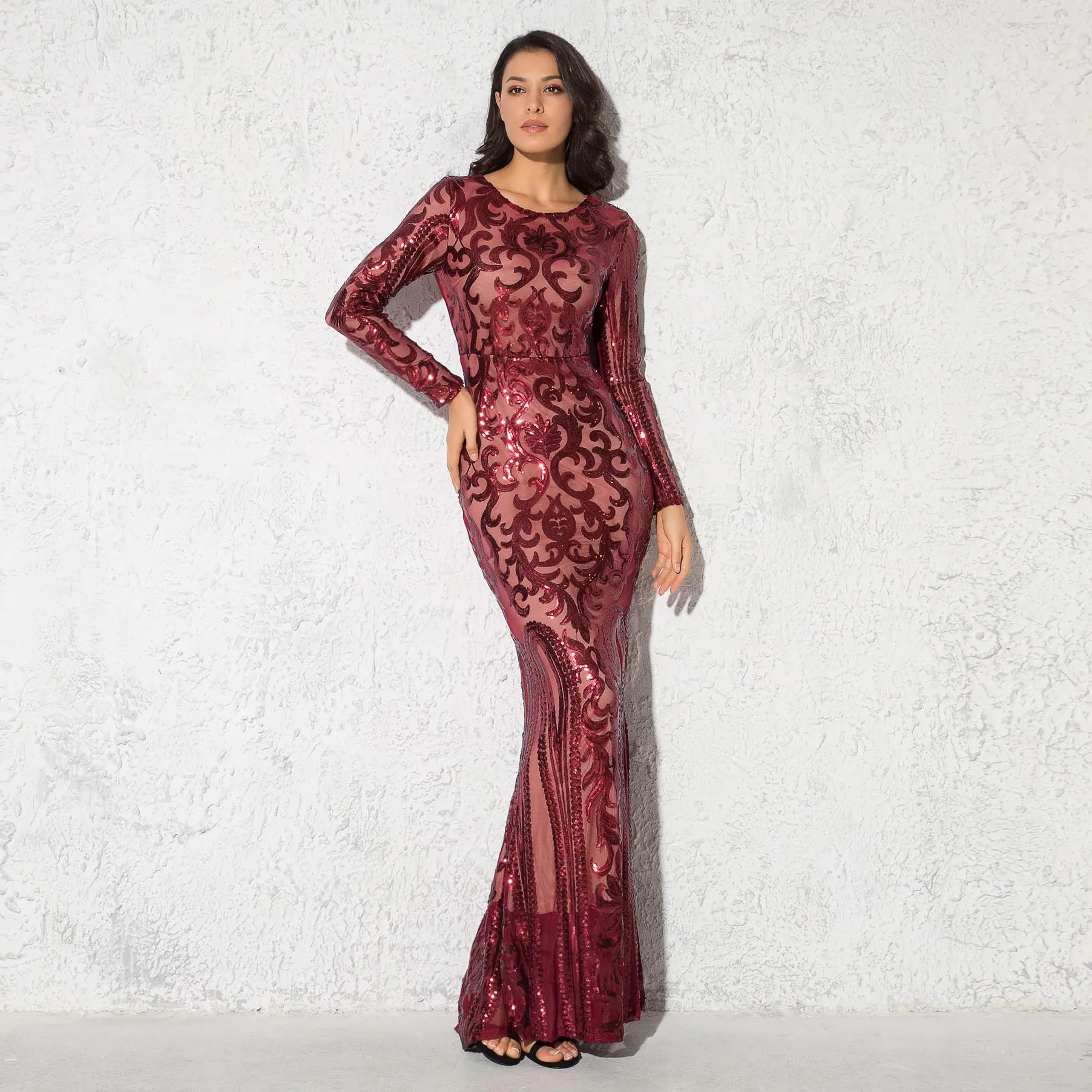 victoria’svogue 2021 Gold Elegant Full Sleeved O Neck Sequined Evening Party Dress Stretch Floor Length Lining Bodycon Burgundy Black Maxi Dress