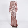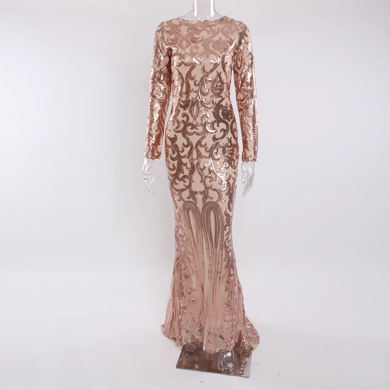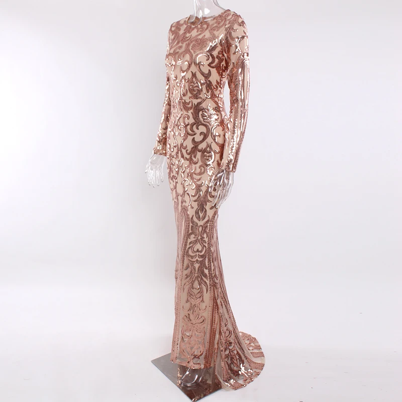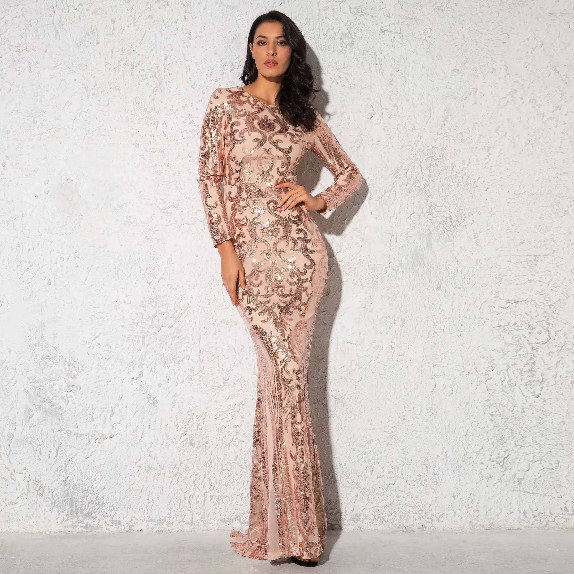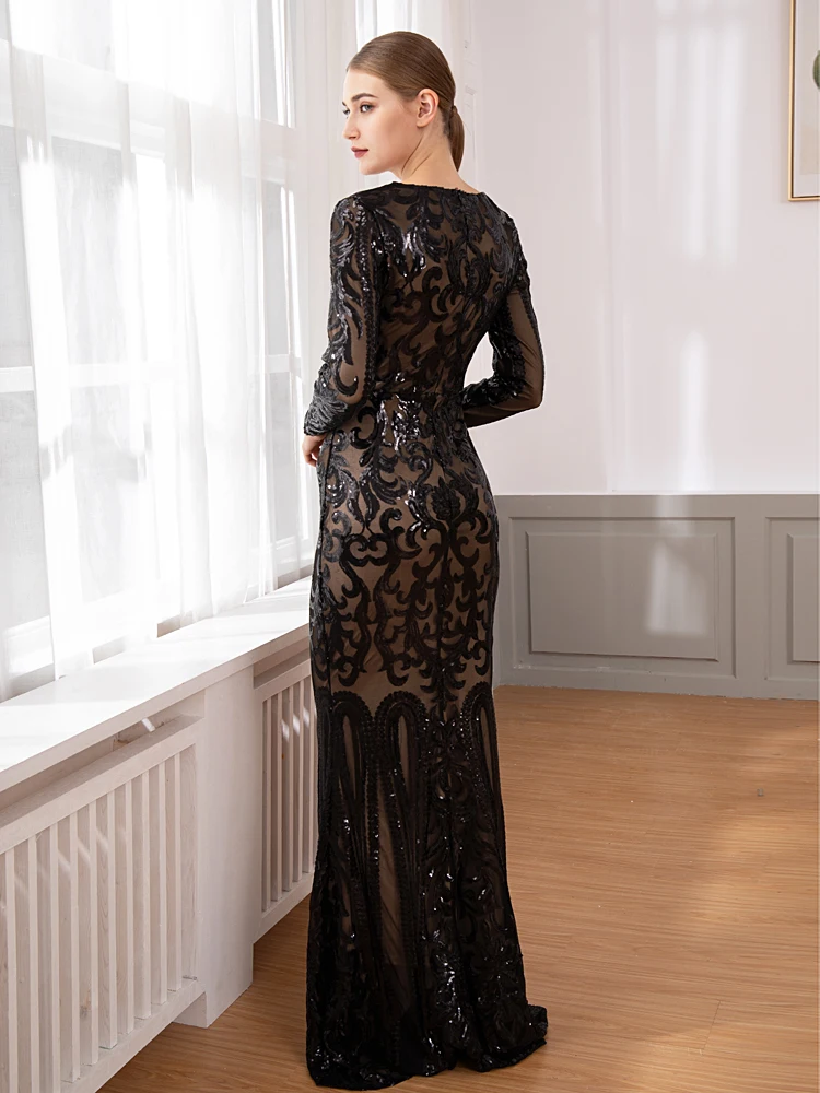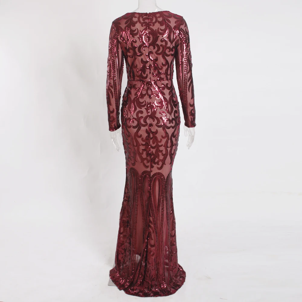 victoria’svogue 2021 Gold Elegant Full Sleeved O Neck Sequined Evening Party Dress Stretch Floor Length Lining Bodycon Burgundy Black Maxi Dress