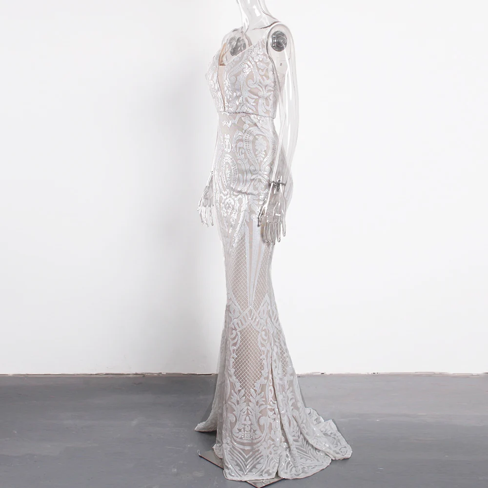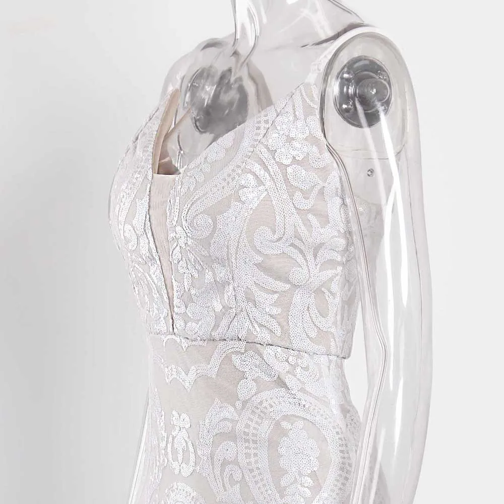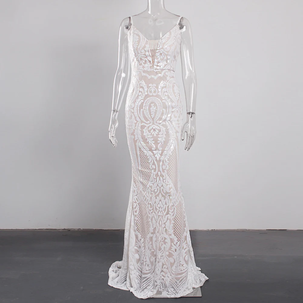 victoria’svogue 2021 White Sequin Nude Lining V Neck Backless Long Dress Evening Party Stretch Sleeveless Elegant Mermaid Gown
