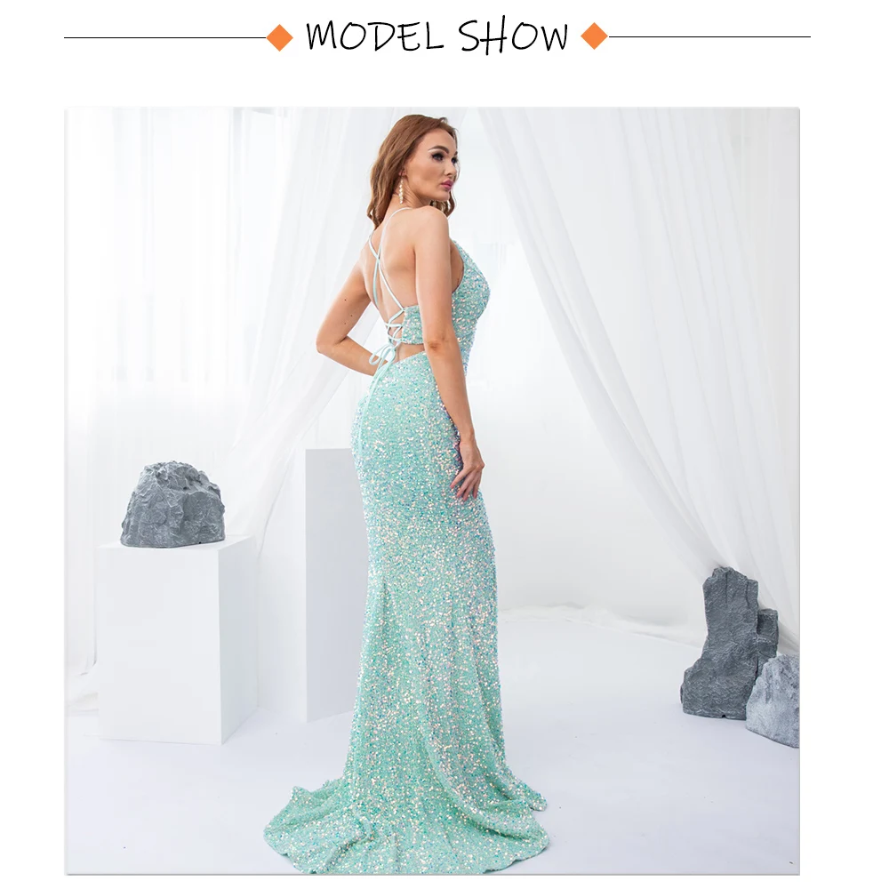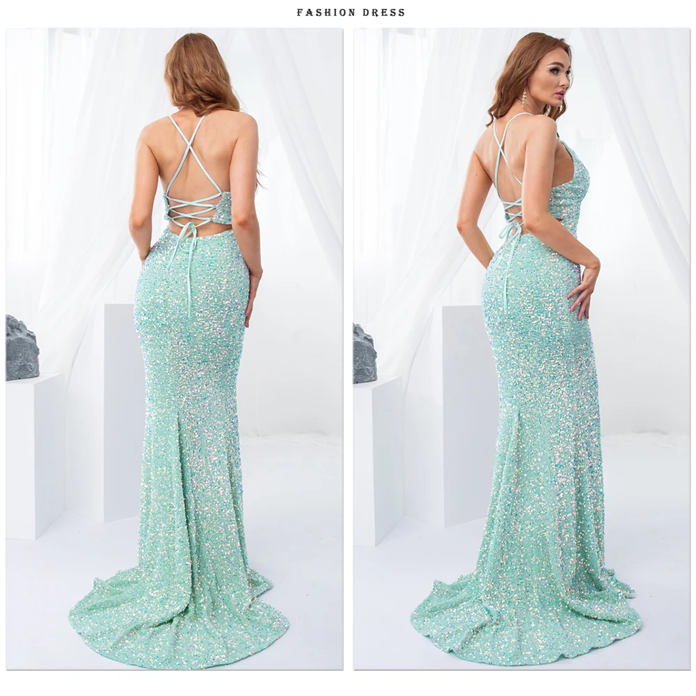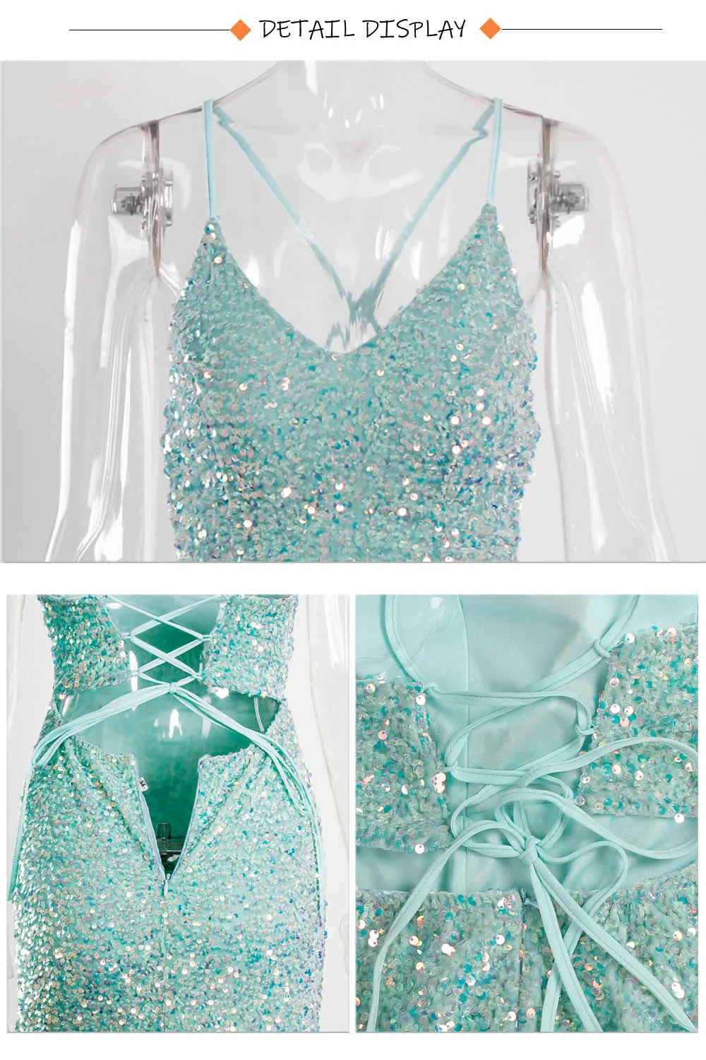 Victoriasvogue Luxury Mint Sequin Slip Lace Up Long Cocktail Party Dress Backless Hollow Out Velvet V Neck Maxi Gown Celebrity Women Summer