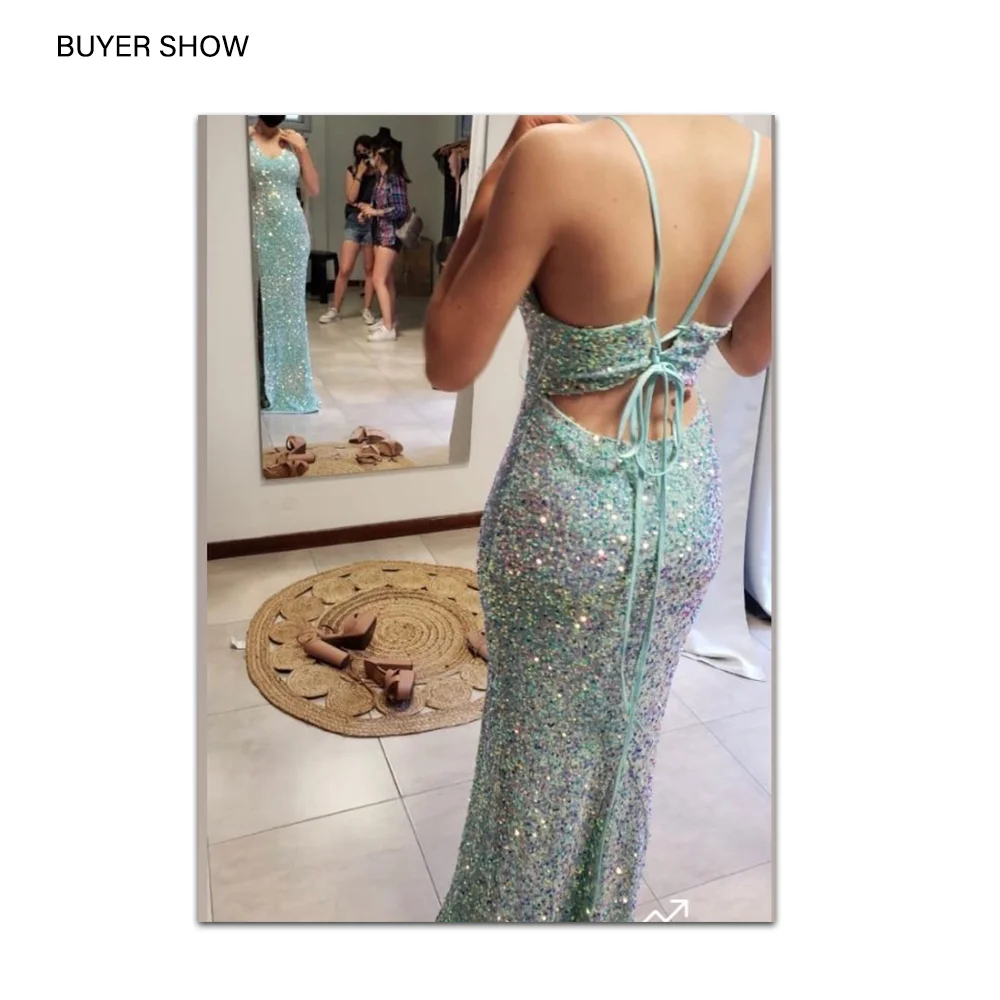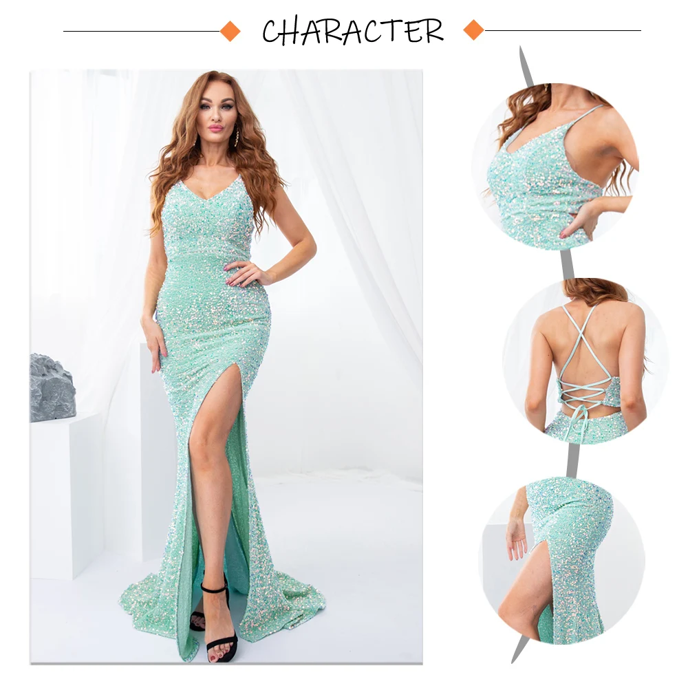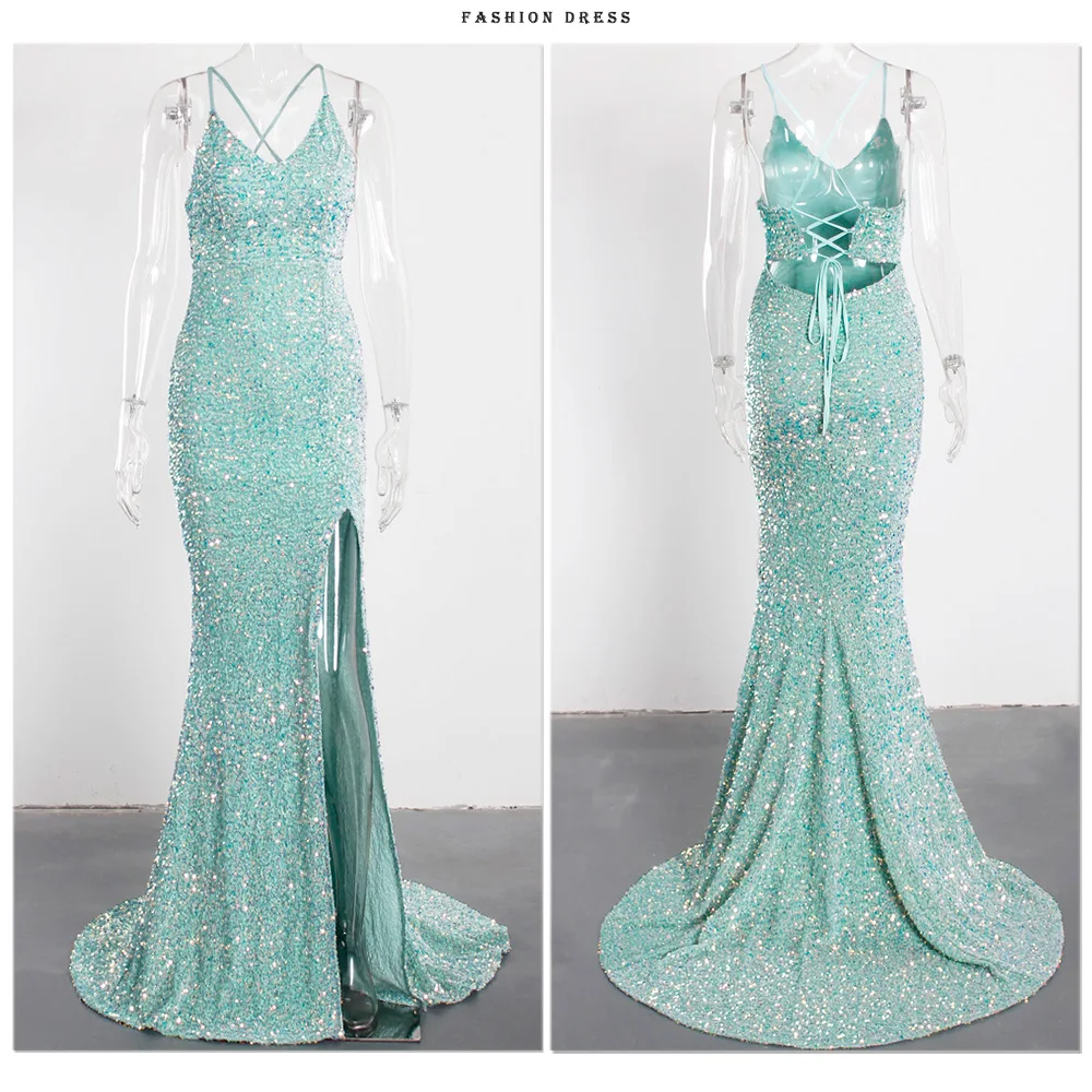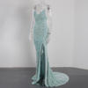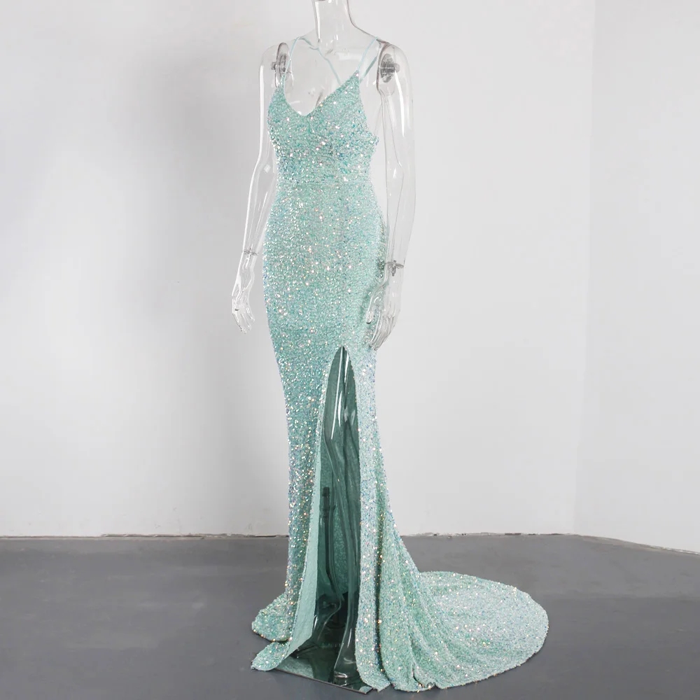 Victoriasvogue Luxury Mint Sequin Slip Lace Up Long Cocktail Party Dress Backless Hollow Out Velvet V Neck Maxi Gown Celebrity Women Summer
