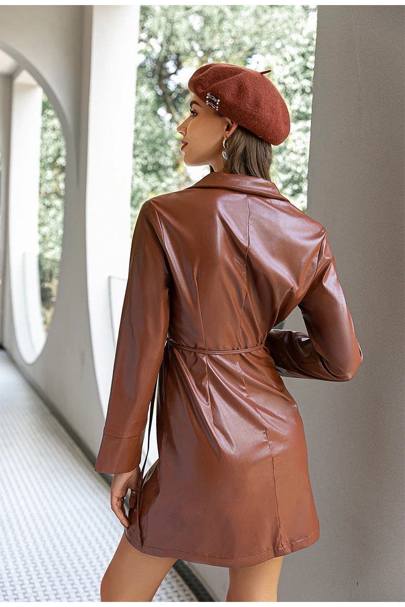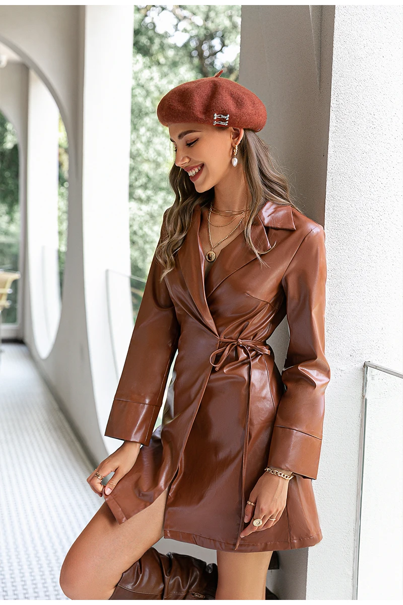 victoria’s vogue Office pu leather v-neck long sleeves lace up mini dress women A-line blazer collar autumn dresses Vintage solid vestido