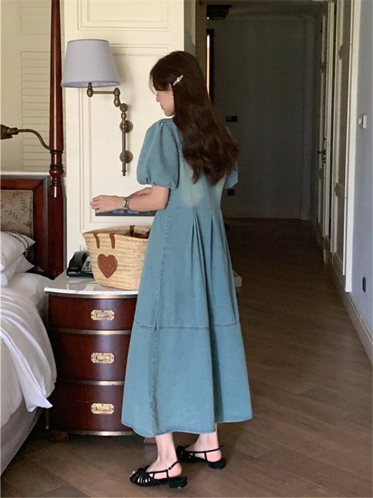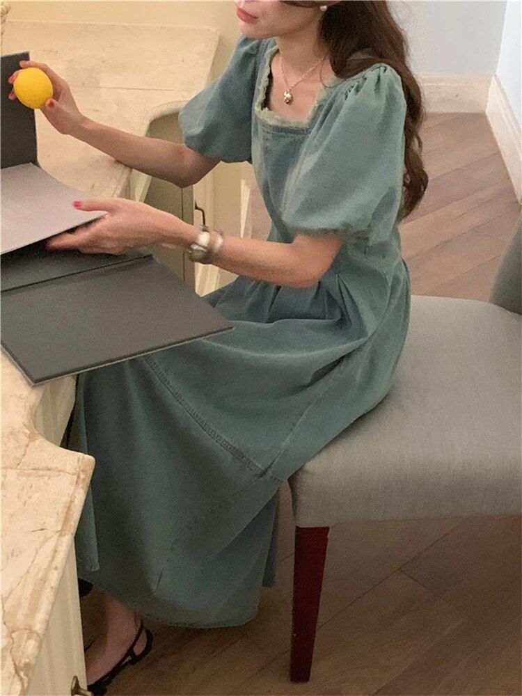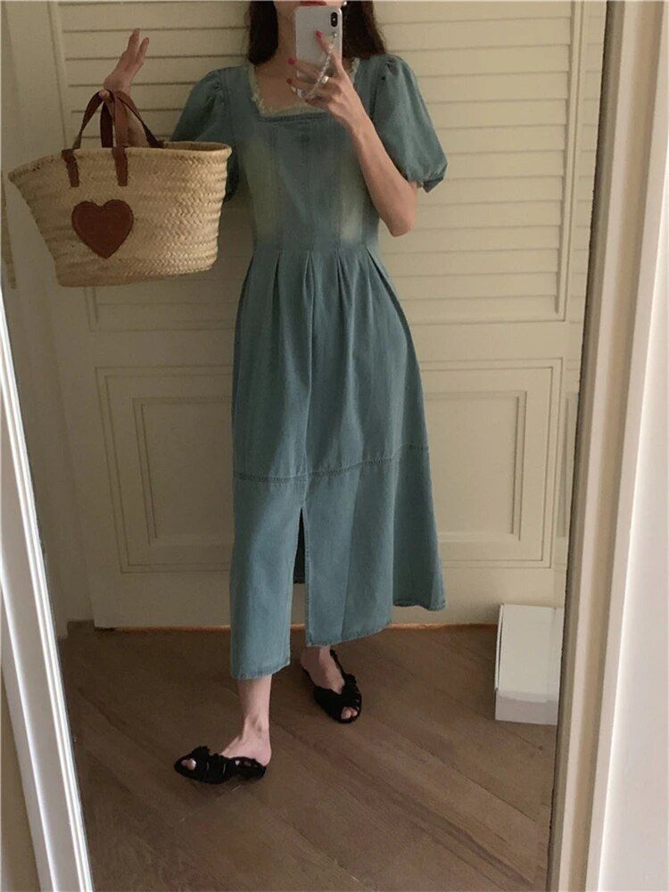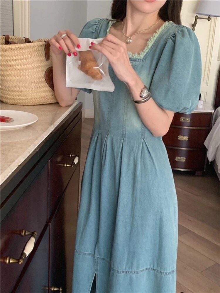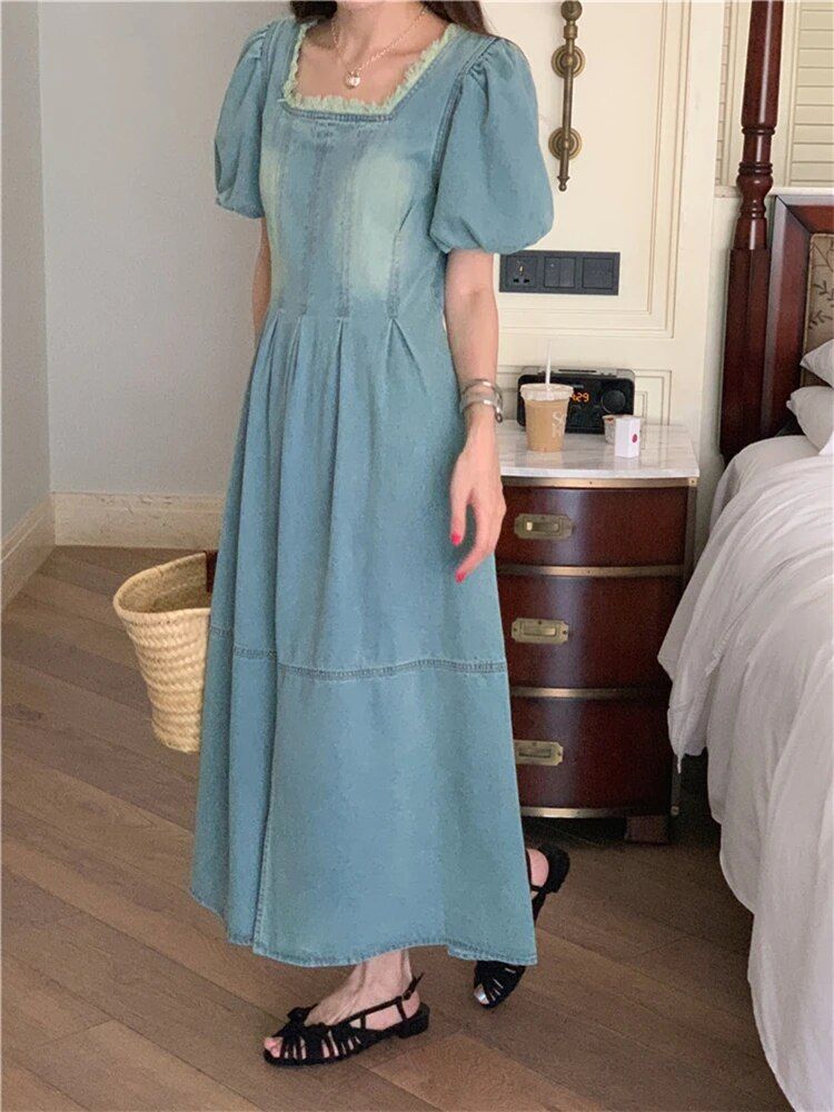 Step into the season with our High-Waist Denim Dress that perfectly marries vintage charm with modern fashion sensibilities. Designed to flatter with a nod to classic Korean fashion, this dress is a must-have for those who covet a look that’s both elegant and comfortable. Its raw edge and square collar accentuate your neckline, while the empire waist gives the illusion of length, making it a dress that’s ideal for any spring or summer occasion.