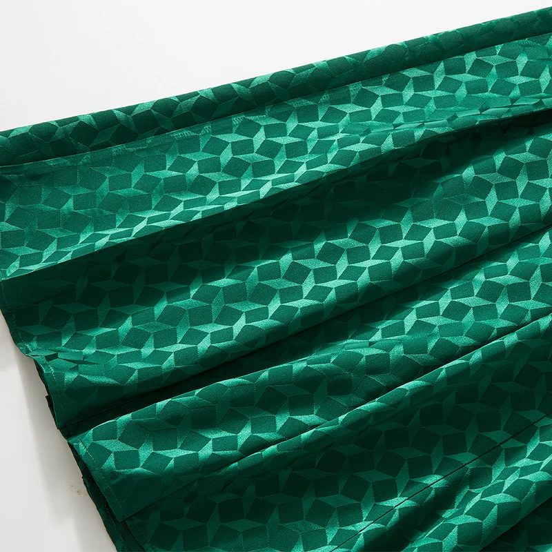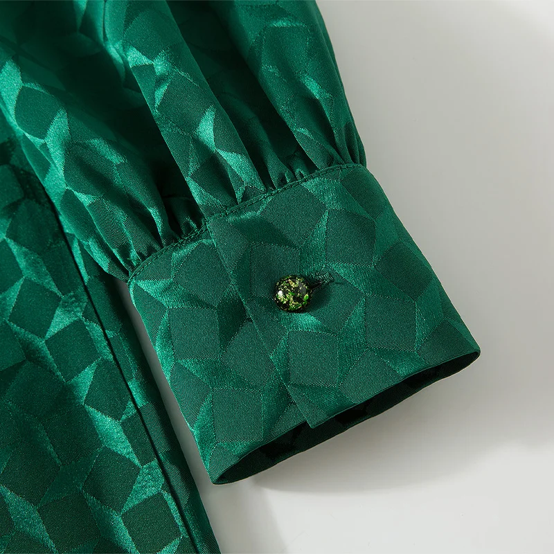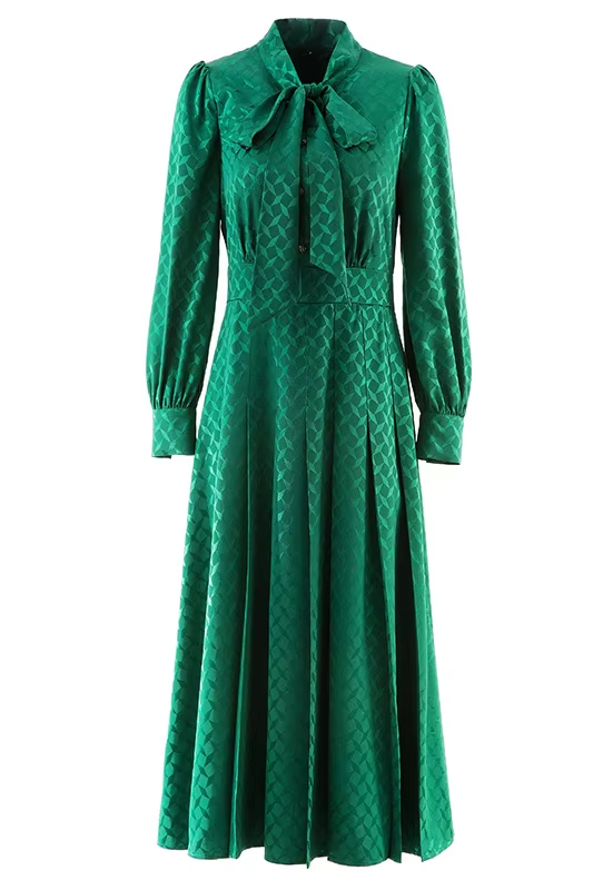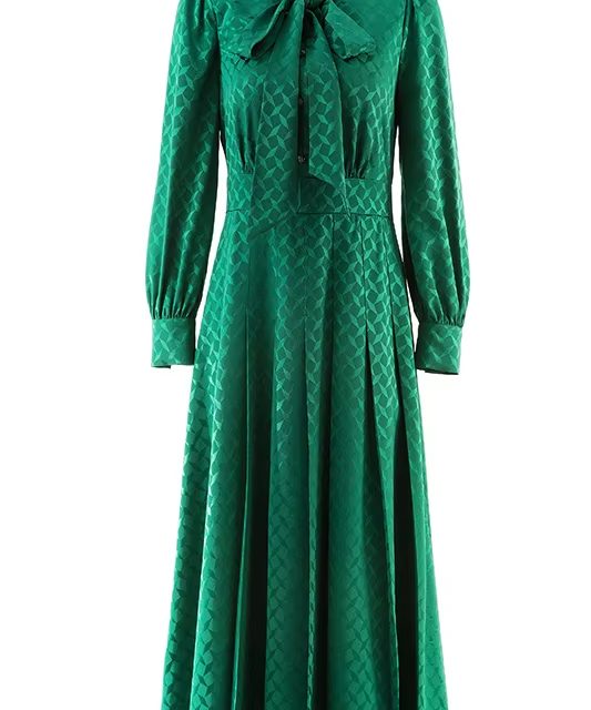 Victoria’s Vogue Women Elegant Pleated Long Dress High Quality Fashion Green Large Swing Bow Collar Buttons Long Sleeve High Waist Holiday Dress