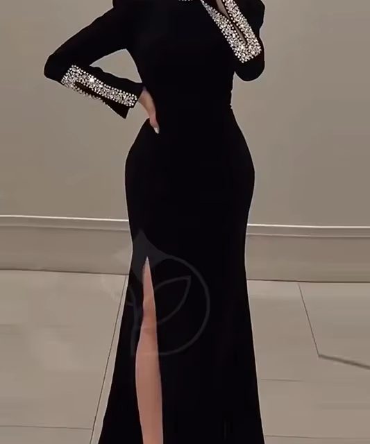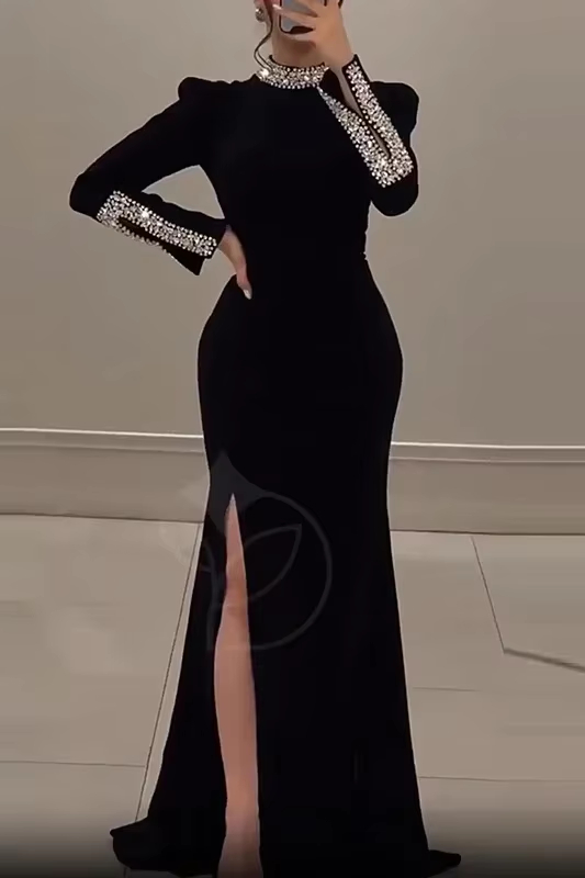 Victoria’s Vogue Women Elegant Solid High Slit Party Dress Temperament Long Sleeve Slim Evening Gala Dress Turtleneck Rhinestone Banquet Dresses