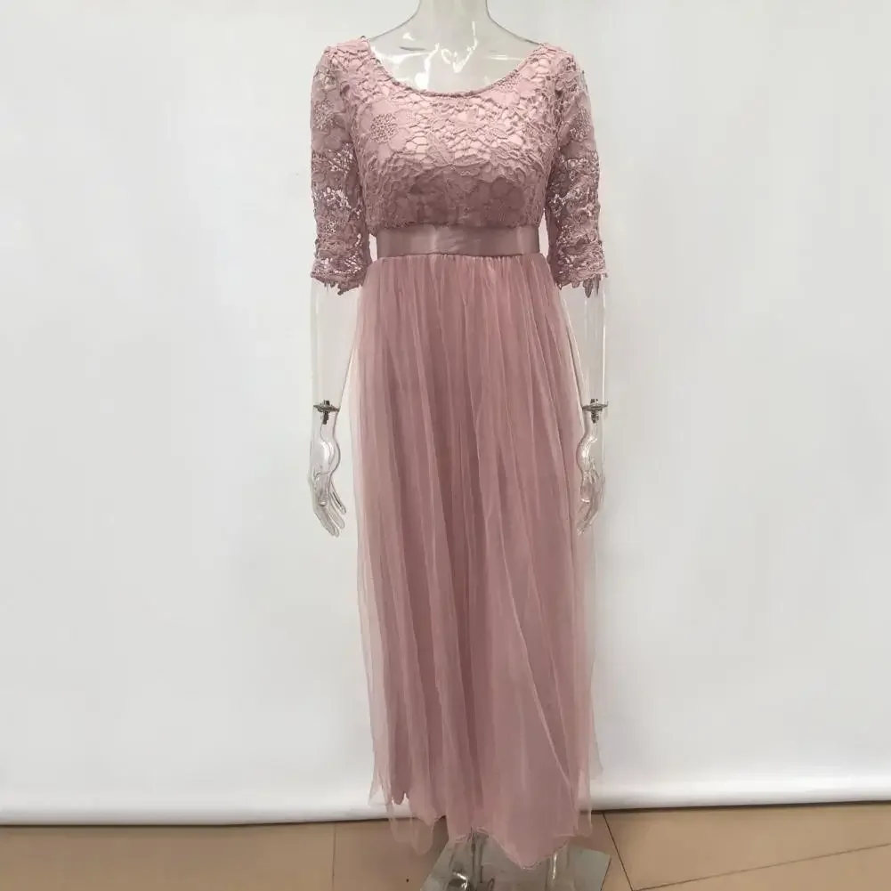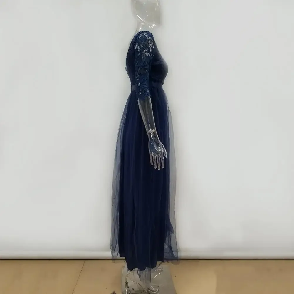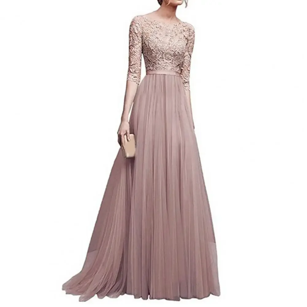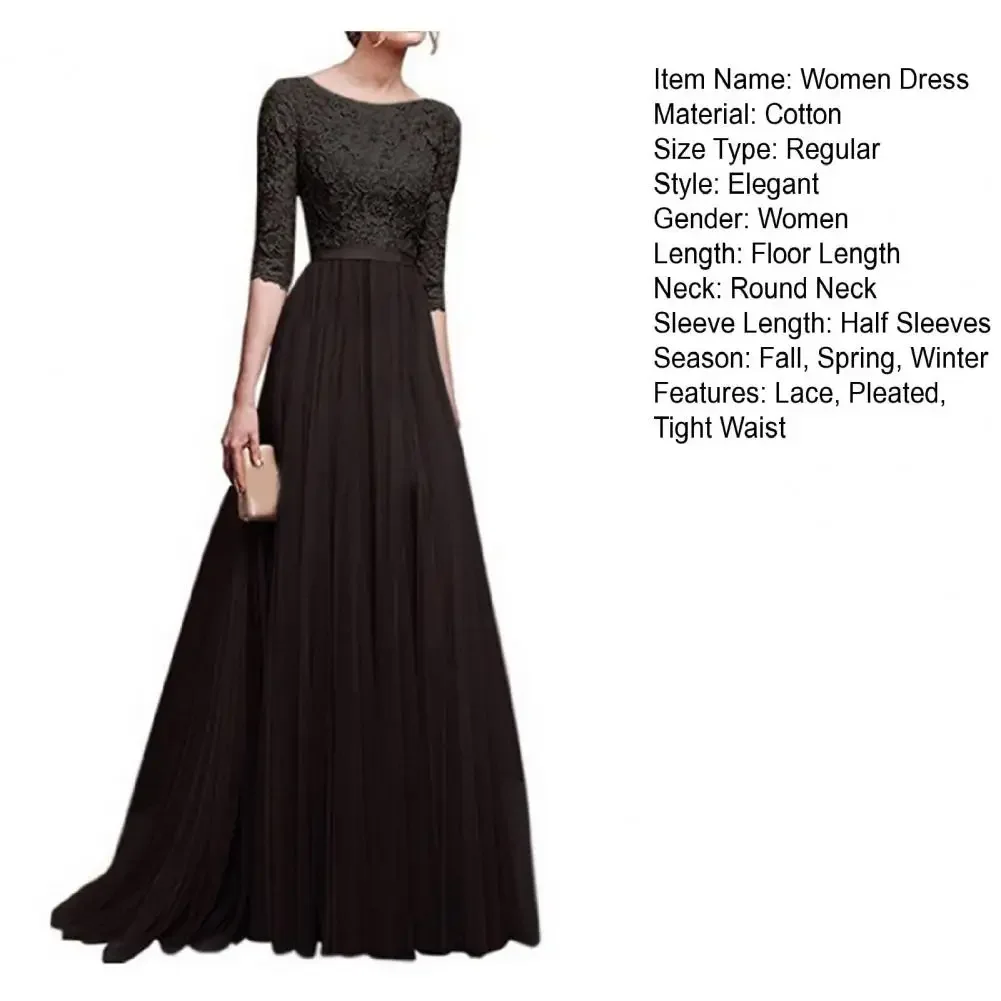 Women Prom Party Dress Round Neck Lace Flower Embroidery Half Sleeve Tight Waist Patchwork Floor Length Pleated Lady Fall Winter Maxi Evening Dress